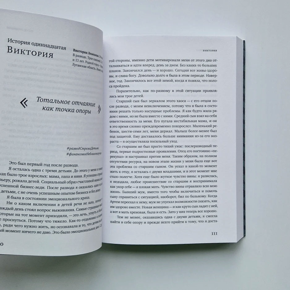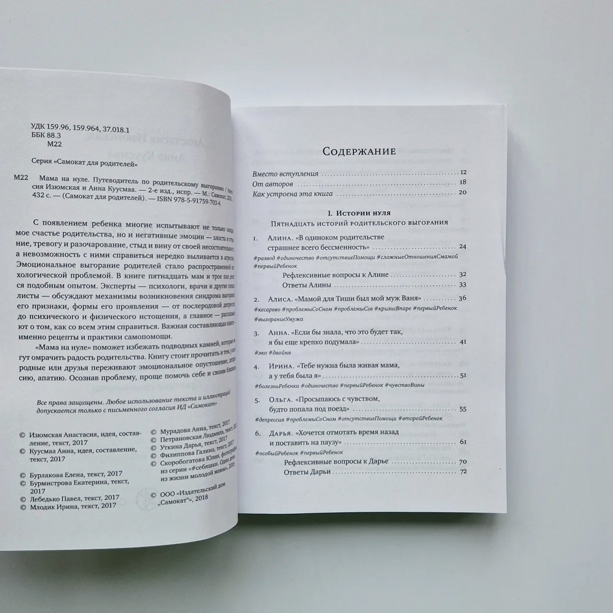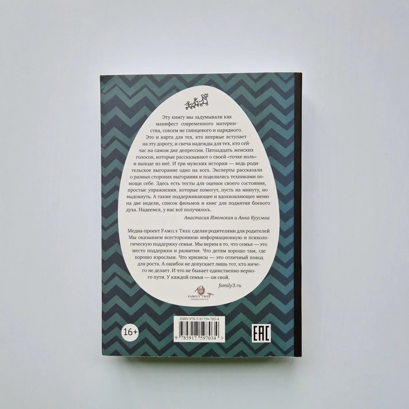 Анастасия Изюмская и Анна Куусмаа собрали в книге 15 разных историй, 15 женских голосов, которые рассказывают о своей "точке ноль" и выходе из неё, если он случился к моменту нашей беседы, и три мужских истории - от мужей героинь, которые решились на откровенность. А эксперты - Людмила Петрановская, Екатерина Бурмистрова, Ирина Млодик, Дарья Утина, Галина Филиппова рассказали в своих главах о разных гранях выгорания и депрессии, о переходе из состояния "до детей" в состояние "яжемать", о тех трансформациях, которые переживает душа и тело на этом пути.