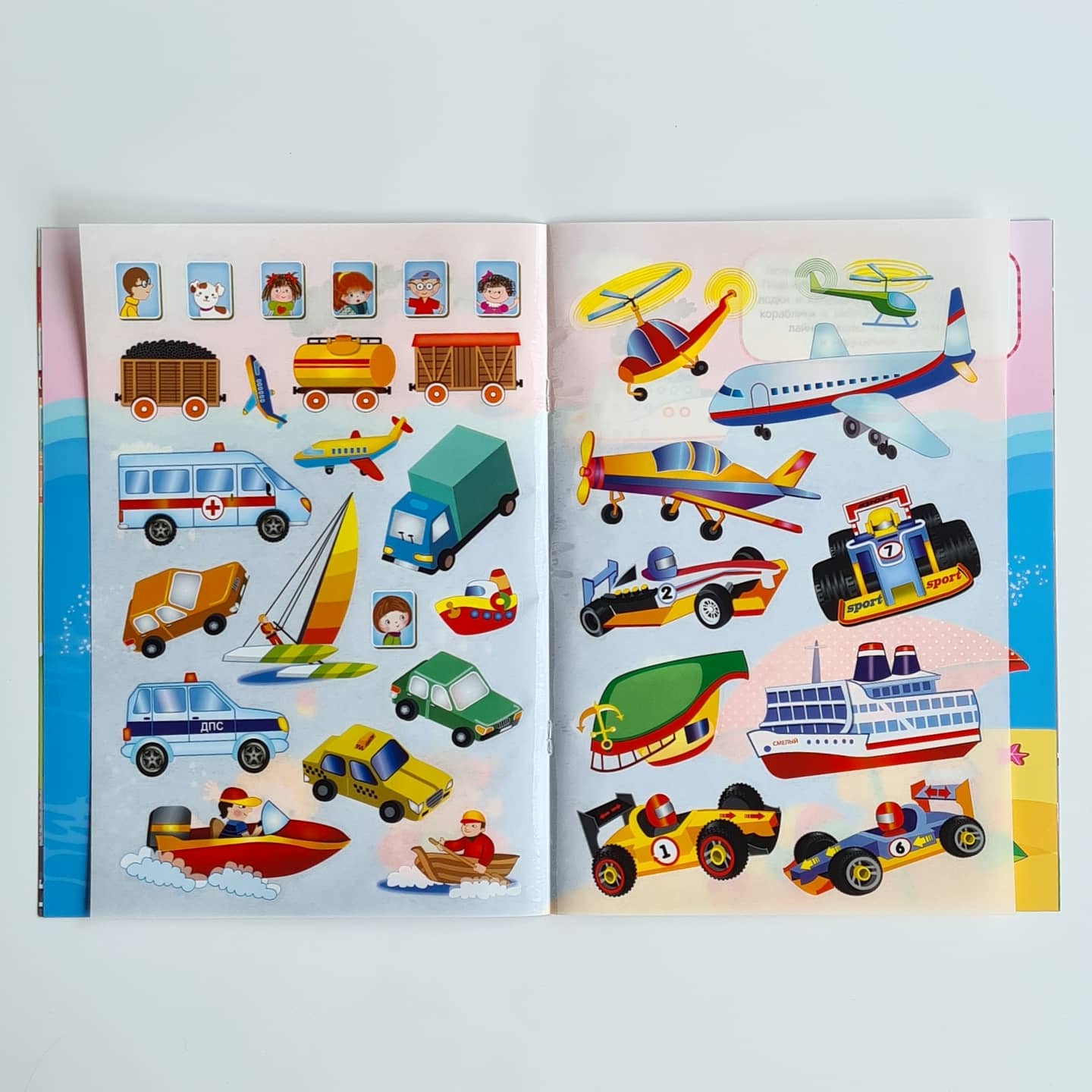 Поезда и электрички, катера и океанские лайнеры, самолёты и вертолёты, гоночные машины и спецтехника - скорее приклеивайте наклейки на странички!