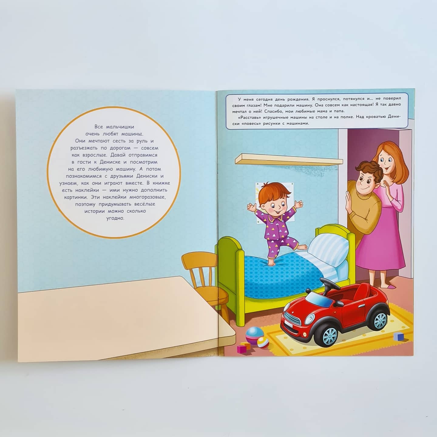 У Дениски день рождения - ему подарили большую машину. Теперь он катает на ней друзей, моет её и накачивает ей шины. Совсем как взрослый! Давай познакомимся с Дениской и поиграем с многоразовыми наклейками.