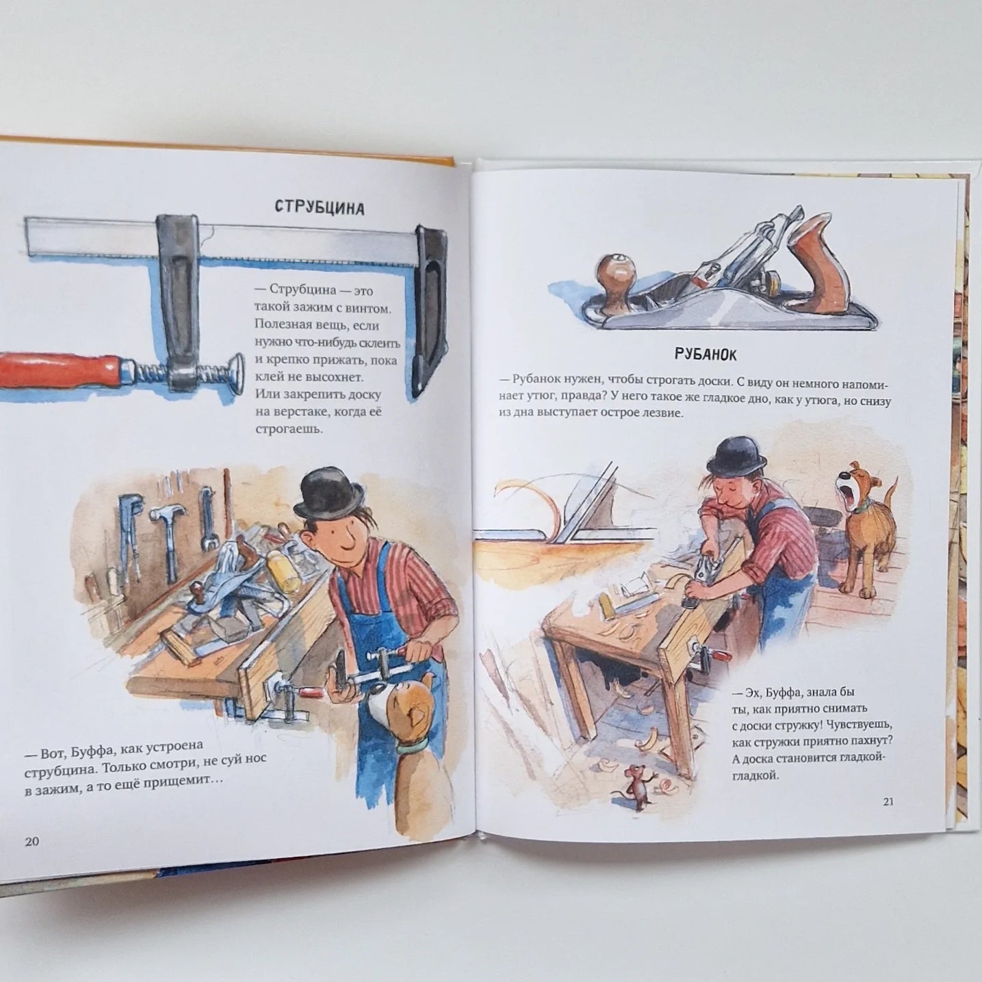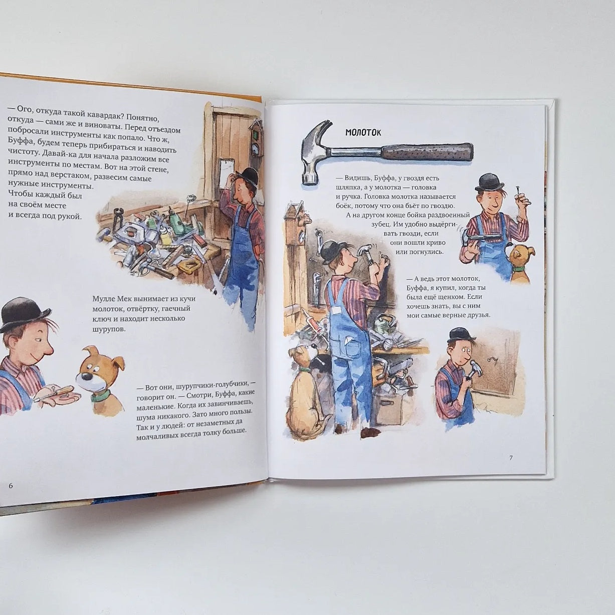 Теперь у читателей появилась возможность побывать в святая святых - столярной мастерской Мулле Мека. Мулле как раз наводит в ней порядок, развешивает над верстаком инструменты, раскладывает по коробочкам шурупы и гвозди, а заодно рассказывает читателям о том, какой инструмент как называется, для чего нужен и как устроен. Каков принцип работы рычага и клина, что такое шлиц и гарда, для чего нужен ватерпас - обо всём этом можно узнать из книги "Мулле Мек в мастерской".