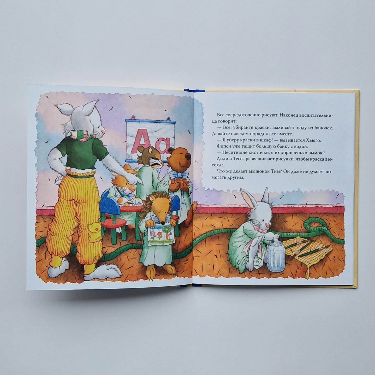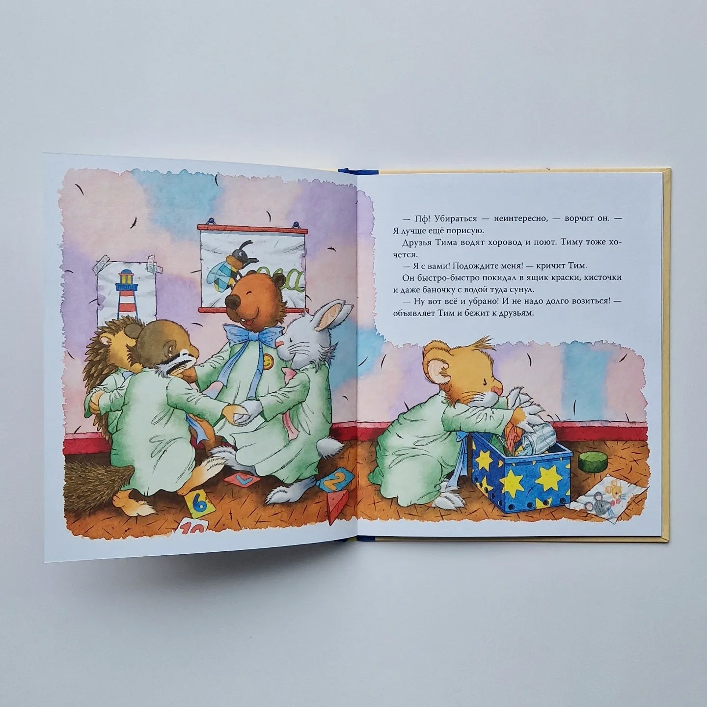 У мышонка Тима много игрушек. Поэтому, когда приходят друзья, никто не скучает. Вот только потом кто-то должен расставить все по своим местам… А Тим совсем не любит убираться. Зато любит рисовать акварелью! Мышонок как раз закончил чудесный рисунок для папы, только на него так невовремя опрокинулась баночка с водой. Тим забыл ее убрать… ой-ой-ой что же делать?!