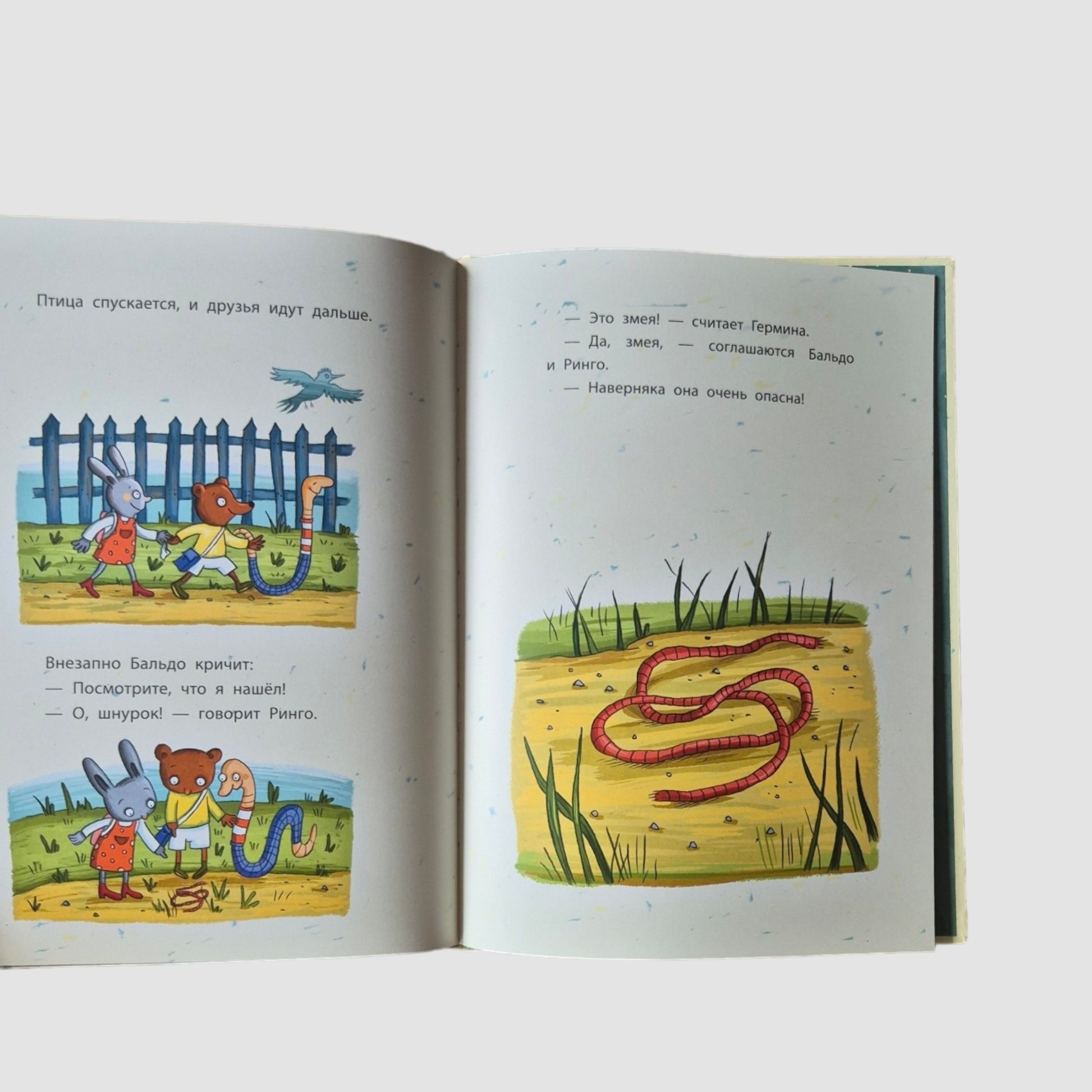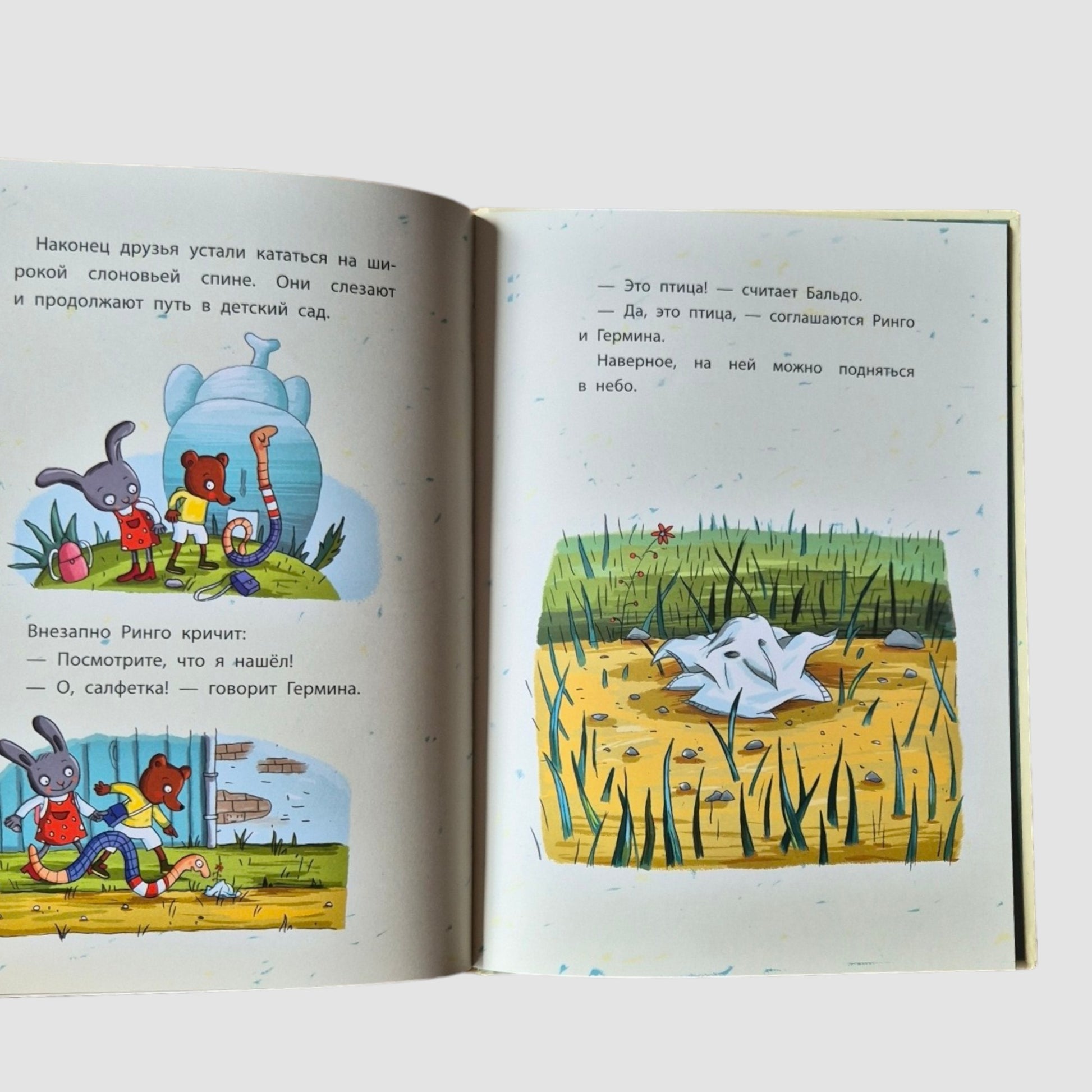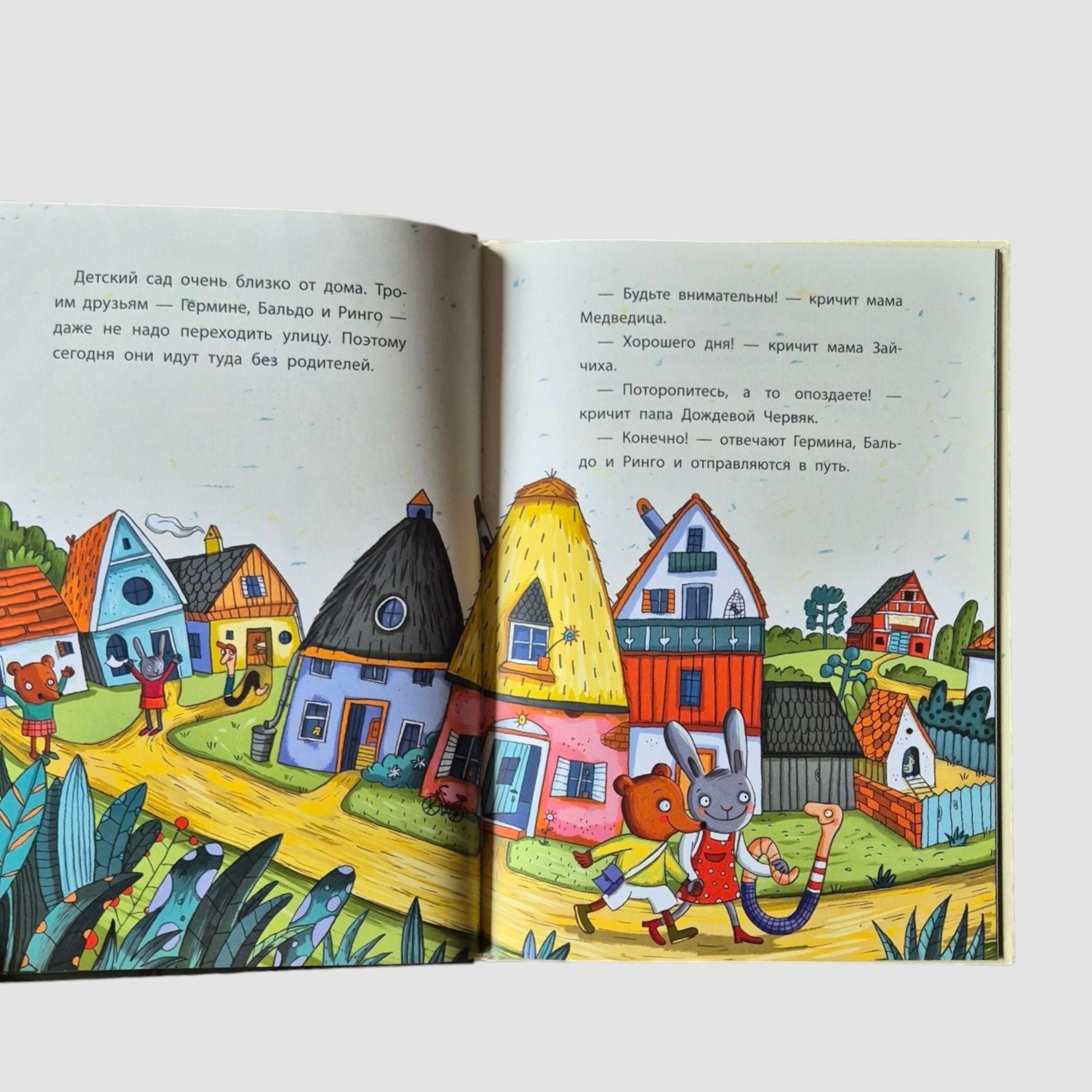 Однажды трое друзей - медвежонок Бальдо, червячок Ринго и зайчонок Гермина - отправились в детский сад одни. Садик очень близко от дома, им даже не придётся переходить дорогу. Но кто бы мог подумать, сколько всего необычного можно встретить по пути! Большой камень на самом деле оказывается слоном, который везёт друзей через джунгли. Смятая салфетка - огромная птица, на которой можно взлететь в небо. А вот эта старая прищепка - страшный крокодил…