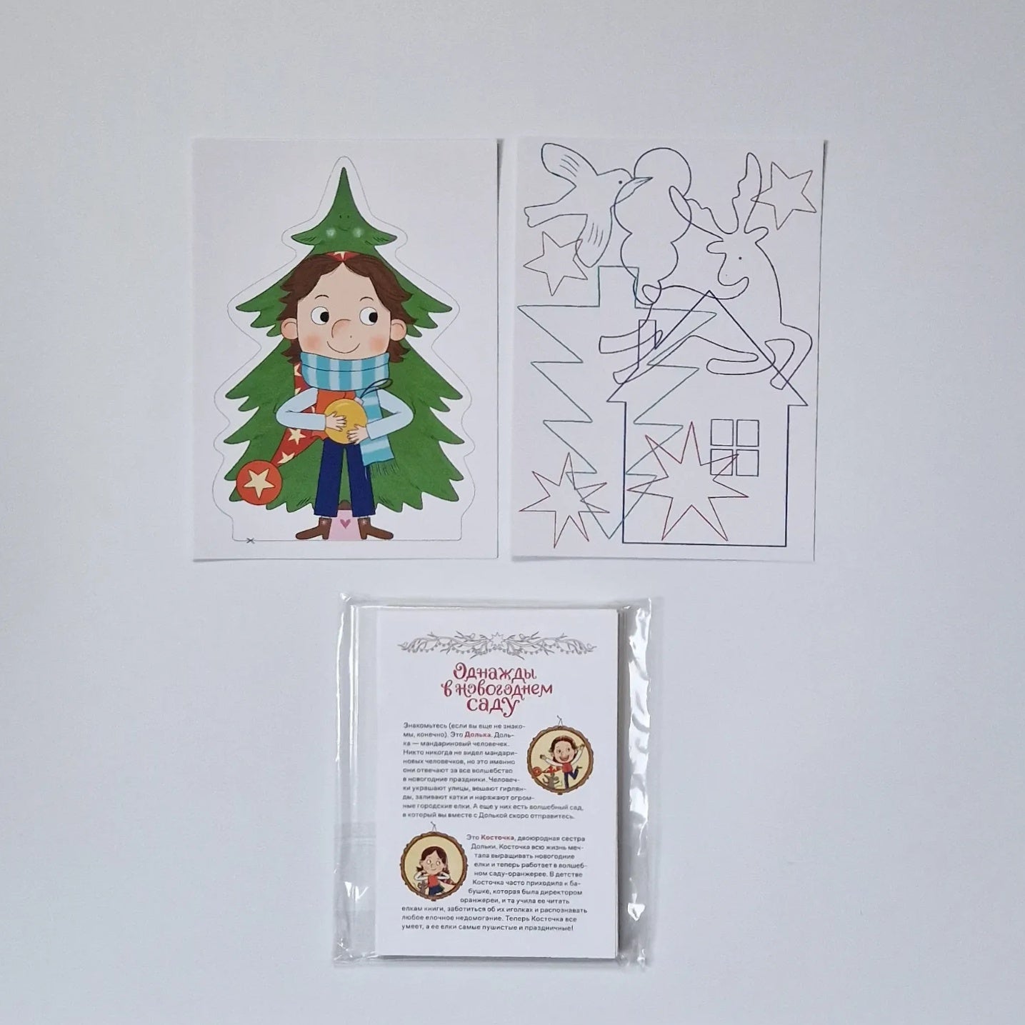 1. Вырежьте заранее человечка с елкой. Сделайте для него подставку-оригами из листа бумаги А4 (инструкцию к подставке вы найдете на карточке).