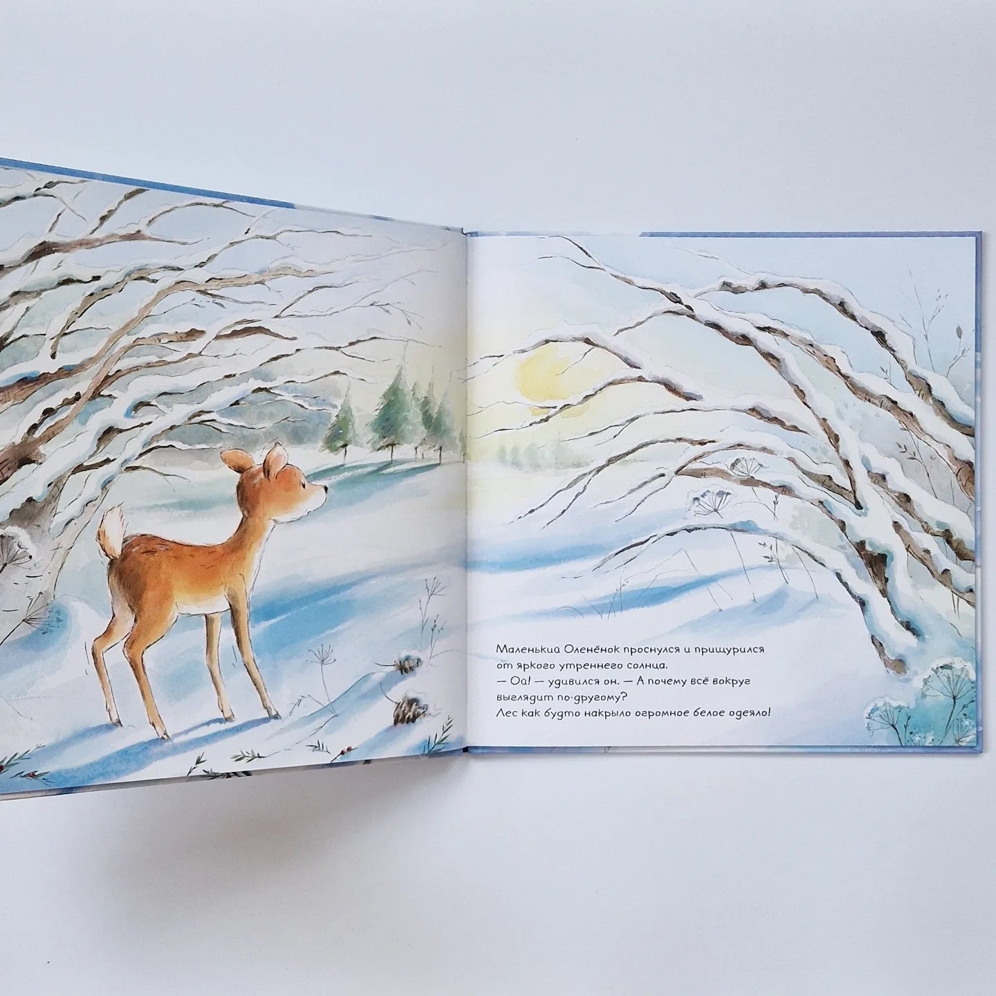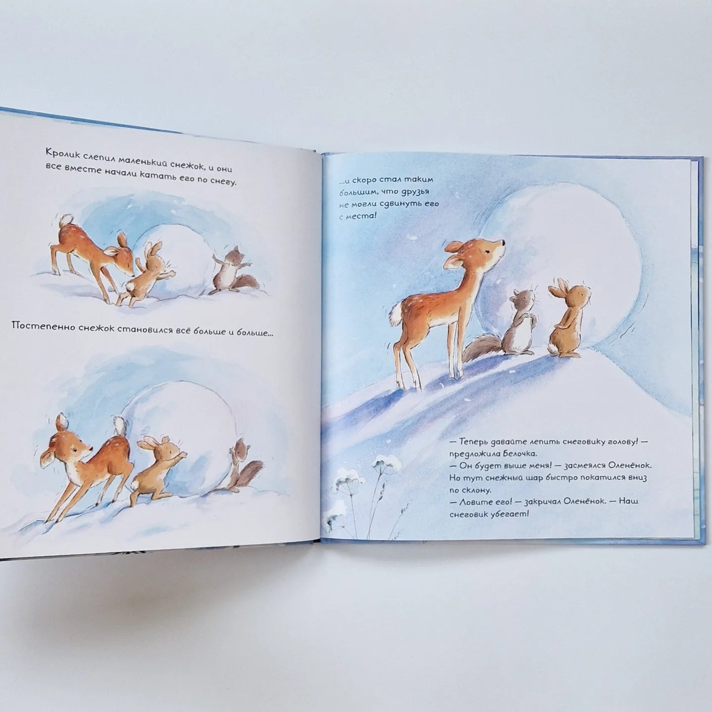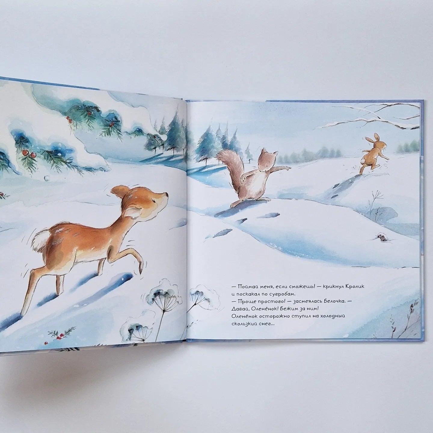 Наступила зима - и за одну ночь лес укрыло огромное снежное покрывало. Белочка и Кролик весело играют и резвятся, но Оленёнок встревожен: снег такой холодный и скользкий, и где же ему теперь найти травку на завтрак?..