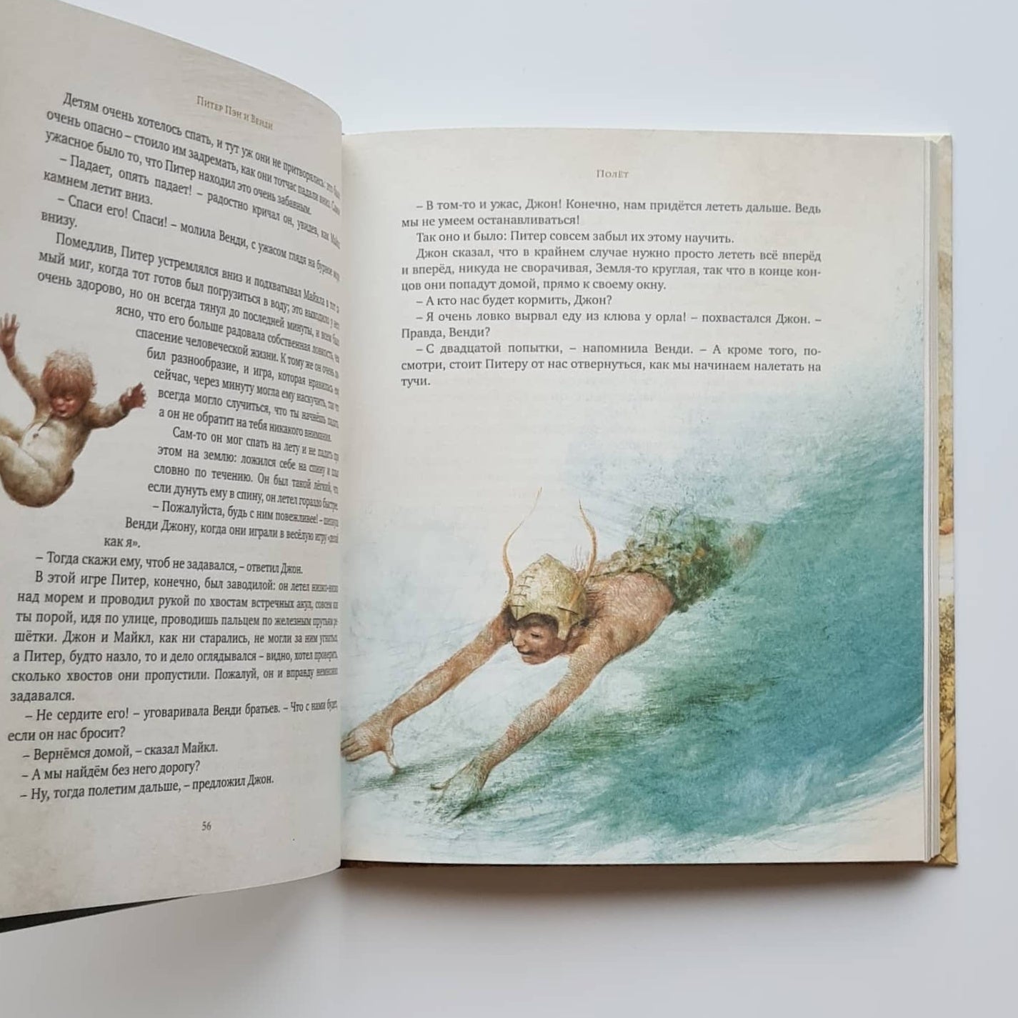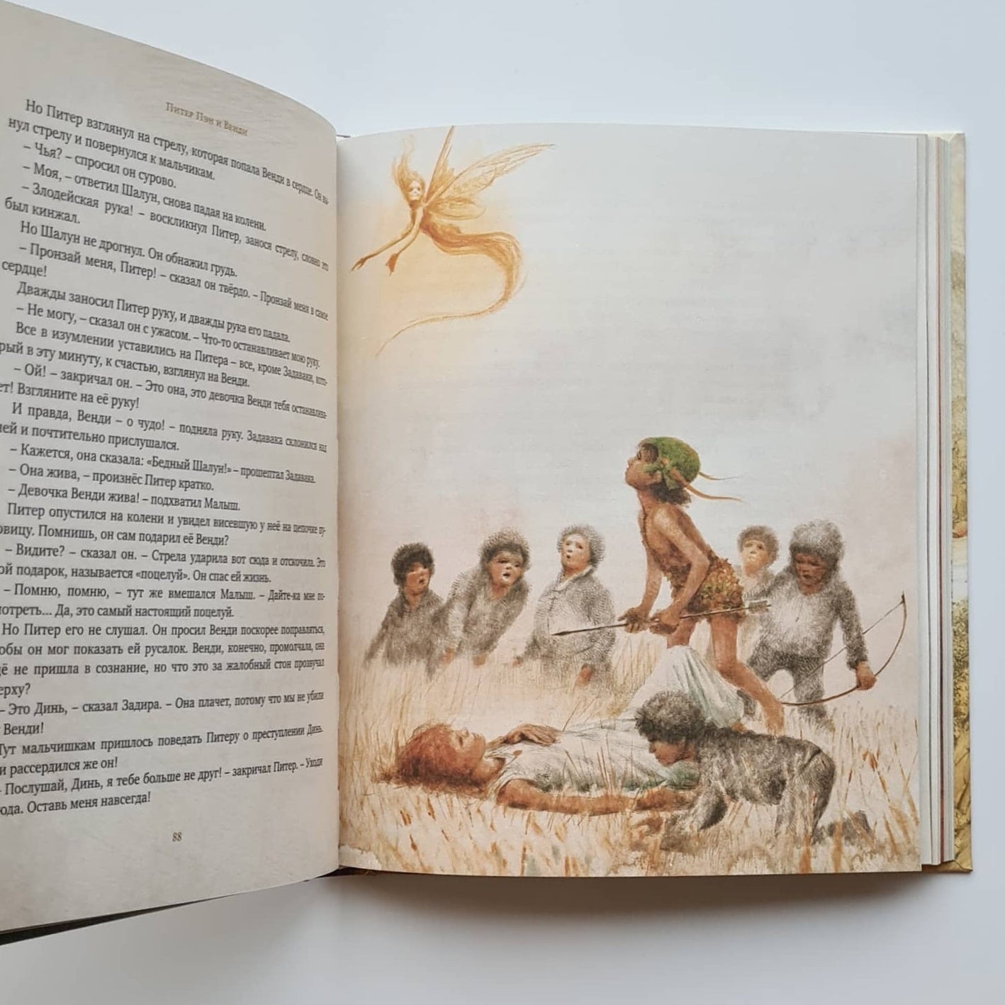 Удивительная история о сказочном мальчике, который не хотел взрослеть, давно поразила воображение детей и взрослых. Она началась с того, что однажды Питер Пэн влетел в окно детской в доме, где жили девочка Венди и двое её братьев. Вместе с Питером они отправились на далёкий волшебный остров. Там им встретились русалки, храбрые индейцы, озорная фея и даже пираты с их злобным главарём капитаном Крюком, судьба которого окажется в руках летающего мальчика. И тут героев ждут захватывающие приключения. Этой знаменитой книге особое очарование придают великолепные иллюстрации, созданные выдающимся художником к столетию первого издания "Питера Пэна".