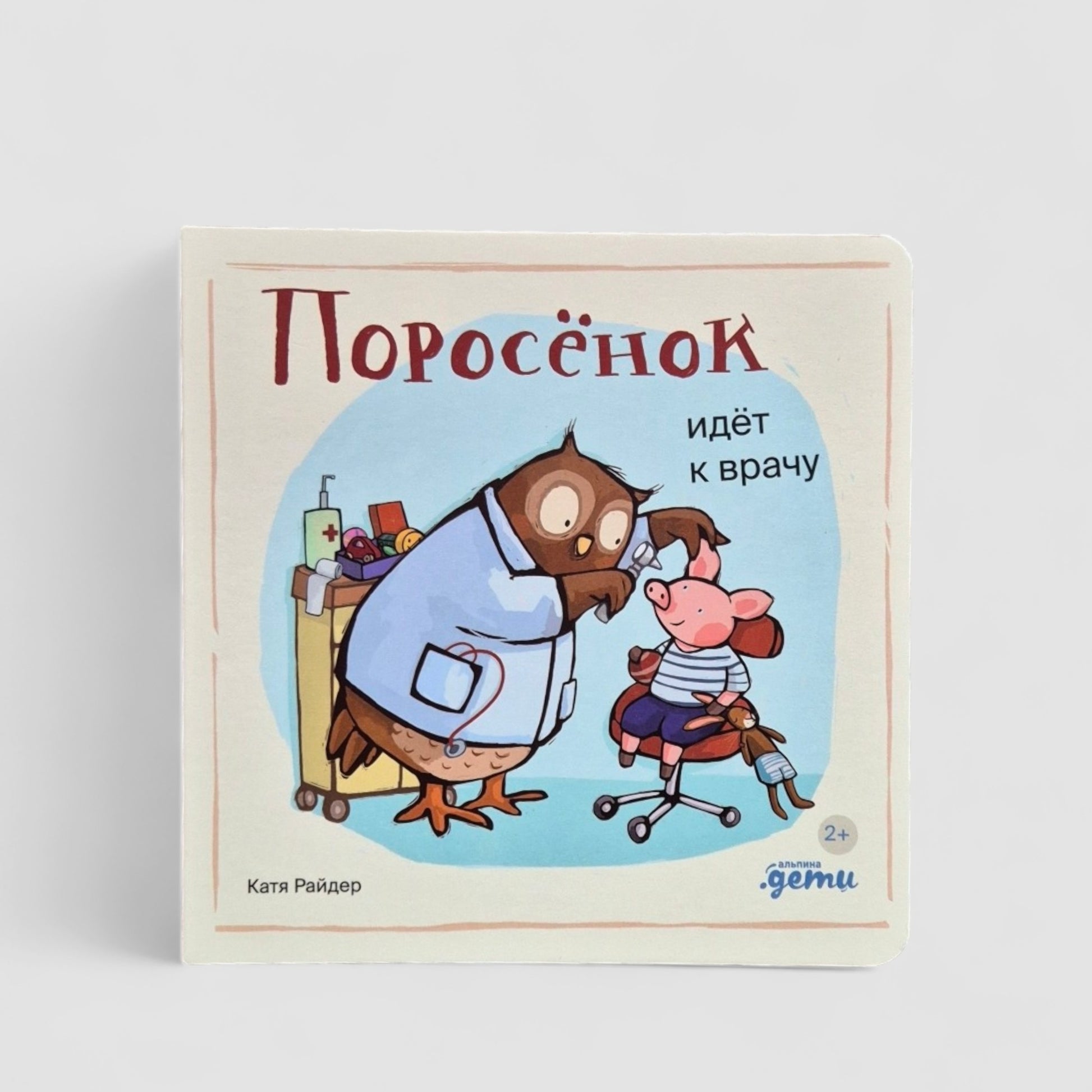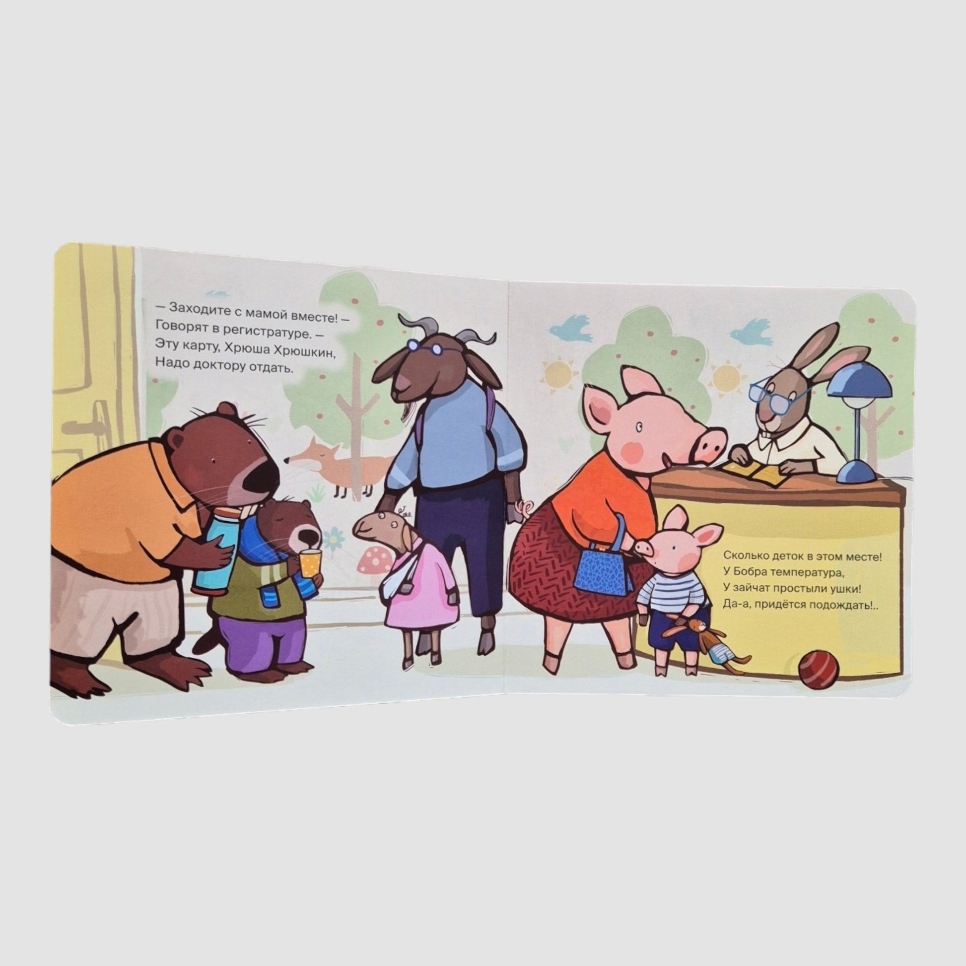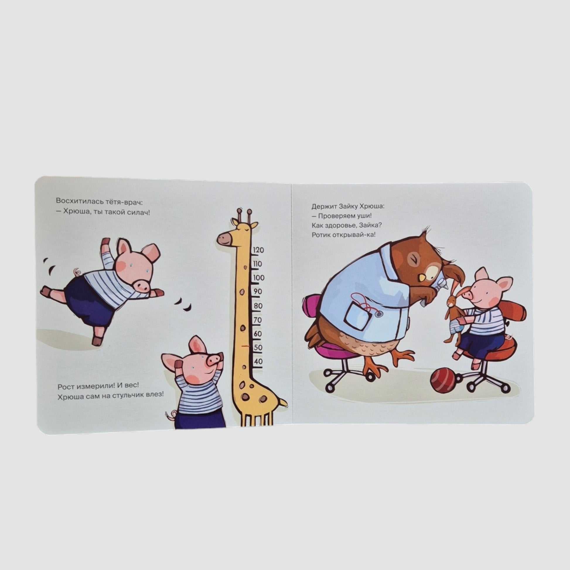 Сегодня Хрюша Хрюшкин идет на осмотр к врачу. Это совсем не страшно! Добрая тетя-доктор измерит его рост, проверит, как он бегает и прыгает, хорошо ли слышит и как видит. Ура! Хрюша успешно прошел осмотр и теперь готов сам стать врачом, чтобы вылечить все свои игрушки и даже маму!
