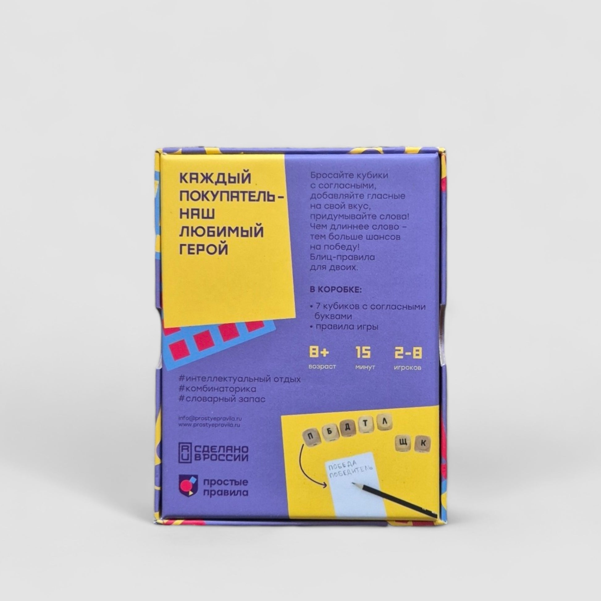 Бросаете кубики с согласными буквами и составляете слова. Гласные, а также твёрдый и мягкий знаки добавляете по своему усмотрению. Главное – успеть за 3 минуты найти как можно больше длинных слов. Чем больше букв в составленном слове, тем больше очков оно принесёт!