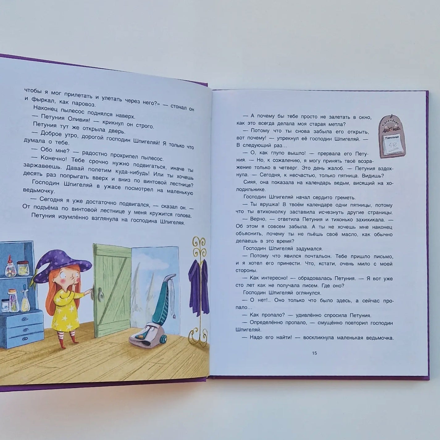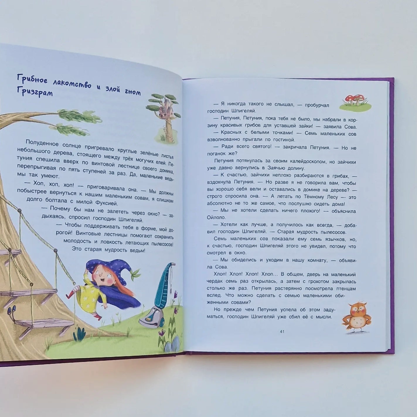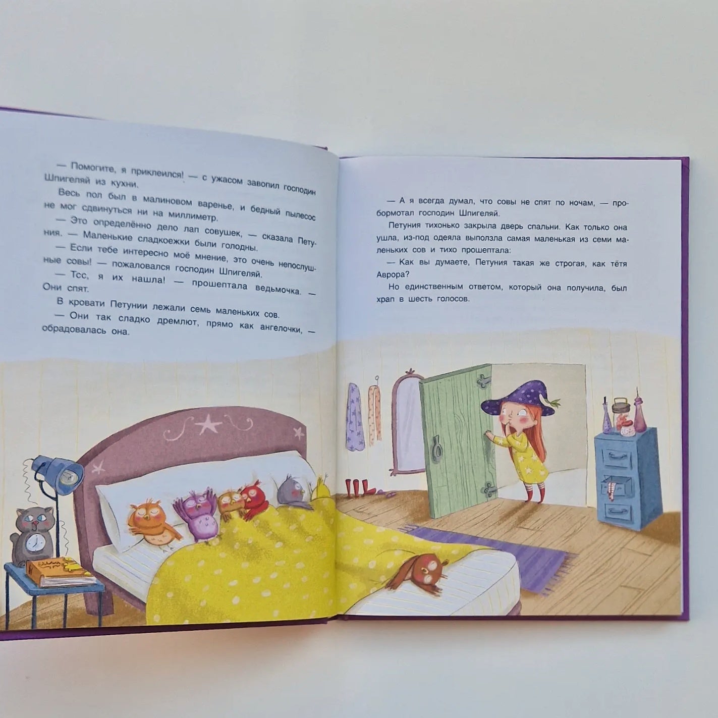 Знакомьтесь, это маленькая ведьма Петуния Оливия фон Надельбаум из не очень зловещего Тёмного Леса. Однажды в её домике на дереве появляются семь маленьких сов. А вместе с ними - письмо от могущественной ведьмы, тёти Авроры. В нём говорится, что если Петуния сумеет сделать из семи сопливых клювиков воспитанных особ, то получит диплом Повелительницы сов - а это очень, очень почётно!