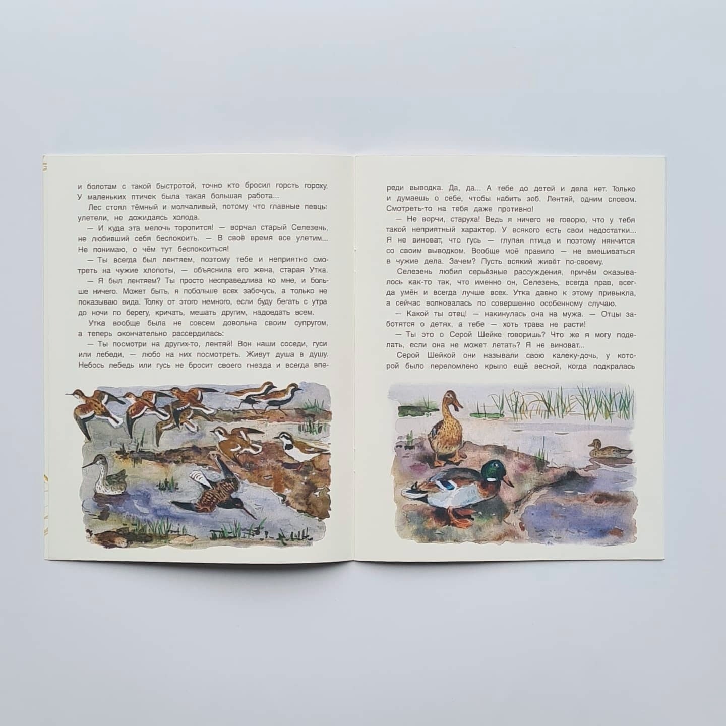 Серой Шейке предстоит провести холодную зиму совсем одной. Все её сородичи улетели в тёплые края. Но она не отчаивается и даже находит друга - Зайца. Всё бы ничего, но только к реке начала приходить Лиса… Сможет ли уточка со сломанным крылышком спастись от коварной Лисы? Любимую многими сказку проиллюстрировал художник, тонко чувствующий и понимающий природу, - Георгий Никольский.