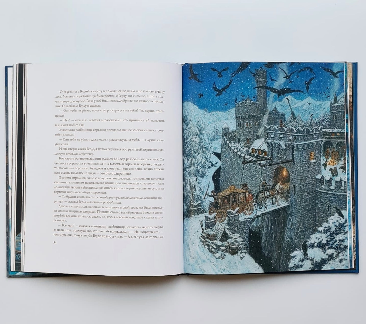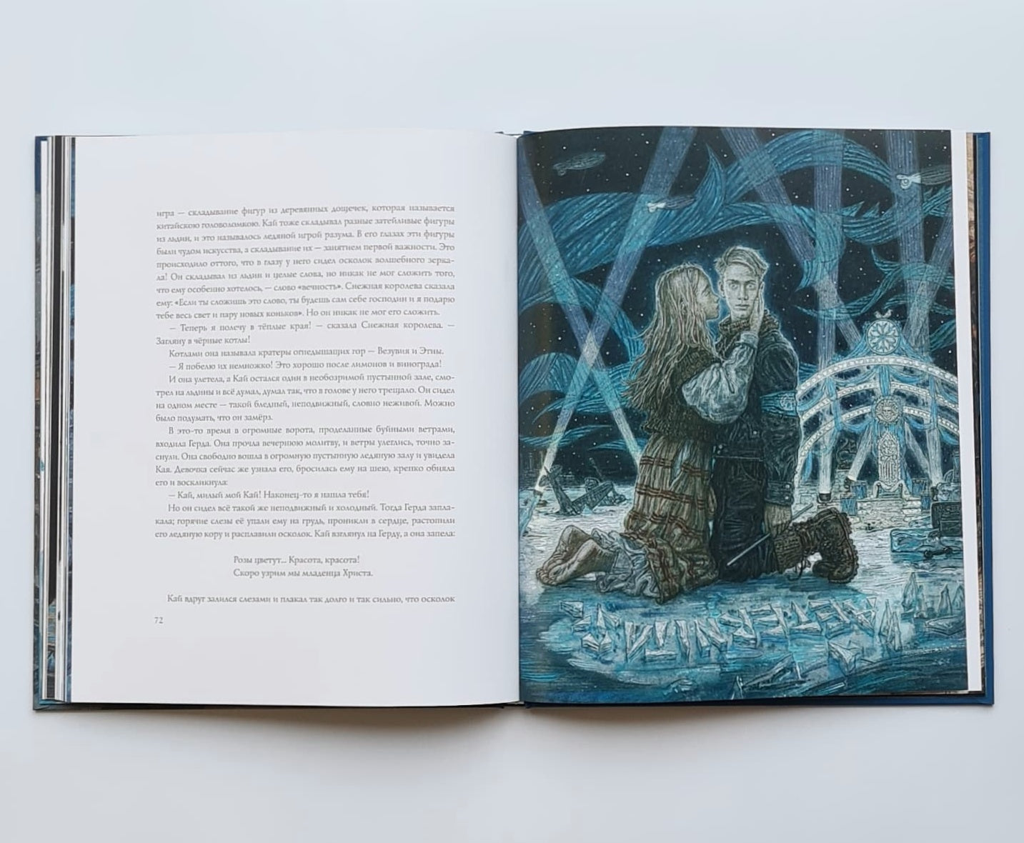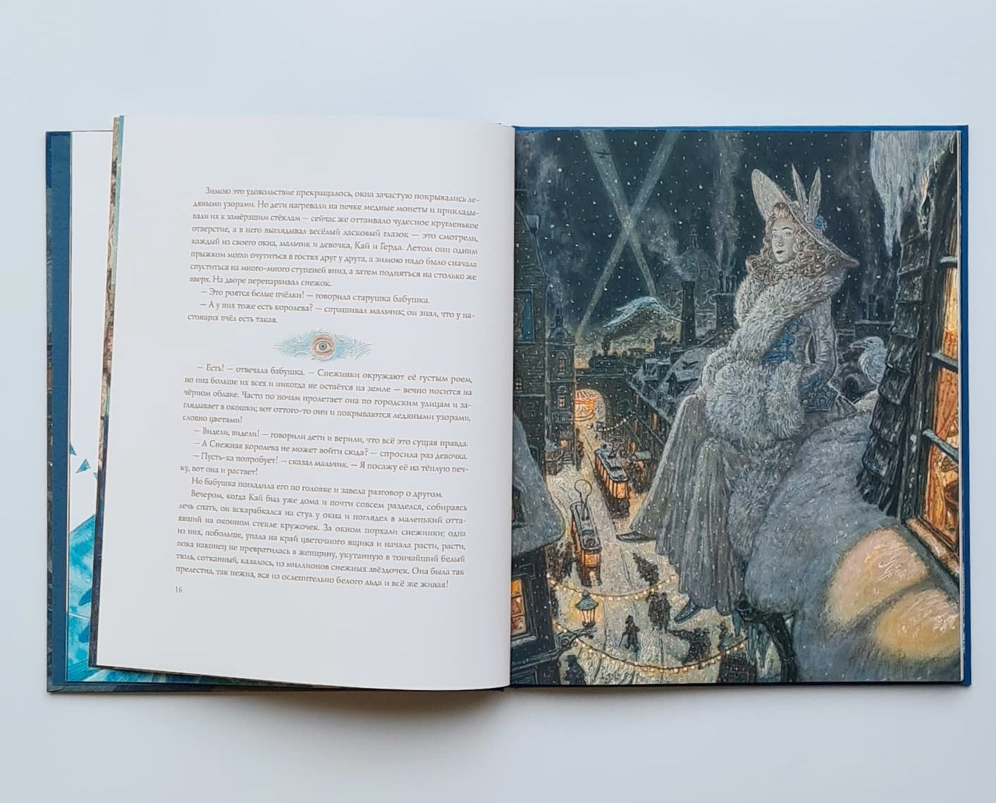 «Снежная королева» — одна из самых известных в мире сказок, вдохновлявшая многих художников. Услышав её название, невольно представляешь старинный датский городок в канун Рождества, падающий снег, сани Снежной королевы, уносящие Кая на Северный полюс… Всё это — сложившийся иллюстративный канон. Однако художник Антон Ломаев предлагает своё виденье известной сказки, перенося её действие в ХХ век. Это столетие — сложное, ужасное и прекрасное — стало испытанием на прочность для многого, что казалось людям незыблемым. В таком преломлении сказка Андерсена звучит совсем иначе, заставляя читателя заново всмотреться в знакомый сюжет. И убедиться, что он не теряет актуальности, завораживающими словами великого сказочника повествуя о непреходящих ценностях — вере, надежде и любви.