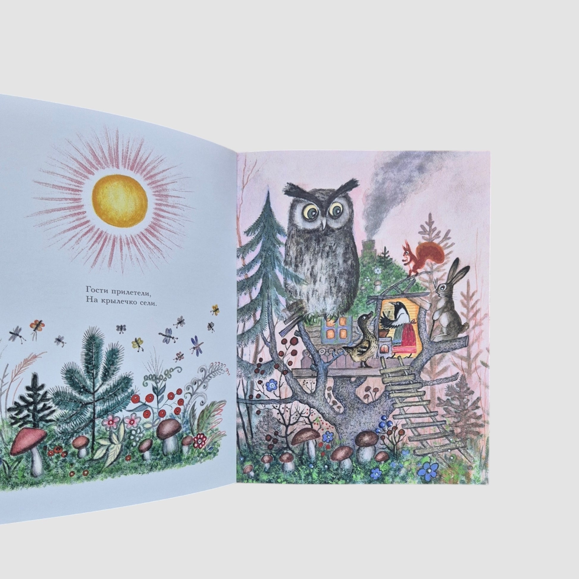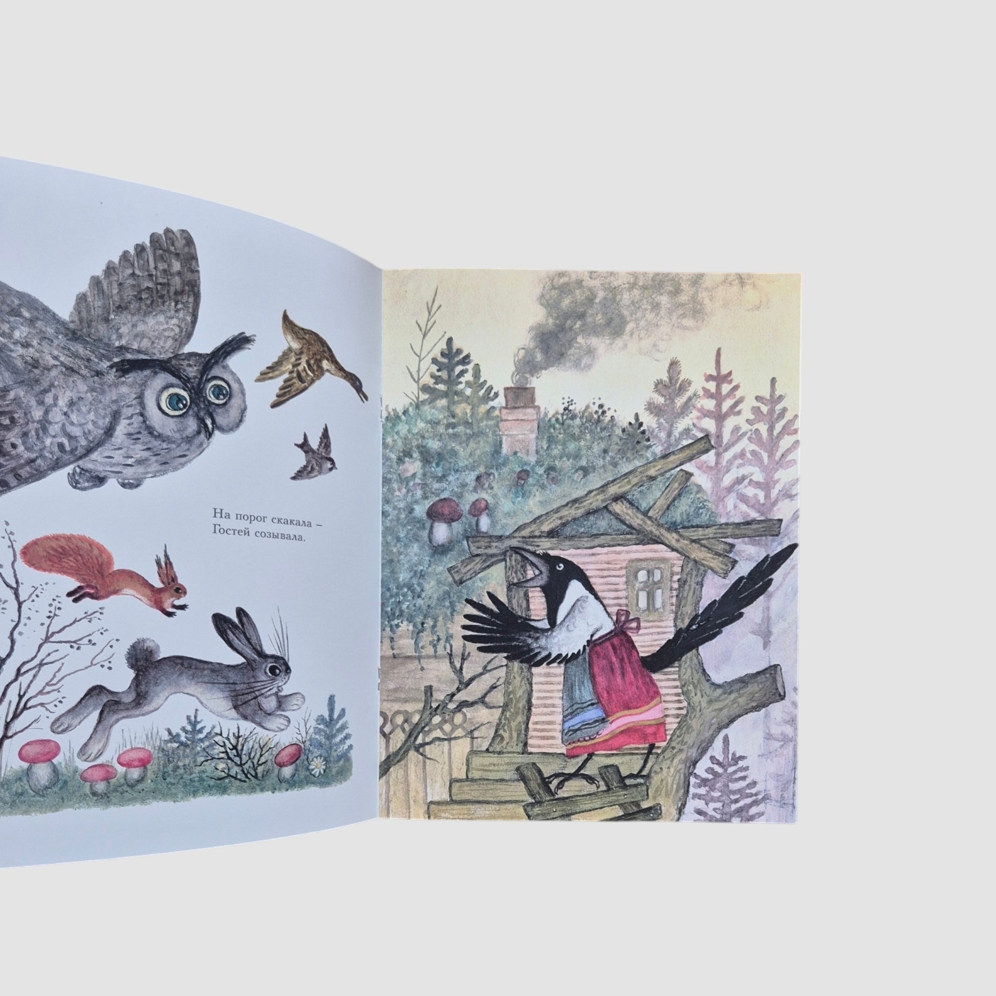 Потешку про сороку-белобоку с рисунками величайшего мастера детской иллюстрации Юрия Васнецова рассказывают и показывают самым маленьким читателям. Деловитая сорока в юбке с передником, с посохом и узелком ходит по лесу, хлопочет по дому и приглашает к себе гостей: сову, воробья, белочку, зайчика, утку и мышат. Кому же она не даст каши?