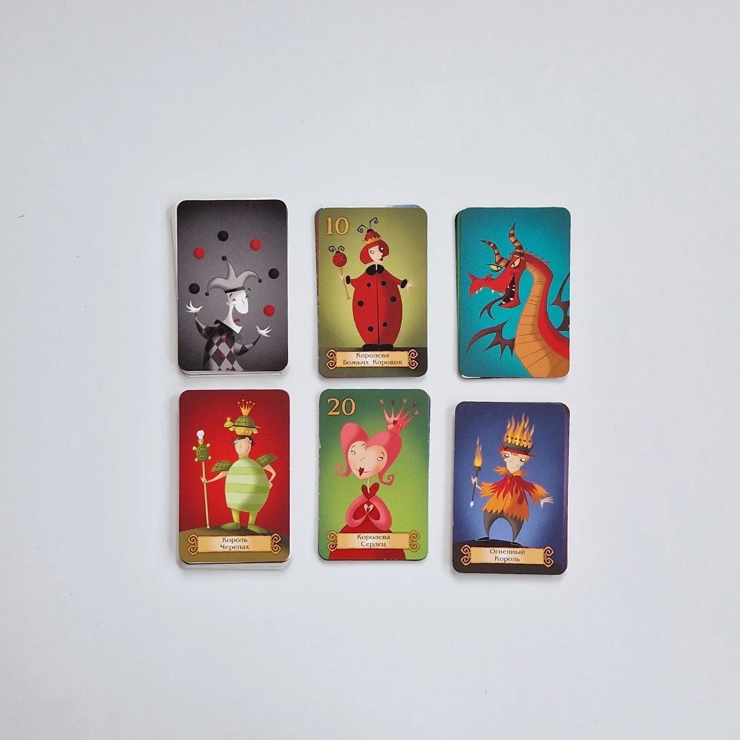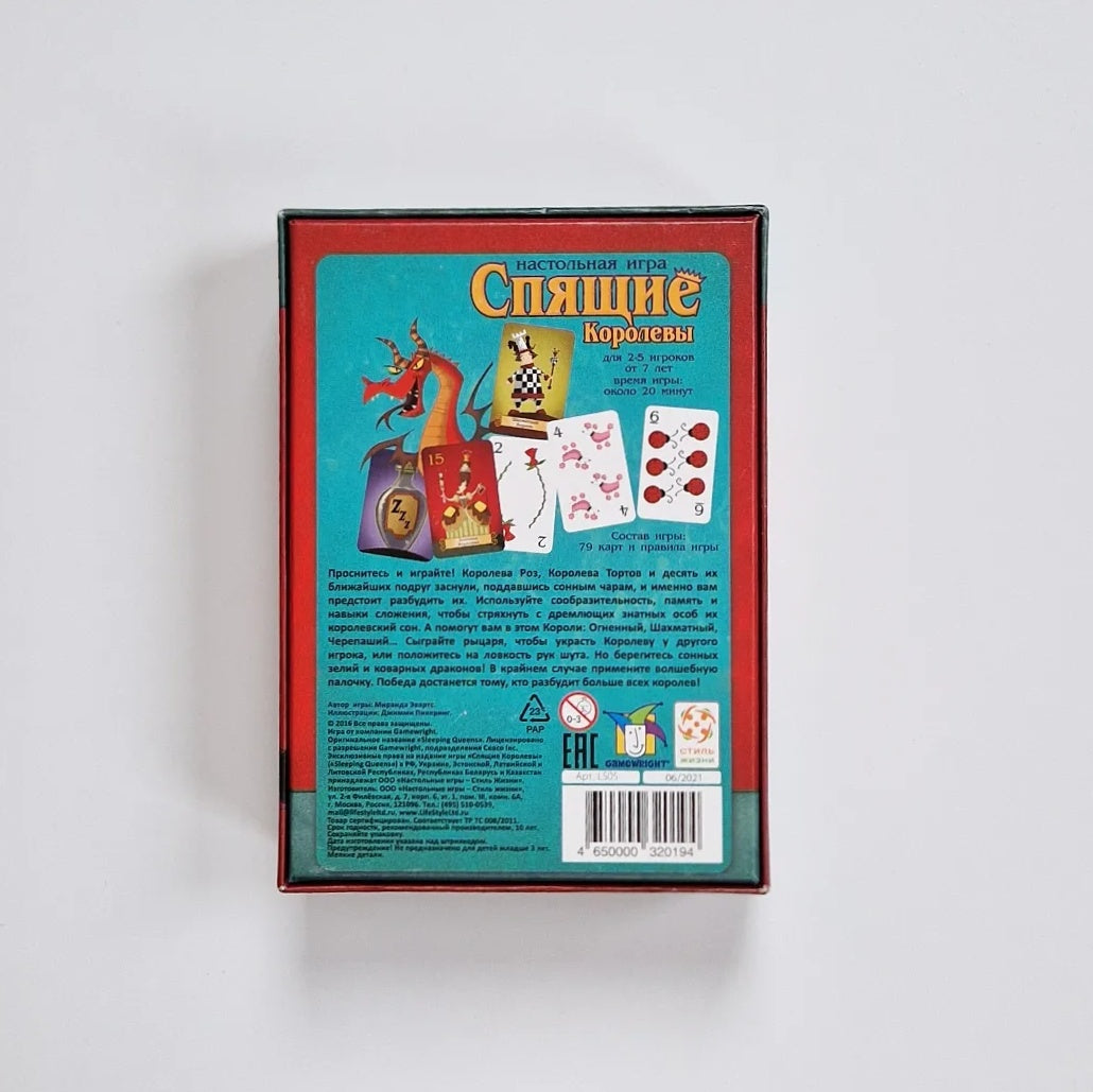 В состав настольной игры входят: 79 карт (12 карт королев, 8 королей, 5 шутов, 4 рыцаря, 4 сонных зелья, 3 волшебные палочки, 3 дракона, 40 карт с цифрами от 1 до 10), правила игры.