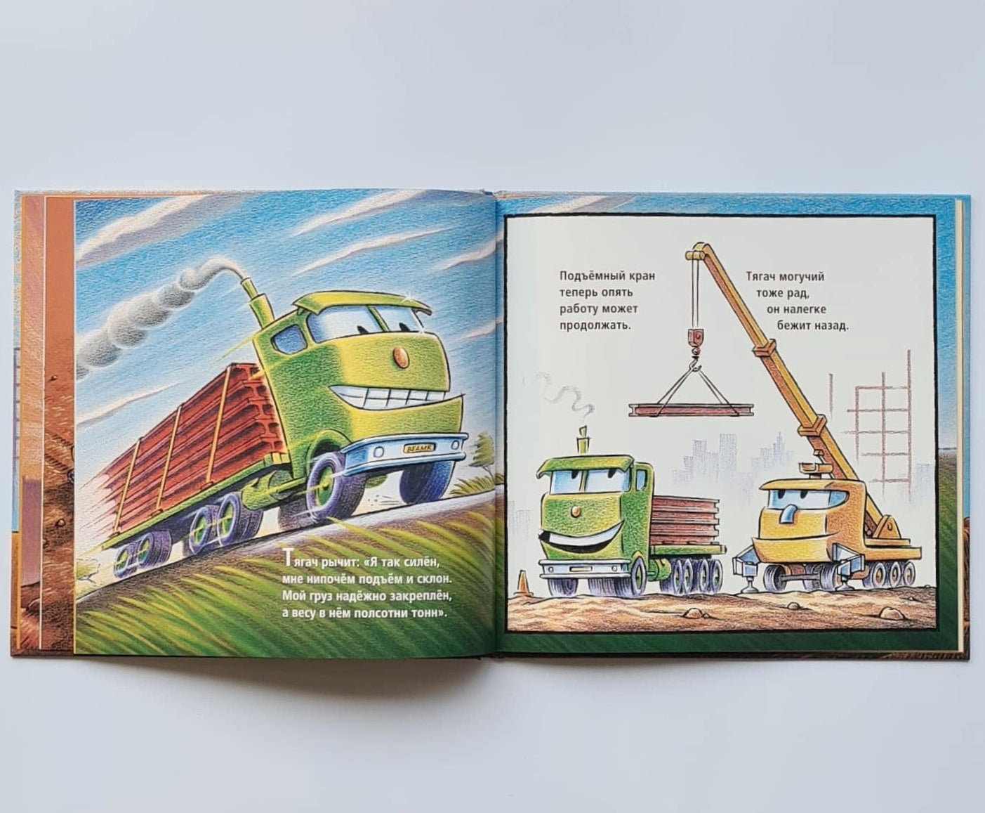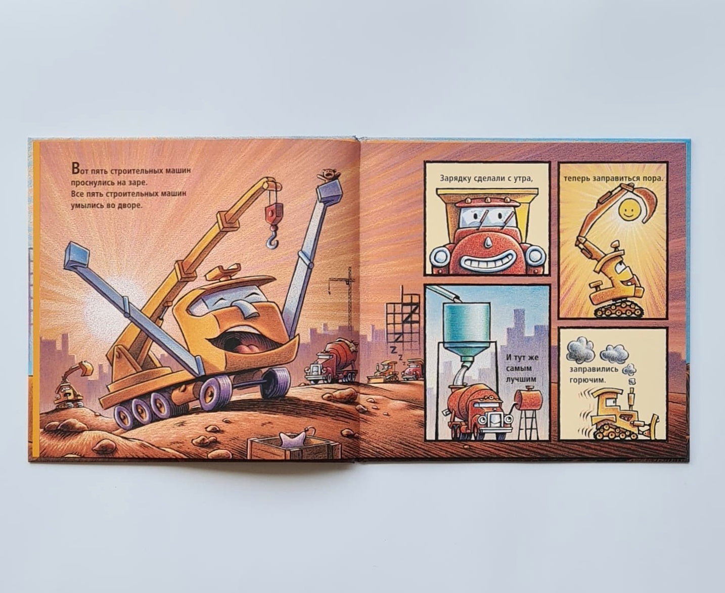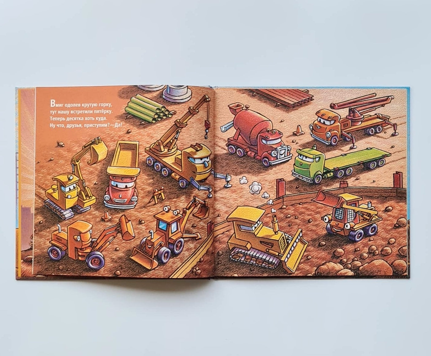 Любимые герои из книжки "Стройка, баюшки-баю" - пять строительных машин - проснулись. Их ждет интересная и сложная работа на стройплощадке. Но одним им не справится. Они зовут на помощь строительную бригаду. "Теперь десятка хоть куда. Ну что друзья, приступим? - Да!"