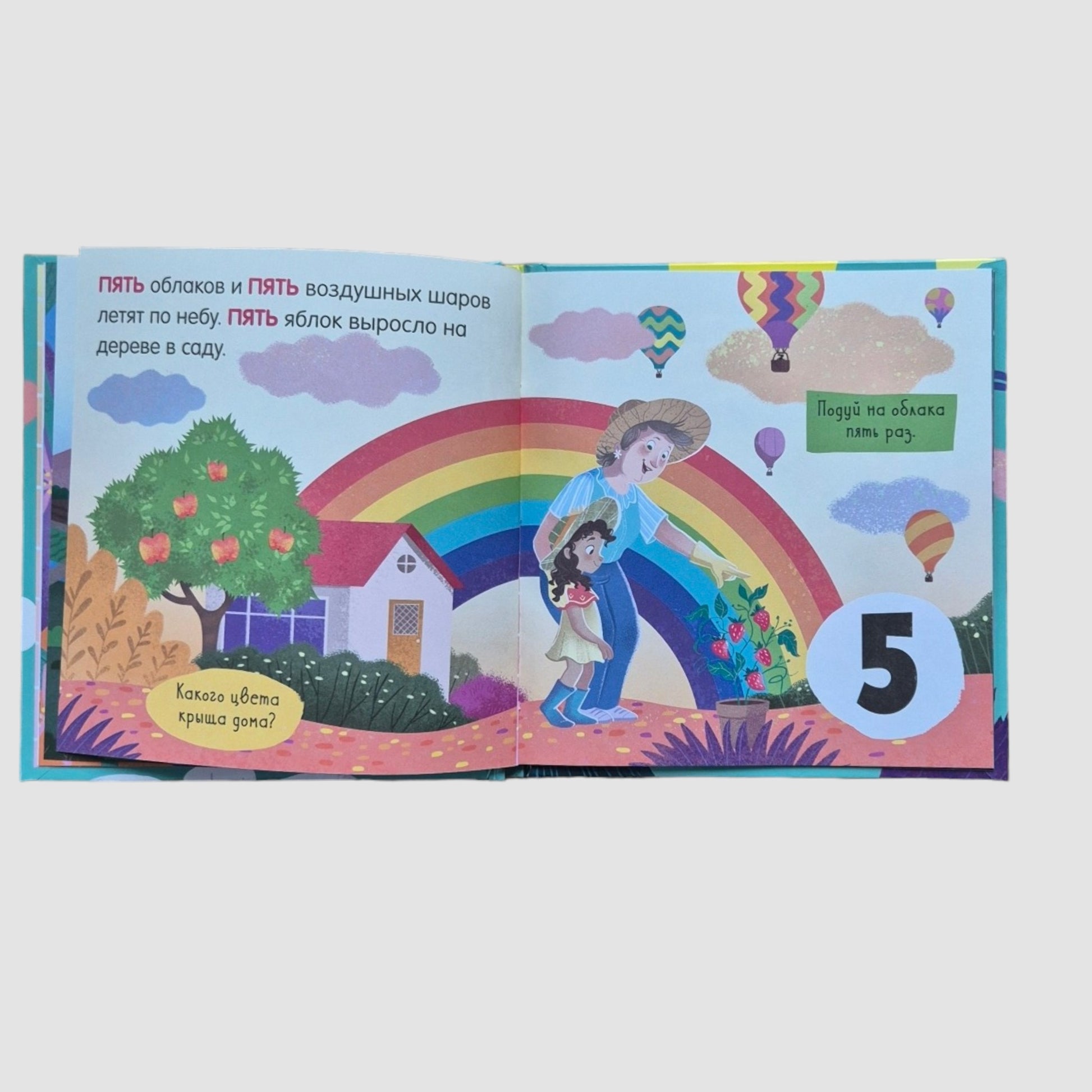 На каждом развороте — свой небольшой сюжет и картинка, на которой нужно сосчитать указанные объекты и выполнить задание: пять раз подуть на облако или семь раз хлопнуть в ладоши.