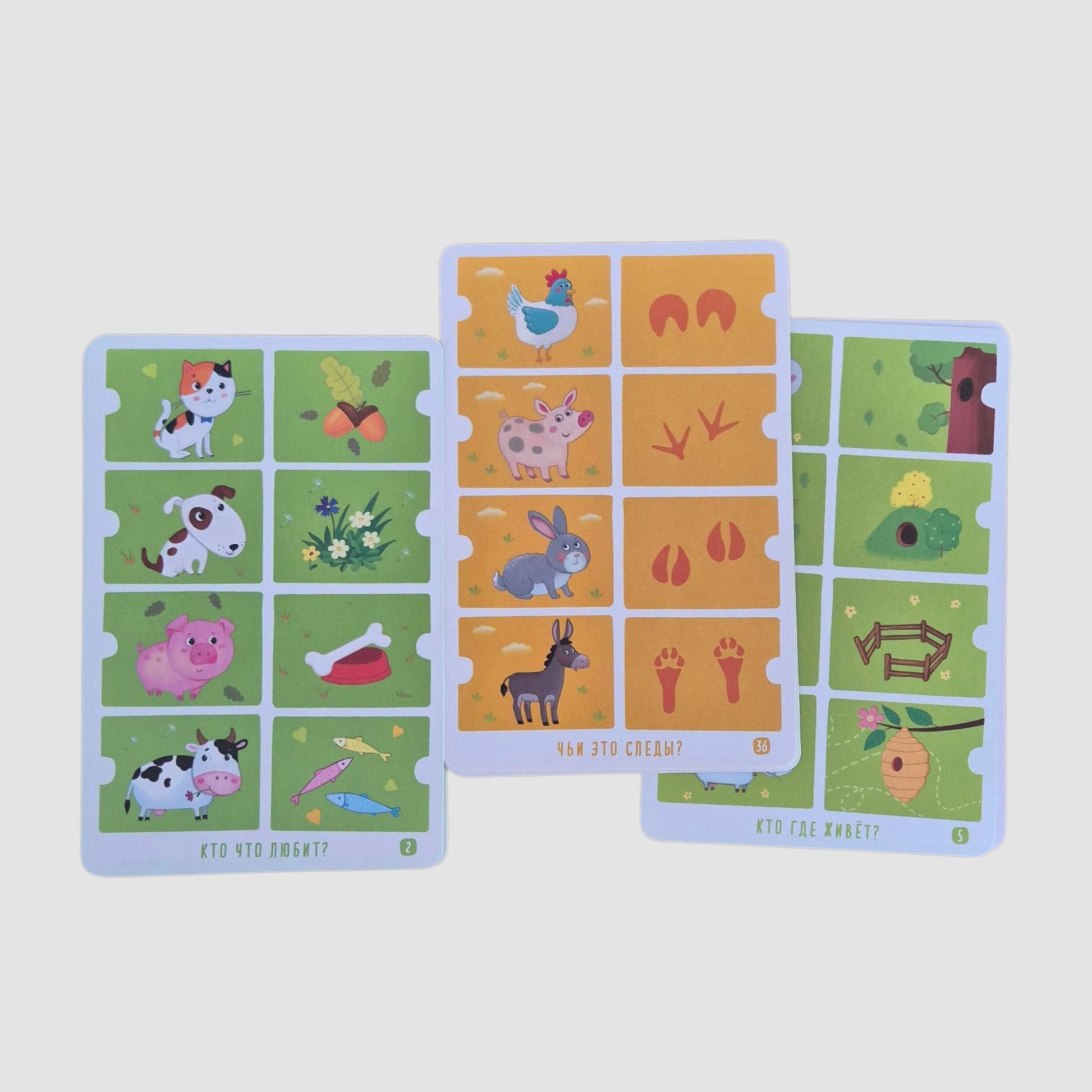В комплект входят 36 карточек. Выполняя задания, ребёнок будет знакомиться с животным миром, сравнивать, анализировать, искать логические связи, развивать мышление и тренировать мелкую моторику.