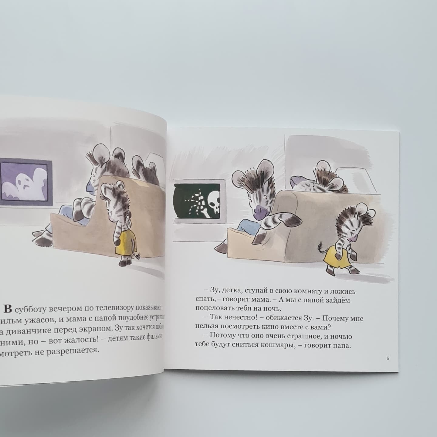 Однажды вечером по телевизору показывают фильм ужасов, но родители не разрешают зебренку по имени Зу его смотреть – вдруг их малыш испугается? Но Зу твердо знает, что он ничего не боится, и решает сам напугать родителей, нарядившись привидением. Он накидывает на голову простыню с дыркой посередине и осторожно крадется по темному коридору в гостиную, где сидят родители. Мама и папа, разумеется, «очень» пугаются и скорее бегут прятаться в дальний конец квартиры. Зу остается один в пустой комнате и вот тут-то ему становится по-настоящему страшно. Главное – не подавать виду…