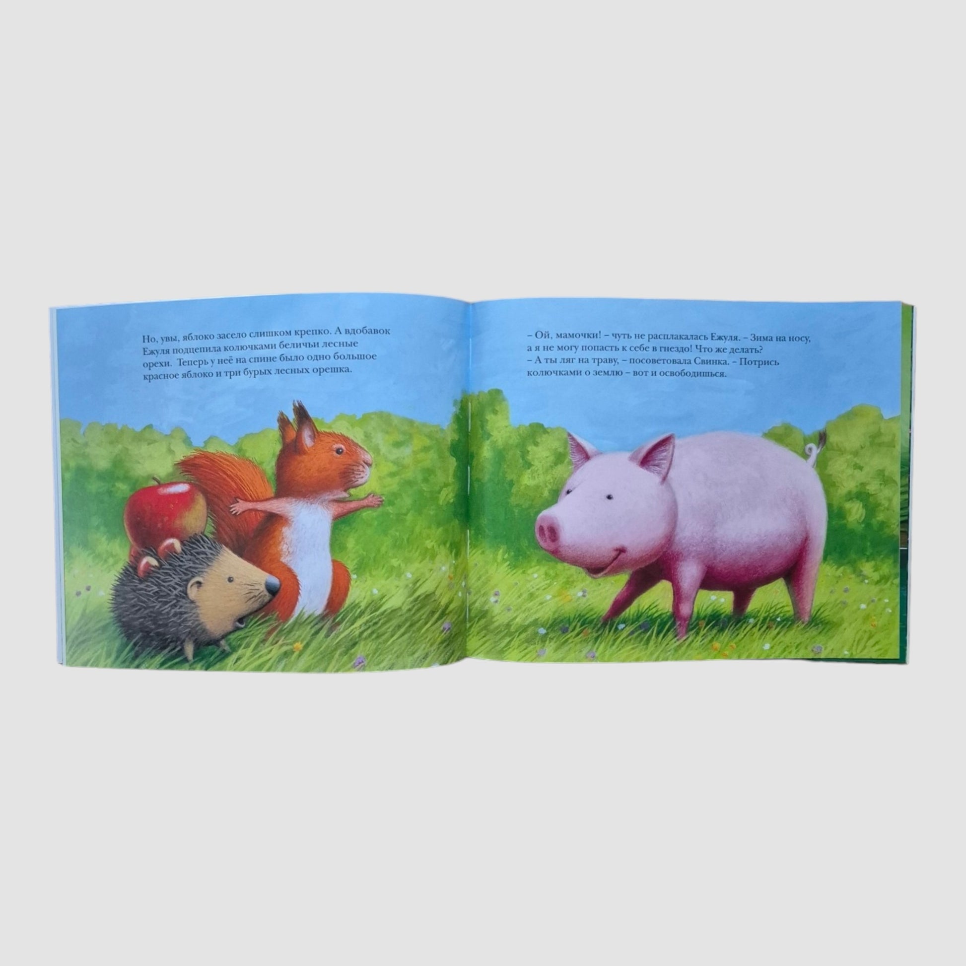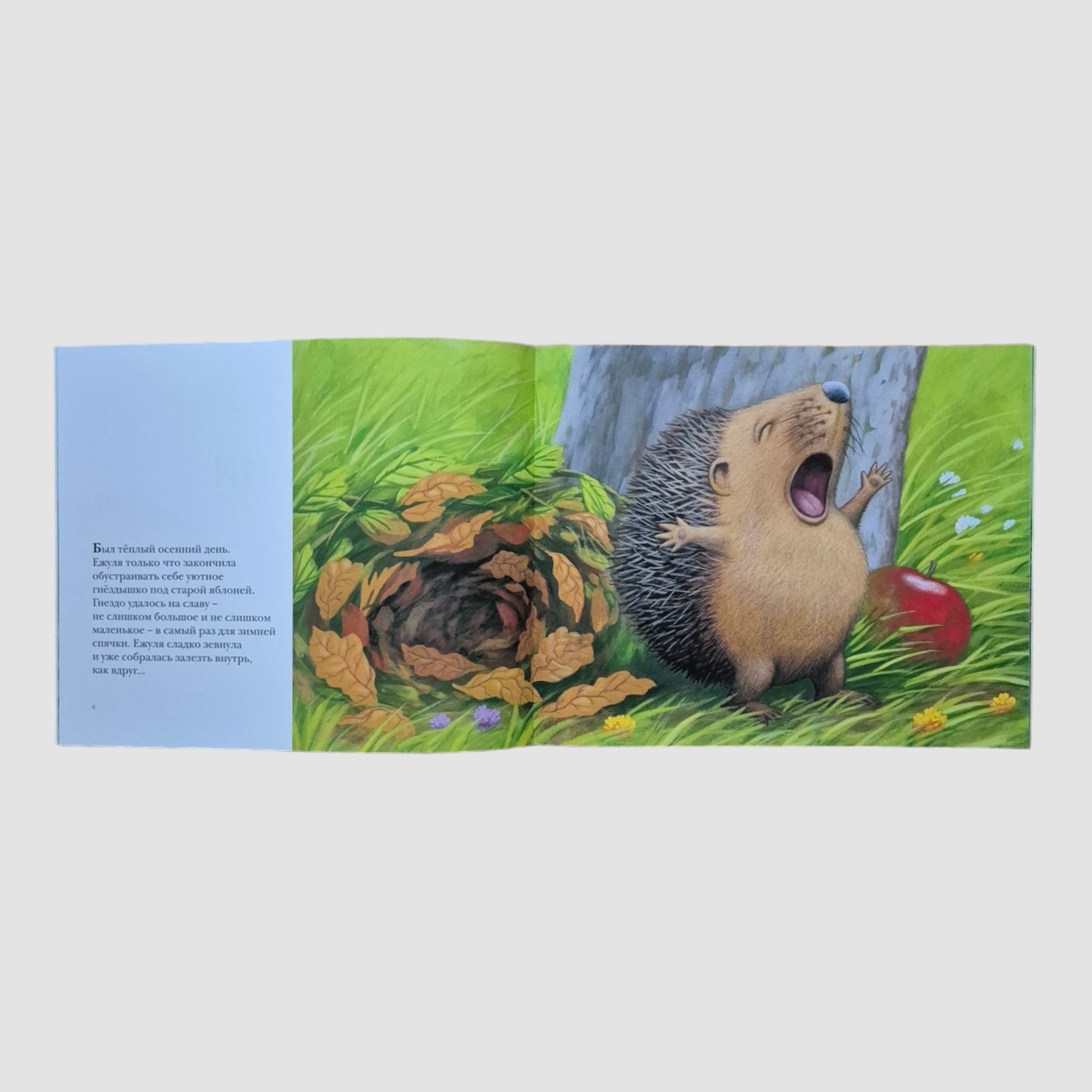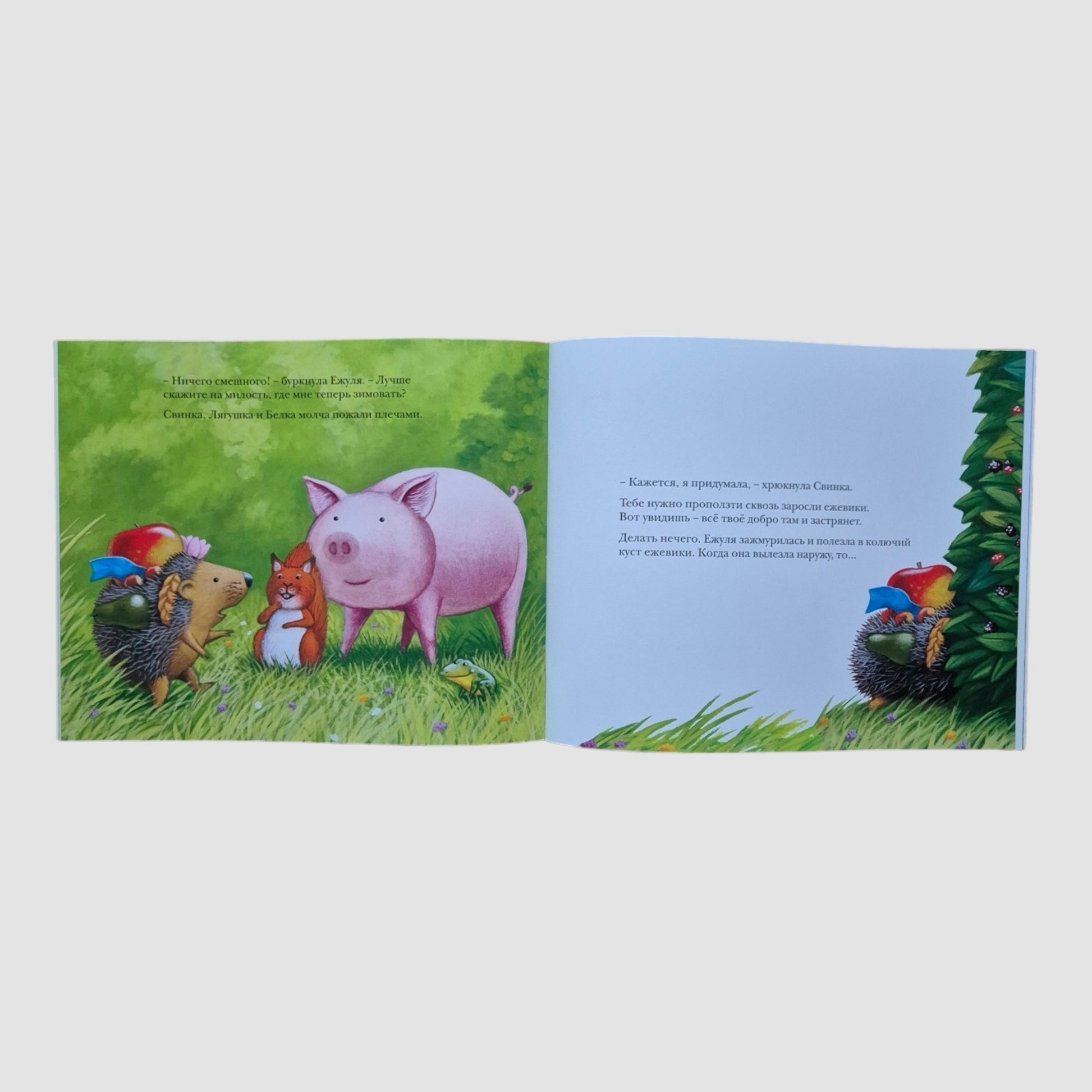 Однажды осенью ежиха по имени Ежуля закончила обустраивать себе уютное гнёздышко для зимней спячки и уже собралась забраться в него, как вдруг откуда-то сверху ей на спину упало большое красное яблоко. Яблоко было тяжёлыми и плотно засело в колючках, но это еще полбеды. Самое страшное, что с огромным яблоком на спине Ежуля больше не могла пролезть в собственное гнездо! И если бы не счастливый случай, пришлось бы бедняжке зимовать на улице.