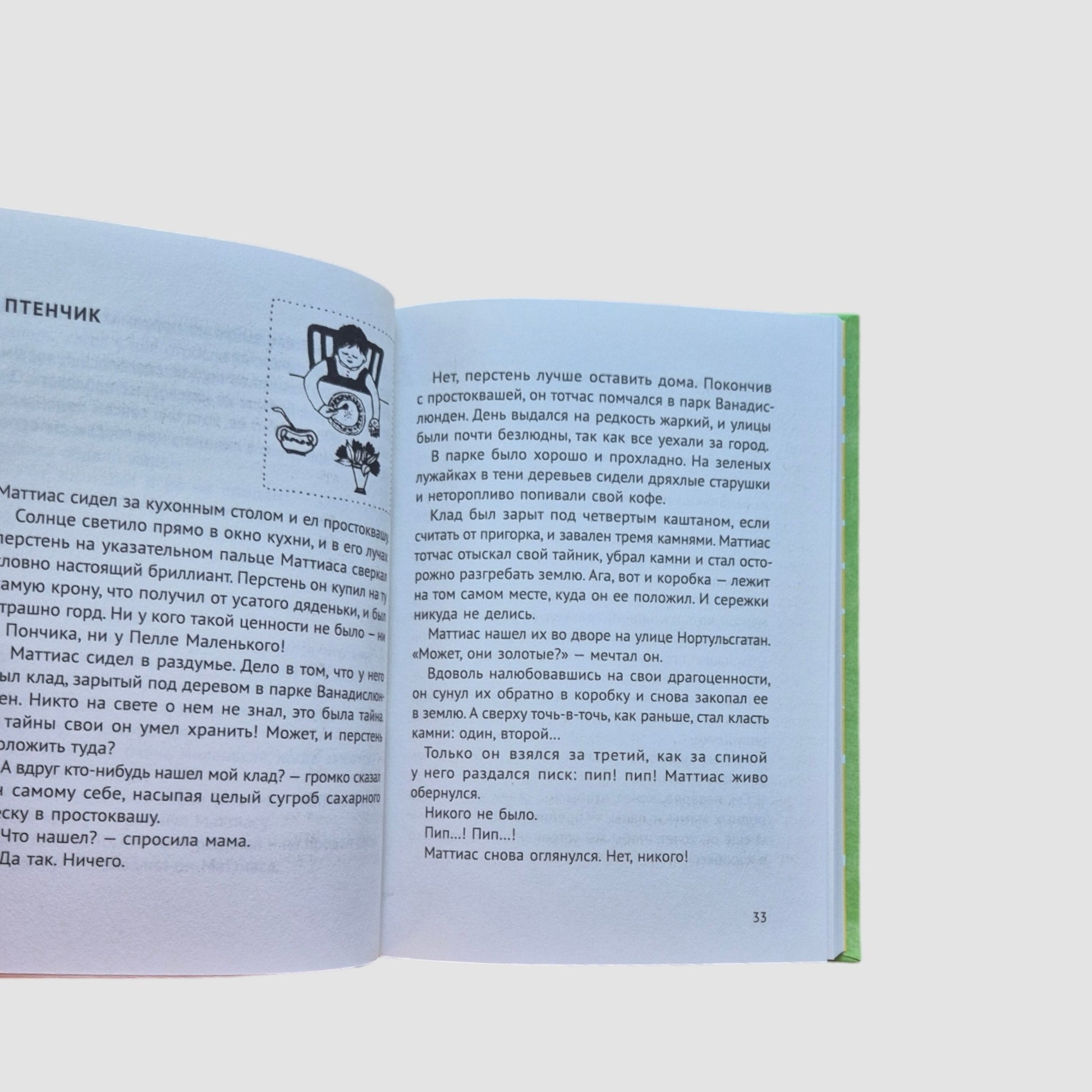 Маттиас, Пелле Маленький и Пончик, как и все дети, знают толк в радостях жизни. Они сумеют надежно спрятать клад, спасут выпавшего из гнезда птенчика и выручат друга, угодившего в открытый люк. Мир вокруг них добрый и надежный, в нем всегда помогут. Пекарь заступится за Маттиаса, прохожий подарит блестящую крону, а полицейские угостят булочками и малиновым соком.
