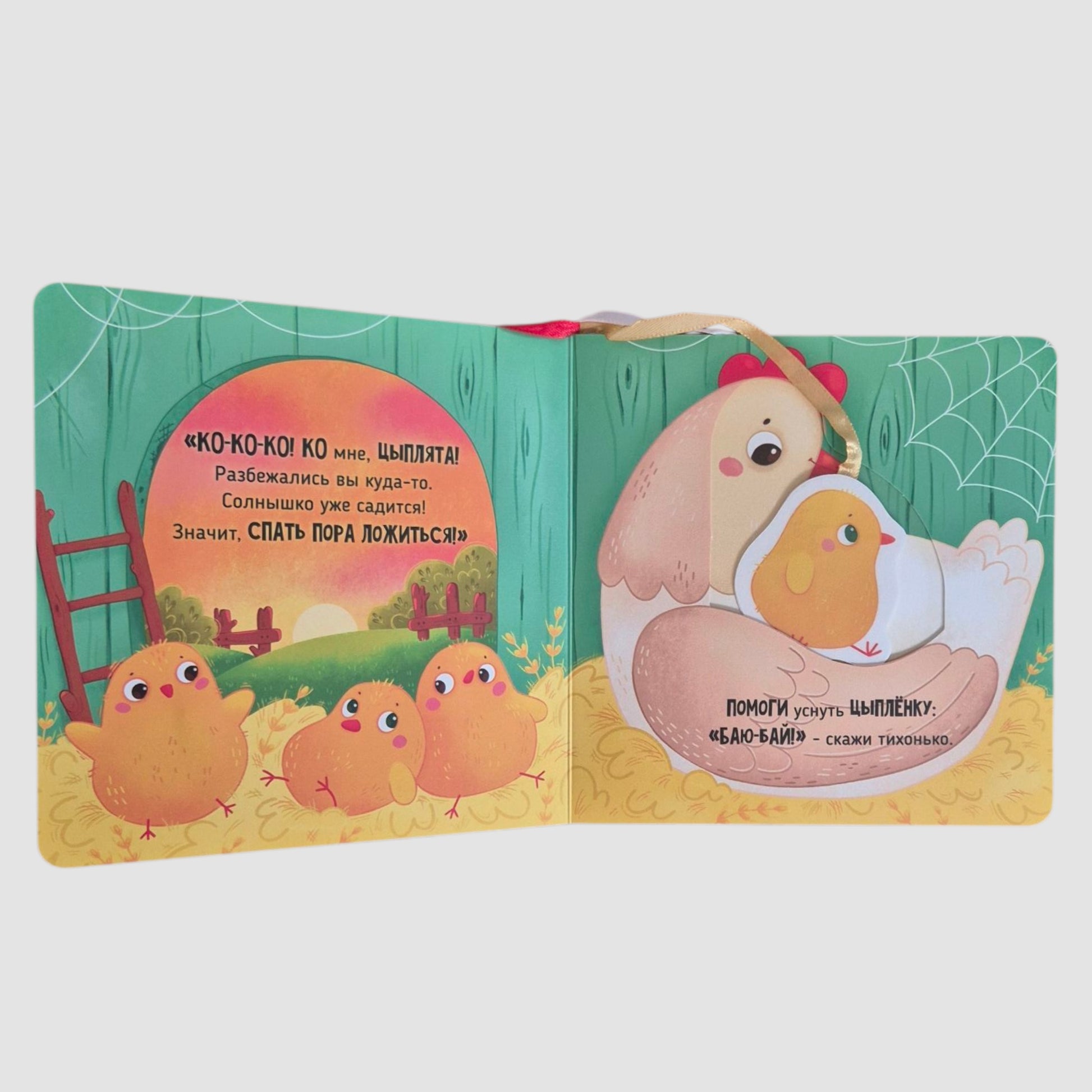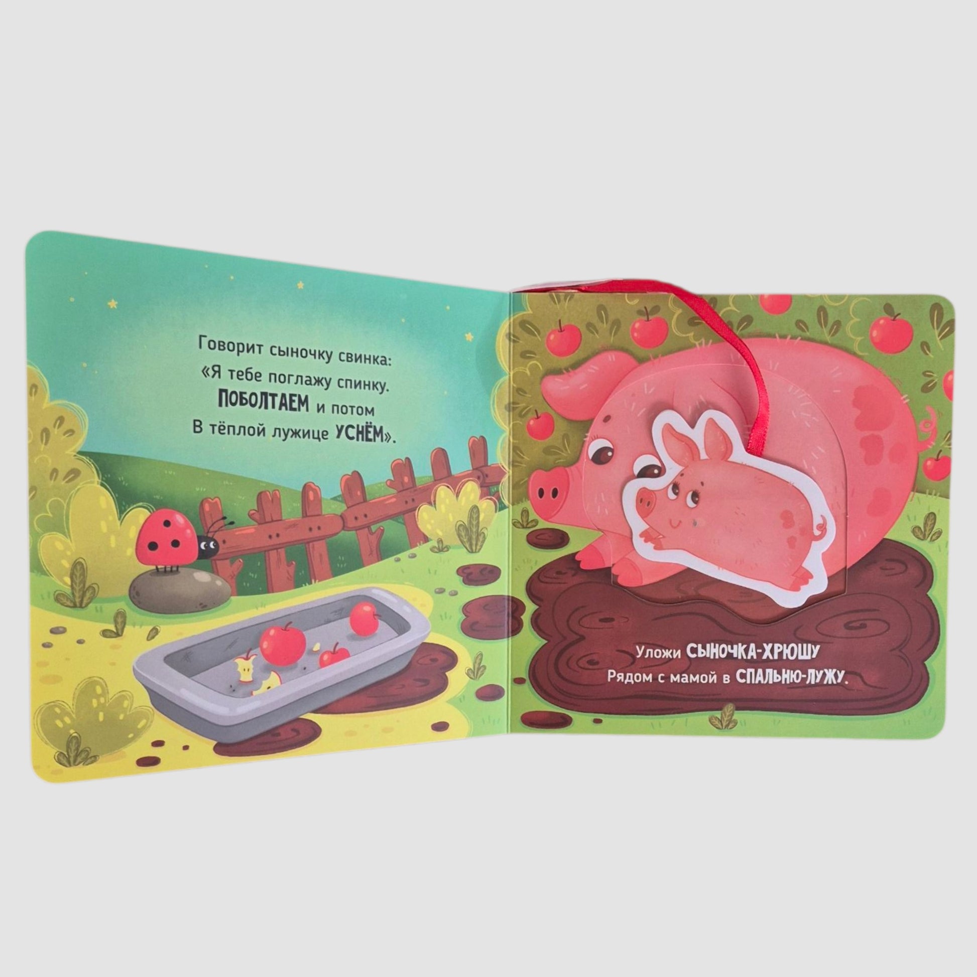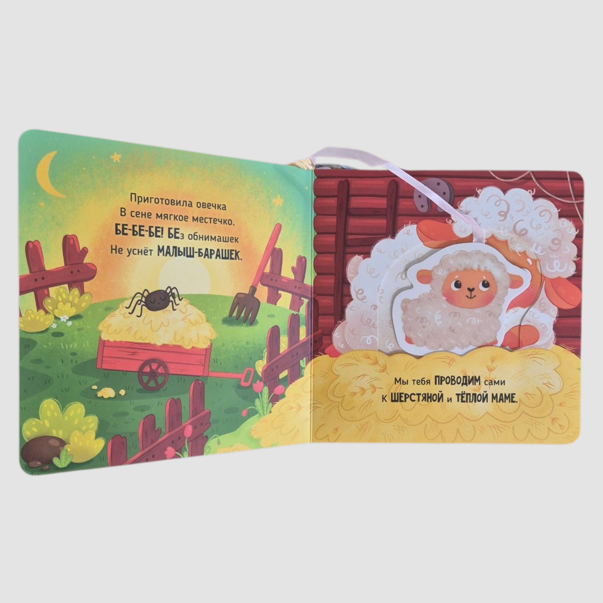 Яркие крупные иллюстрации и забавные стихи болтушки на каждой странице создают атмосферу спокойствия и тепла, помогая вашему малышу расслабиться перед сном и запустить развитие речи. Интерактивная книга-игрушка выполнена из плотного картона, что делает её идеальной для маленьких ручек и устойчивой к активным играм двух- и трехлеток. Удобный размер позволяет ребенку легко держать её самостоятельно, а тактильные элементы — пять героев на ленточках и картонные кармашки — добавляют интерактивности и увлекательности.