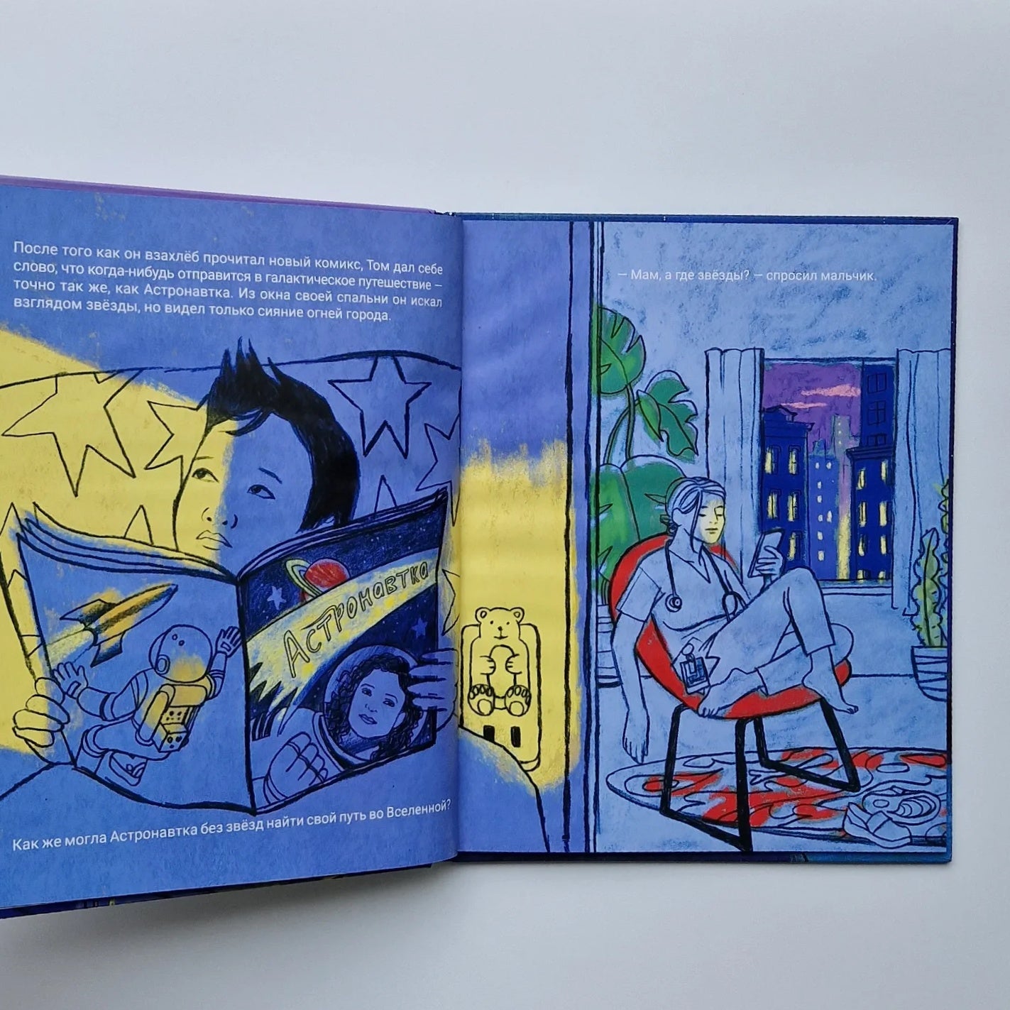 Том и его мама, которая работает в ночную смену в больнице, живут в большом городе. Том обожает комиксы про Астронавтку и мечтает когда-нибудь совершить межгалактическое путешествие. И конечно, ему очень хочется видеть звёзды. Но это невозможно - ни одной из них не разглядеть в залитом искусственным светом небе над городом, когда он выходит на пожарную лестницу своего многоквартирного дома.