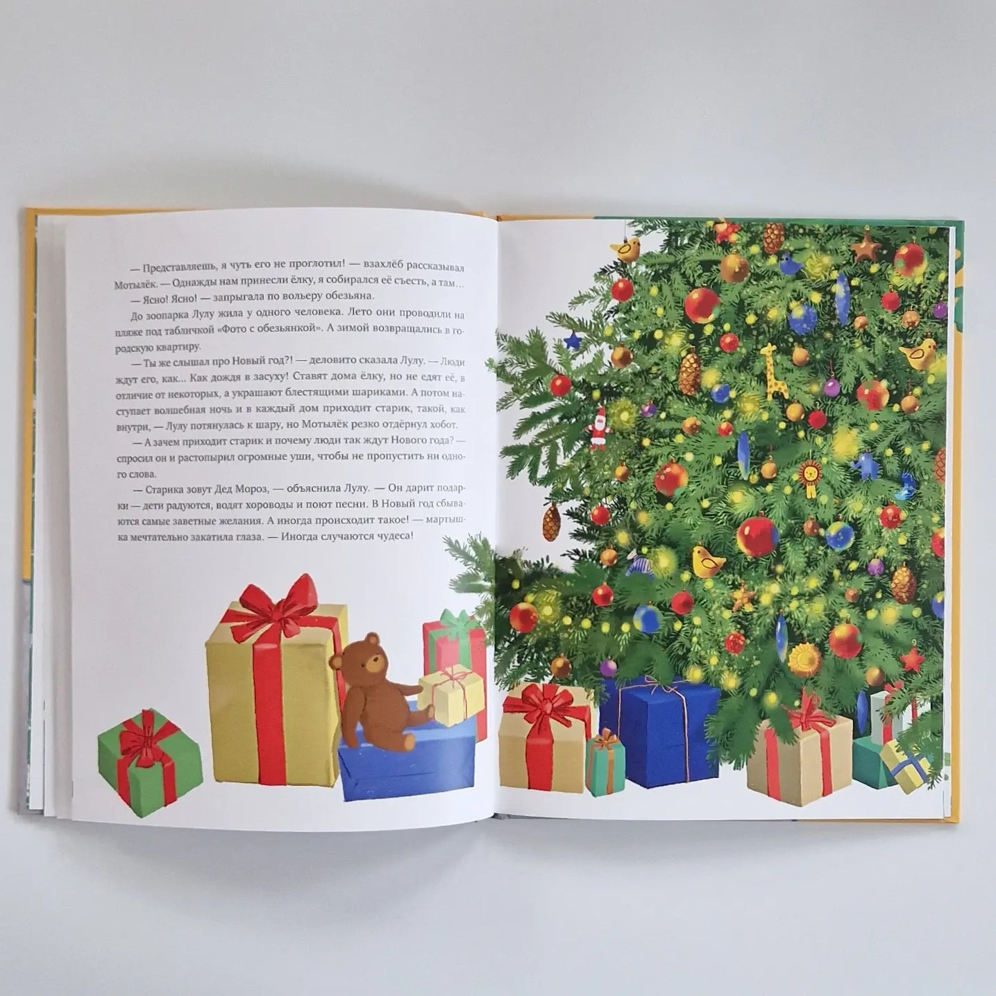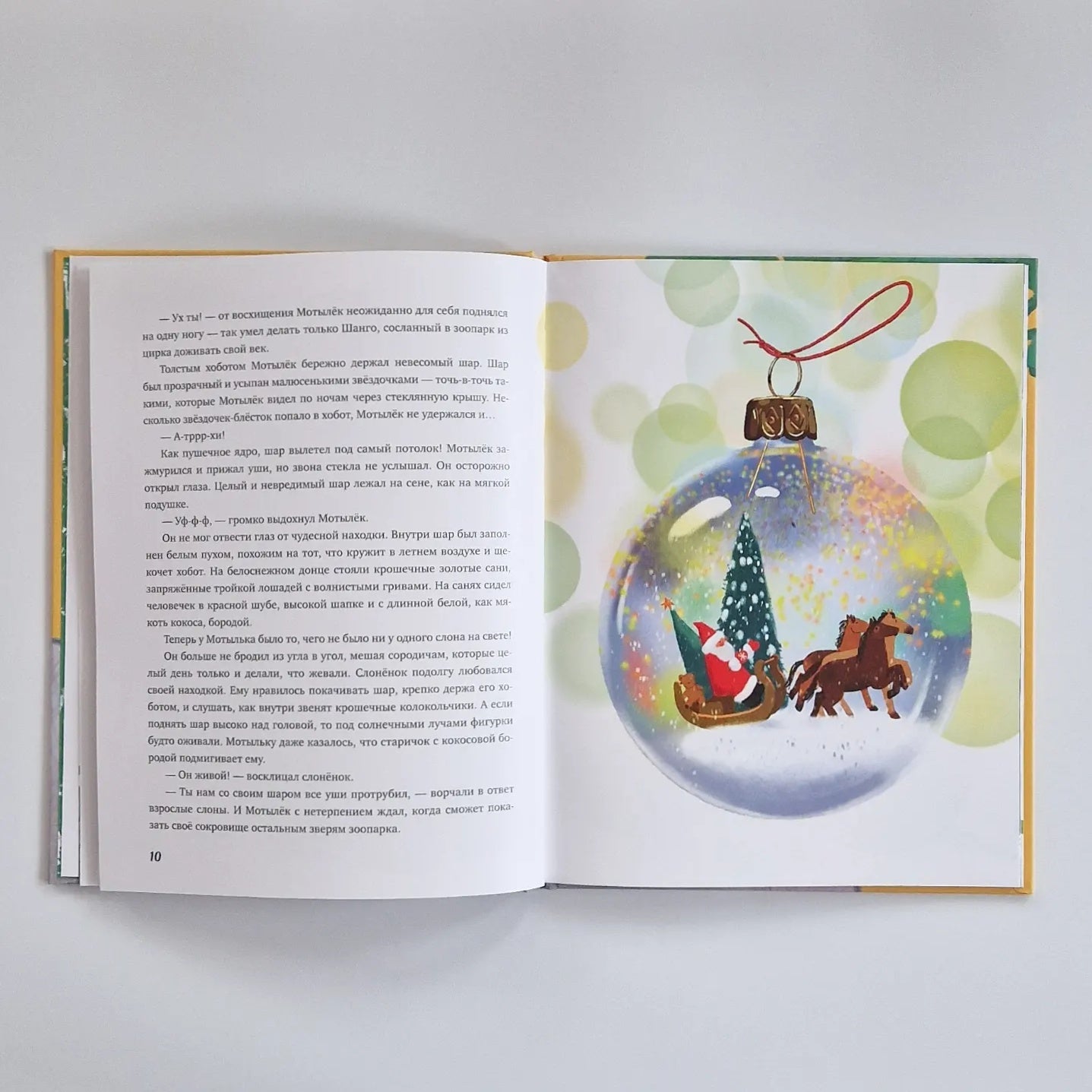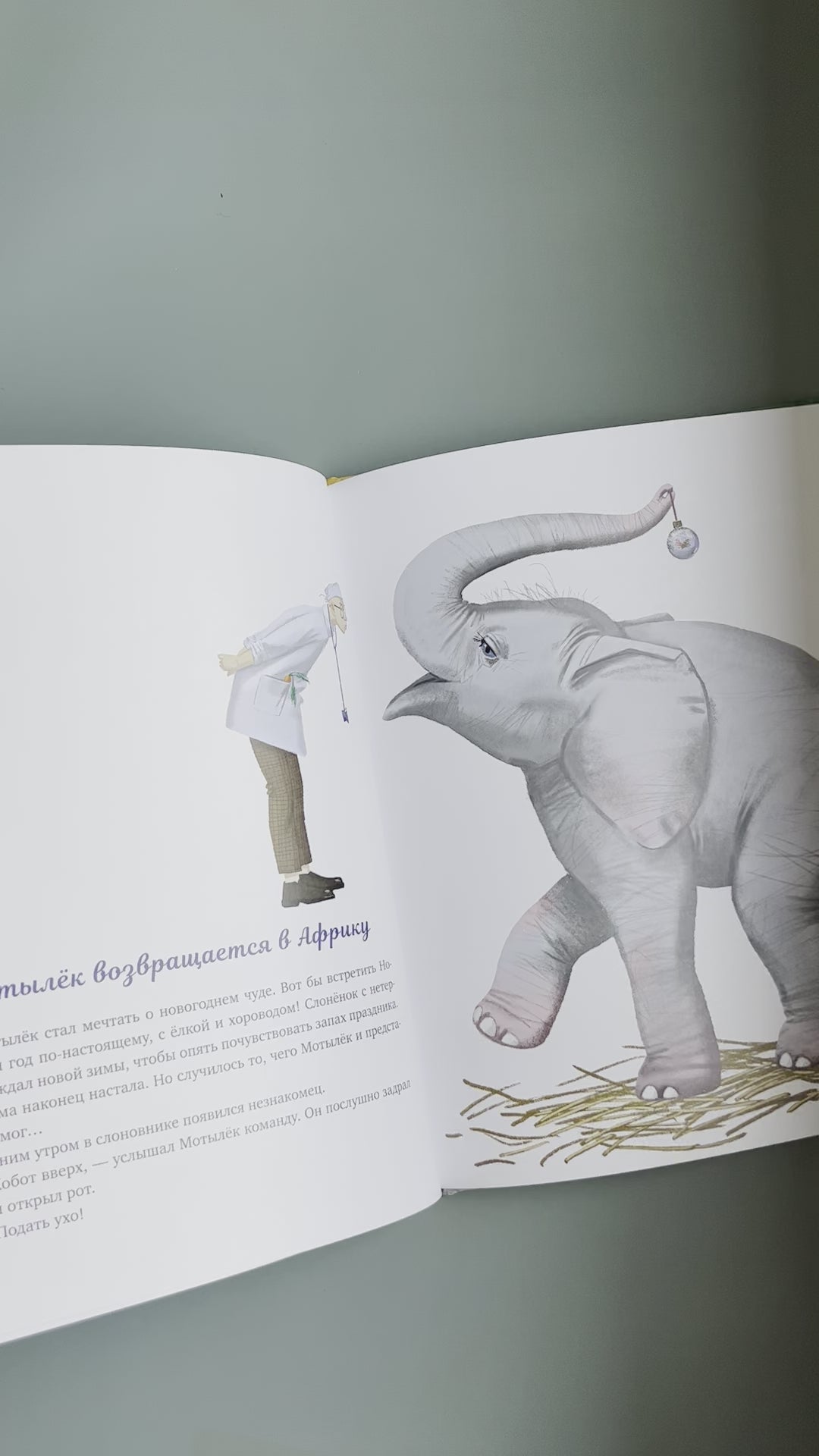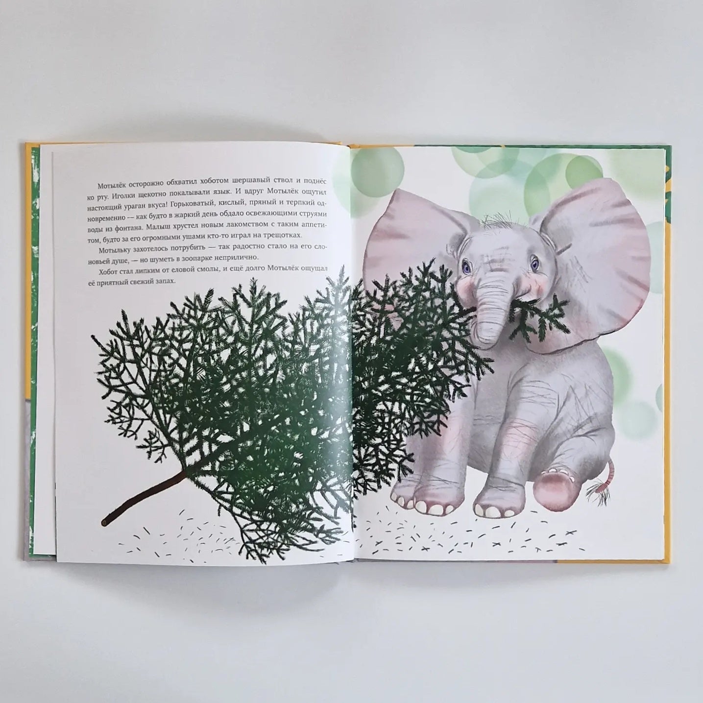 У Мотылька — не крылья, а уши, не хоботок, а хобот, и летать он совсем не умеет, потому что слоны для этого слишком тяжёлые. А слонёнку Мотыльку так хочется чудес! Но в зоопарке даже поиграть не с кем. От скуки Мотылёк машет ушами и мечтает- И вот однажды с ним случилось такое! На обед принесли не сено, а настоящую ёлку! Мотылёк хотел попробовать лакомство, но чуть не проглотил волшебный шар…