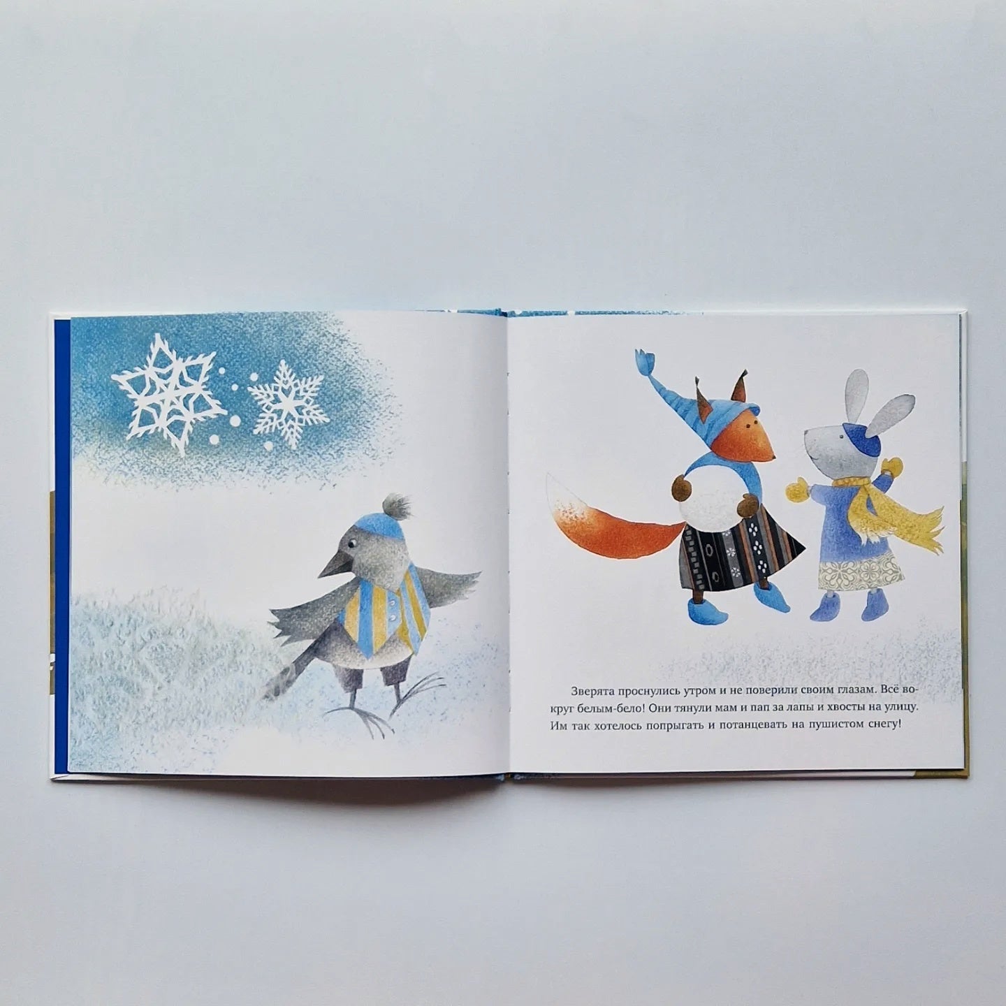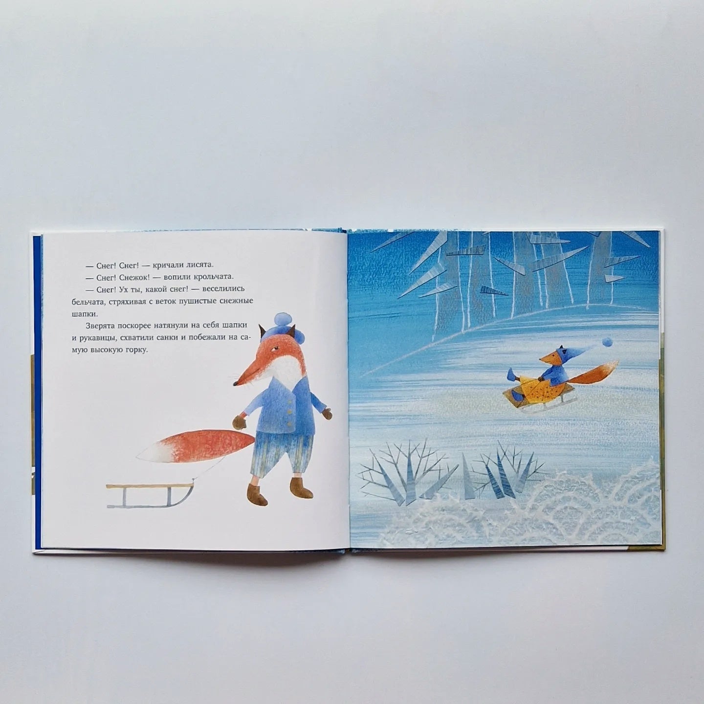 У лесных зверят праздник: выпал первый в их жизни снег! Можно прыгать, кувыркаться, танцевать на пушистом мягком снегу. А ещё можно весело кататься на санках с большой горки!