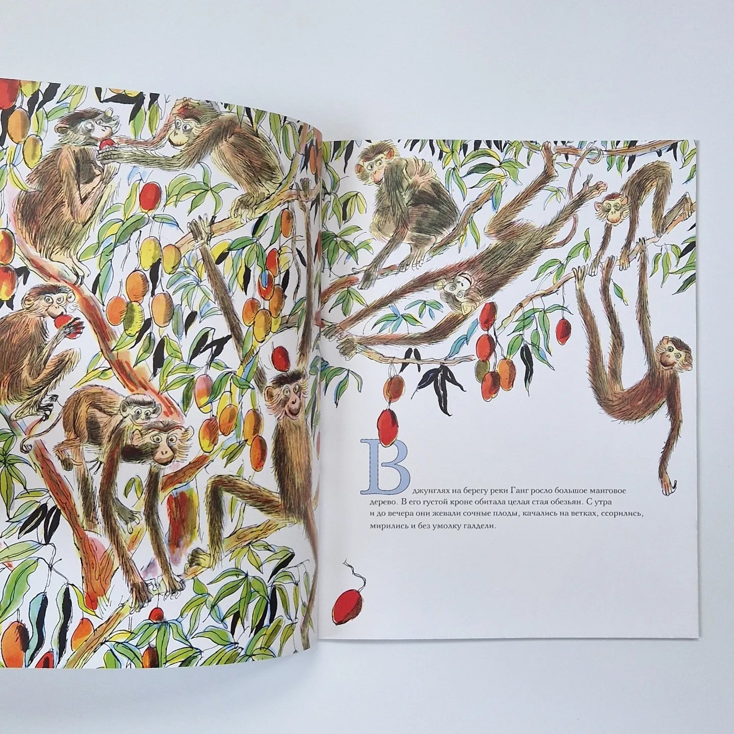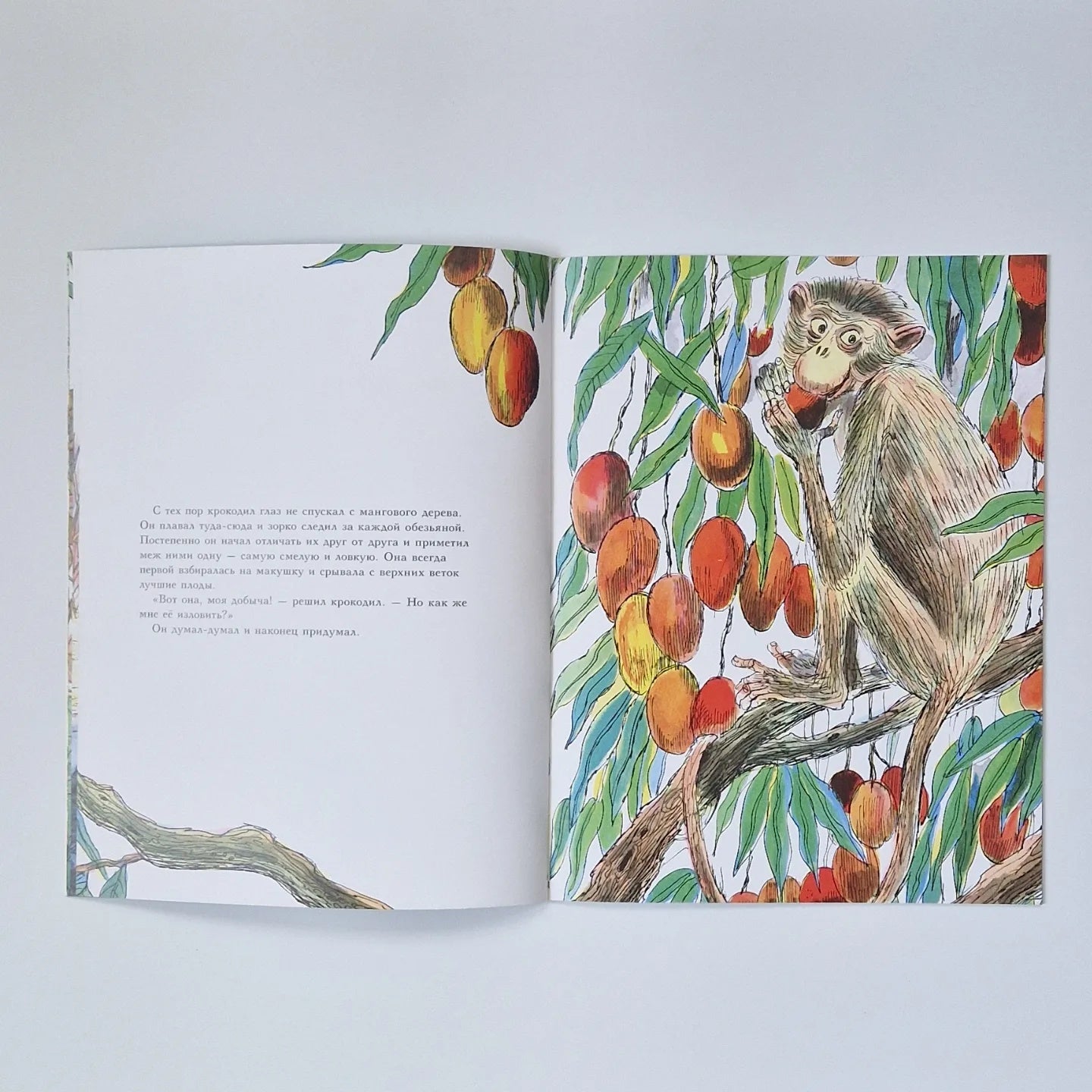 Как-то раз молодому и вечно голодному крокодилу вздумалось поймать обезьянку. «Обезьяны проворнее меня, зато я хитрее», – решил он и стал наблюдать за стаей обезьян, жившей на берегу реки. Долго он следил за ними, пока наконец не приметил одну, самую ловкую и смелую: она первой забиралась на верхушку мангового дерева и срывала там лучшие плоды. «Вот кого я схвачу и проглочу!» – подумал крокодил. Но обезьянке вовсе не хотелось становиться чьей-то добычей…