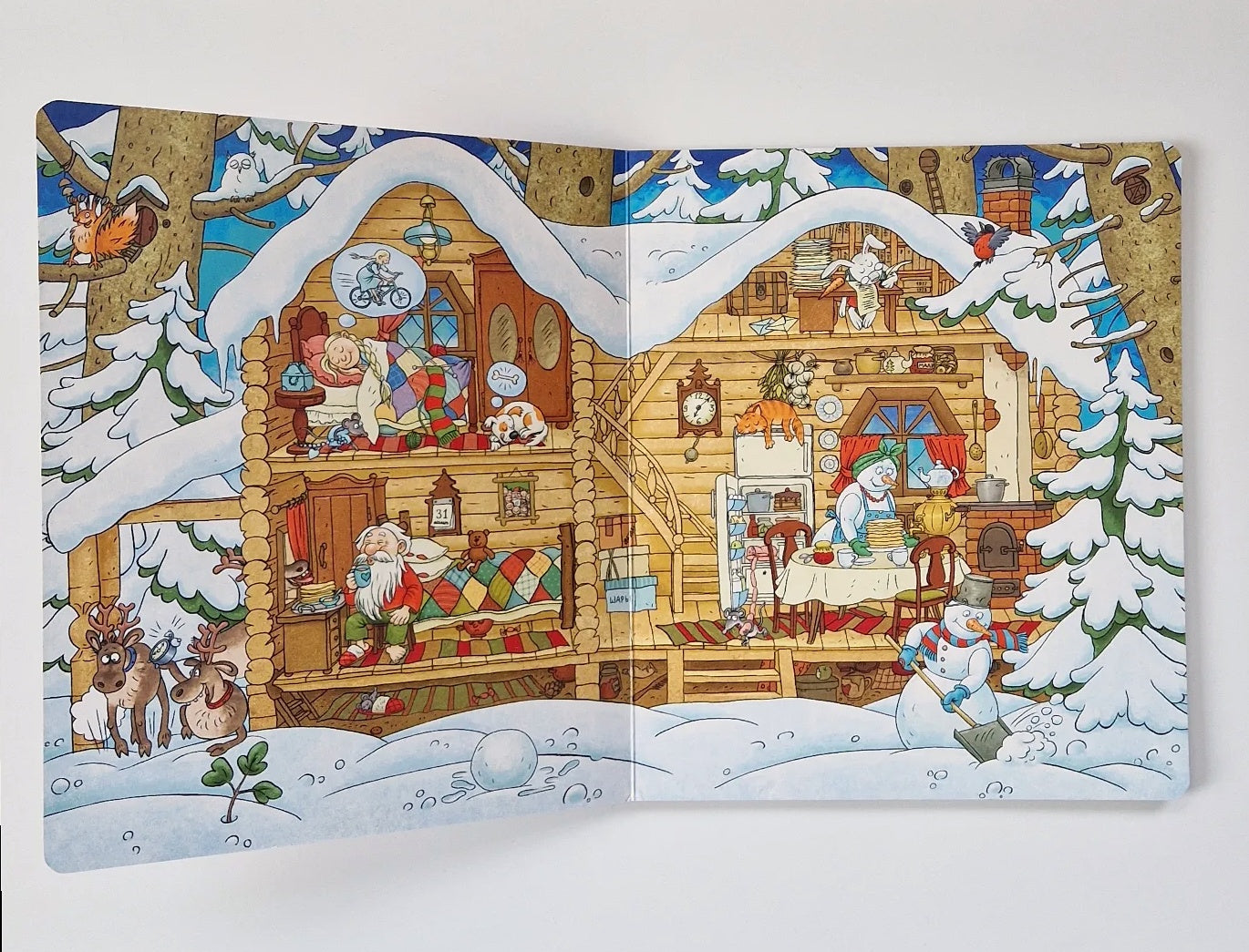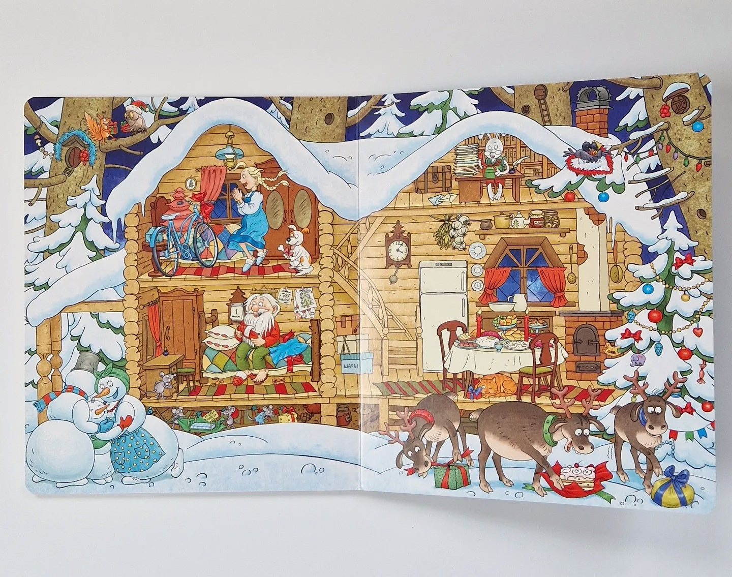 "Один день из жизни Деда Мороза" - это развивающая книга-виммельбух. Виммельбухами называют книги-картинки, в которых совсем нет текста, но очень много мелких деталей для рассматривания, и одновременно много сюжетных линий. Как же их читать? Вместе с детьми! Виммельбухи можно назвать семейными изданиями. Сюжет создается при совместном просмотре и опирается на индивидуальный жизненный опыт - ваш и малыша. Разглядывая картинки, вы с ребёнком разбираетесь в сюжетной линии, изучаете героев, пользуясь образами, которые создал художник, придумываете характер героев, объясняете их поступки. Можно сказать, вы додумываете книгу, то есть сочиняете истории и сами становитесь авторами. Таким образом, виммельбух - отличный инструмент для развития словарного запаса и устной речи, тренировки внимания, памяти, умения находить причинно-следственные связи. Недаром психологи так любят книги-картинки, и рекомендуют родителям почаще рассматривать их вместе с детьми.
