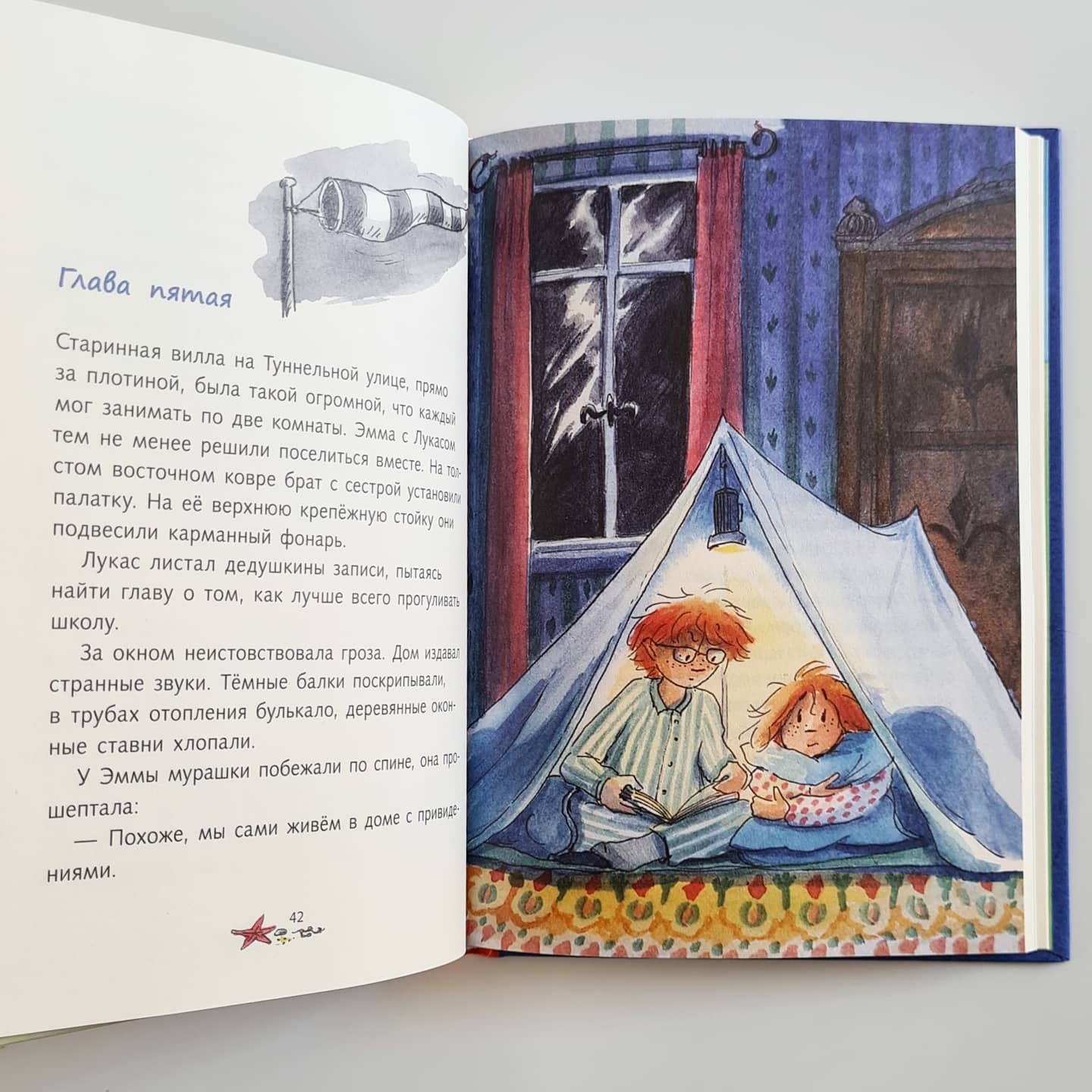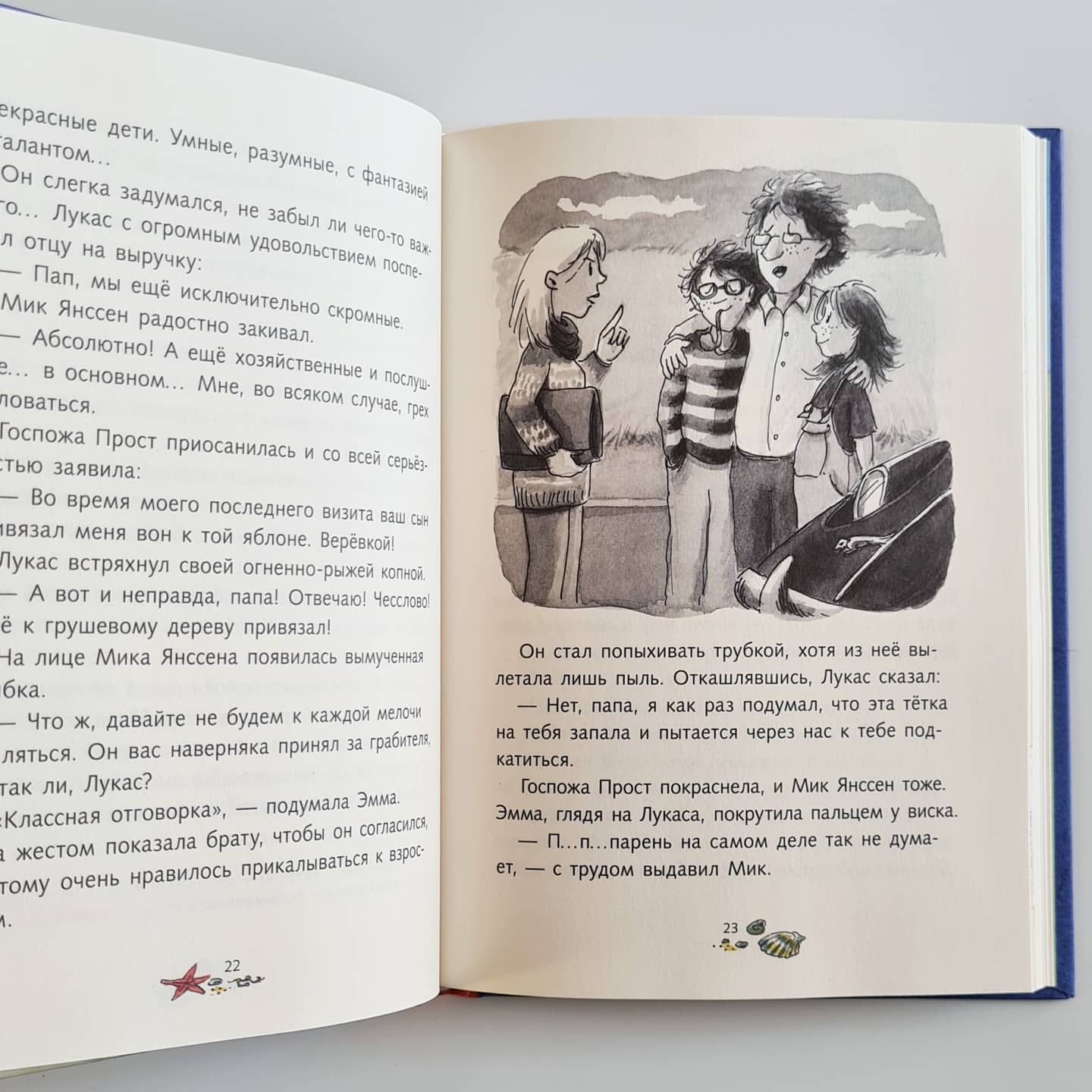 Во второй книге серии замечательная рыжеволосая семейка – папа Мик и его дети Эмма и Лукас – берётся за новое детективное расследование. В отеле «У краба» на острове Нордерней, по-видимому, обитают привидения, и поэтому в нём никто не останавливается. В то время как папа Мик заселяется в отель, Эмма и Лукас устраивают около него засаду. Как хорошо, что двоюродный дедушка Янссен специально для подобных случаев прекрасно оборудовал детективный фургон. В нем есть буквально всё, начиная с всевозможных технических новинок, которые позволяют видеть и слышать буквально сквозь стены, и заканчивая внушительным запасом еды, которая может пригодиться в период многодневной слежки за преступником. И привидения не заставляют себя ждать. От их воя и грохота трясутся и сдвигаются стены. И они так пугают папу Мика, что он в жуткой панике покидает отель. Но испугать Эмму и Лукаса не так-то просто. К тому же они догадываются, что под личиной привидений наверняка шифруются непорядочные и коварные люди. Они возвращаются в отель и, рискуя жизнью, не только разоблачают преступников, но и спасают жизнь благородной пожилой даме. Ключ к успеху в расследовании прост: Эмма и Лукас – наблюдательные, смышлёные и бесстрашные. И они прекрасно дополняют друг друга. А то, что они пока ещё дети, только помогает им проникать туда, куда не всякий взрослый сунется.