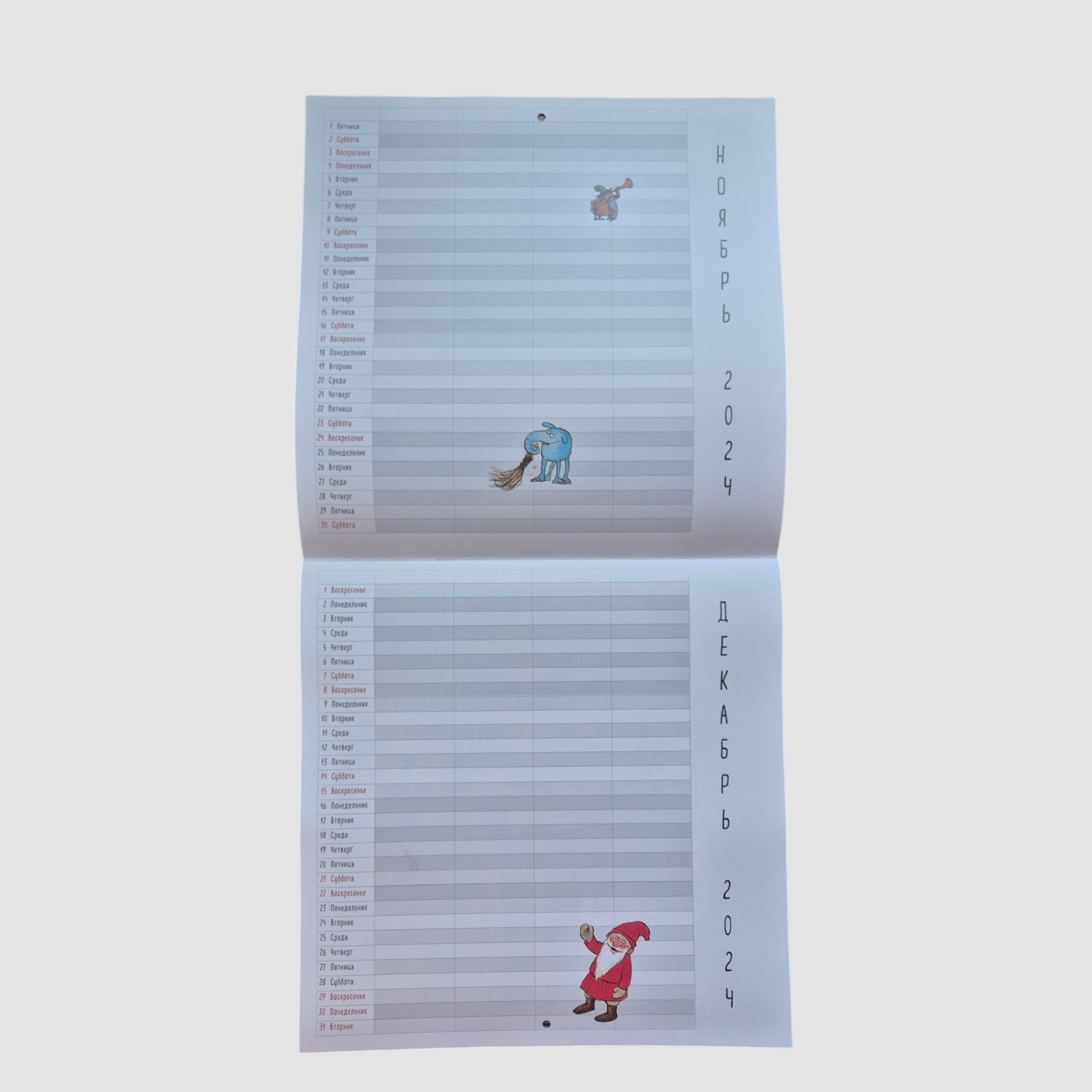 Календарь оформлен в виде планера: слева числа и дни недели, справа - пять столбцов с пустыми ячейками. Столбцы можно подписать, а затем добавить дни рождения друзей или составить список дел.