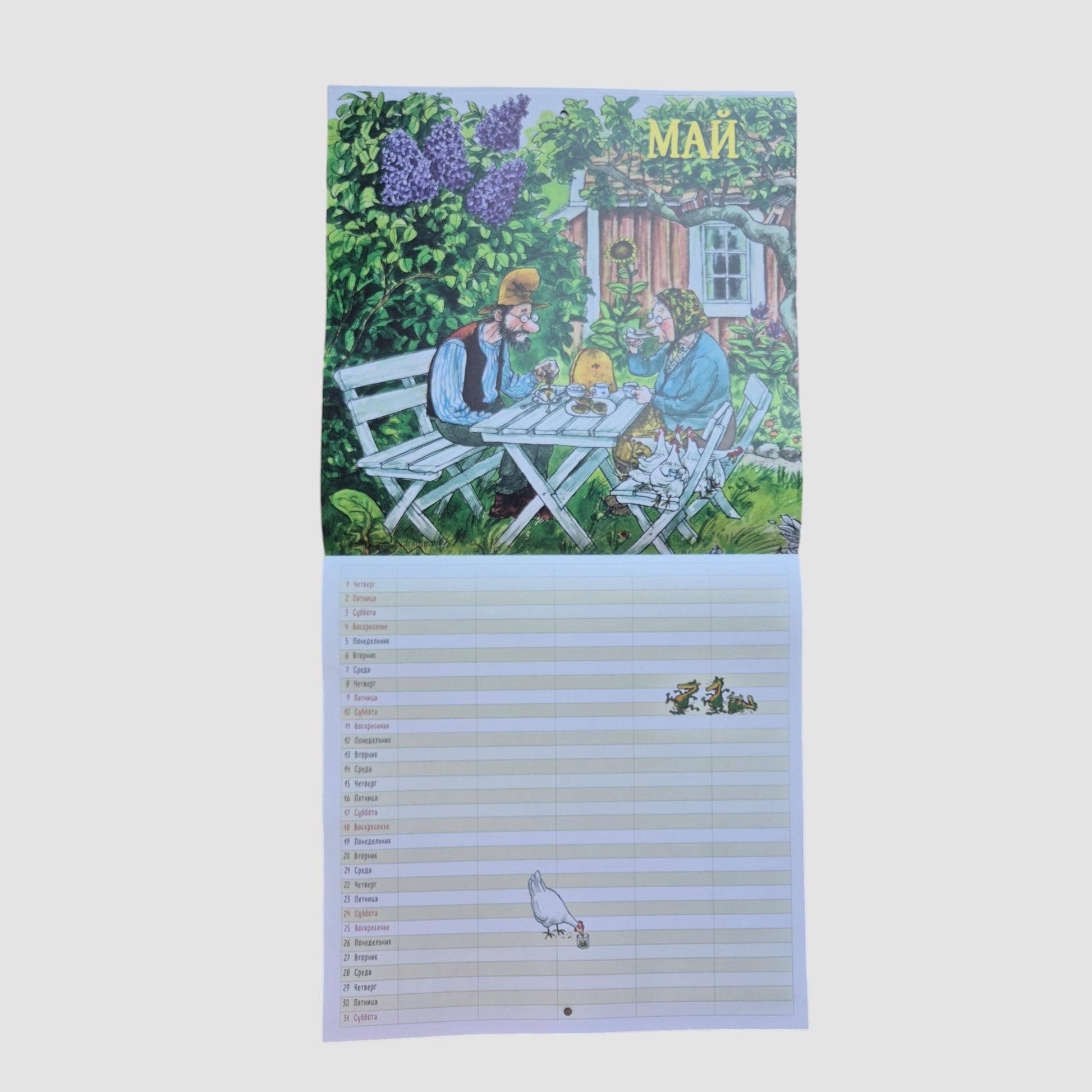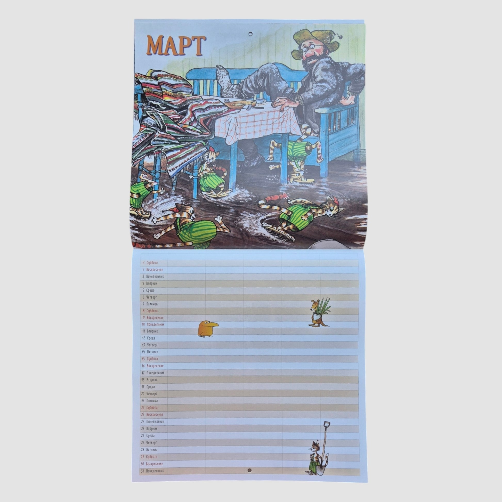 Каждый месяц начинается с картинки Свена Нурдквиста из книг о Петсоне и Финдусе. Календарь вешается на гвоздик.