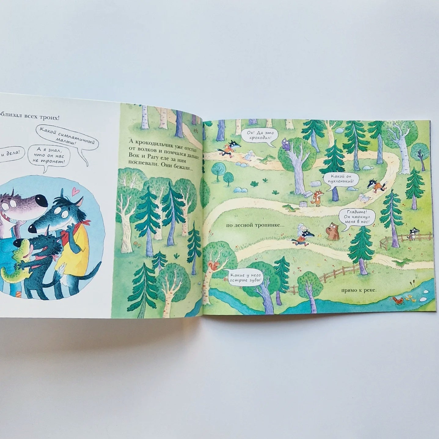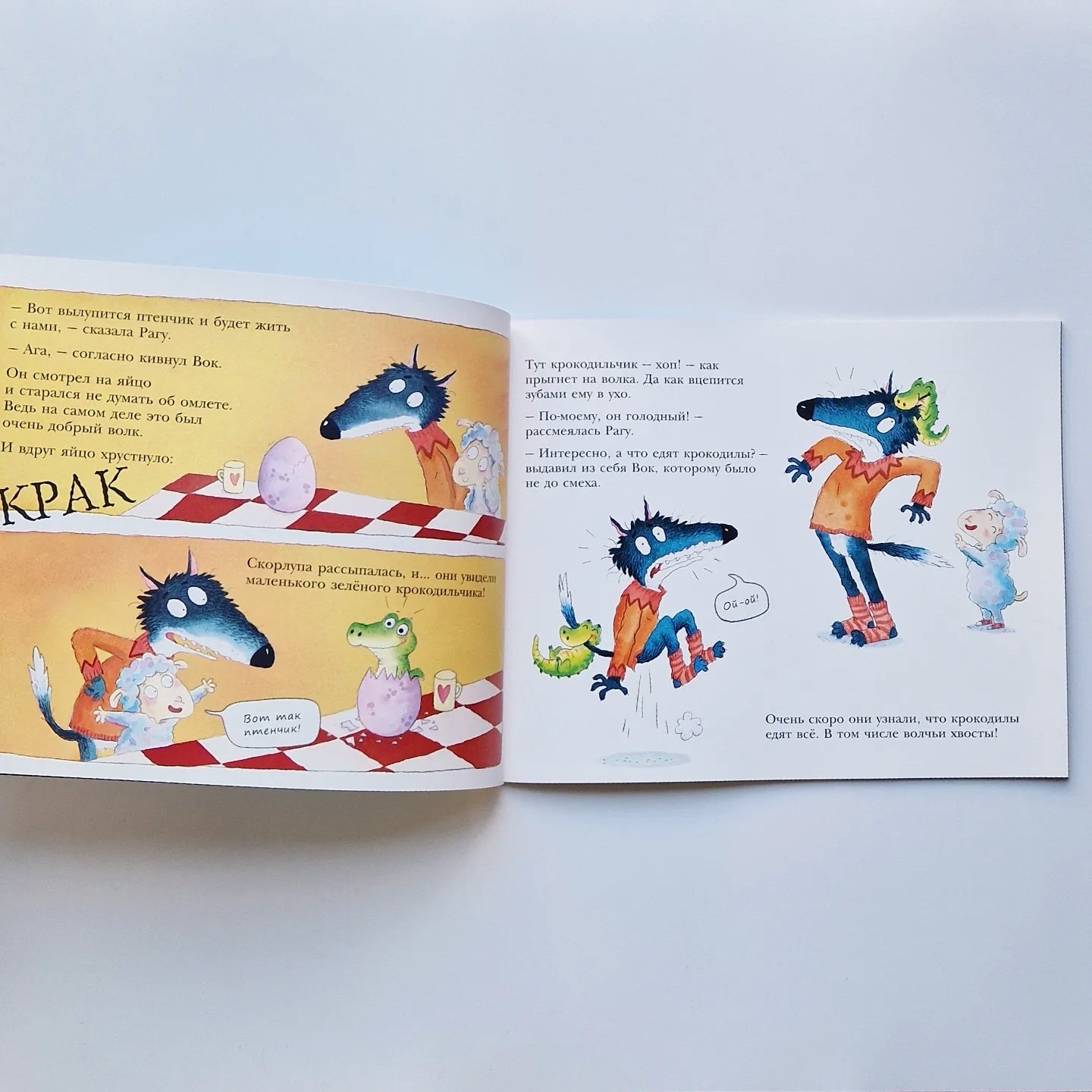 В домике с оранжевой, как морковка, крышей жили душа в душу овечка по имени Рагу и волк по имени Вок. Однажды вечером они нашли на дороге большое ничейное яйцо и принесли его домой. Вок хотел сделать из яйца омлет, но овечка ему не позволила. И правильно сделала, потому что из яйца вскоре вылупился крокодильчик, которого они назвали Омлет. Лесные звери сначала побаивались зеленого малыша, а потом полюбили его за доброту и веселый нрав. Правда, не все. Барсук твердил, что крокодил, когда вырастет, всех проглотит. Однажды после грозы их тихая речка разлилась, и бурный поток стал уносить утят от берега. Омлет устремился вдогонку, раскрыл пасть и захлопнул ее вместе с утятами. Неужели барсук был прав?