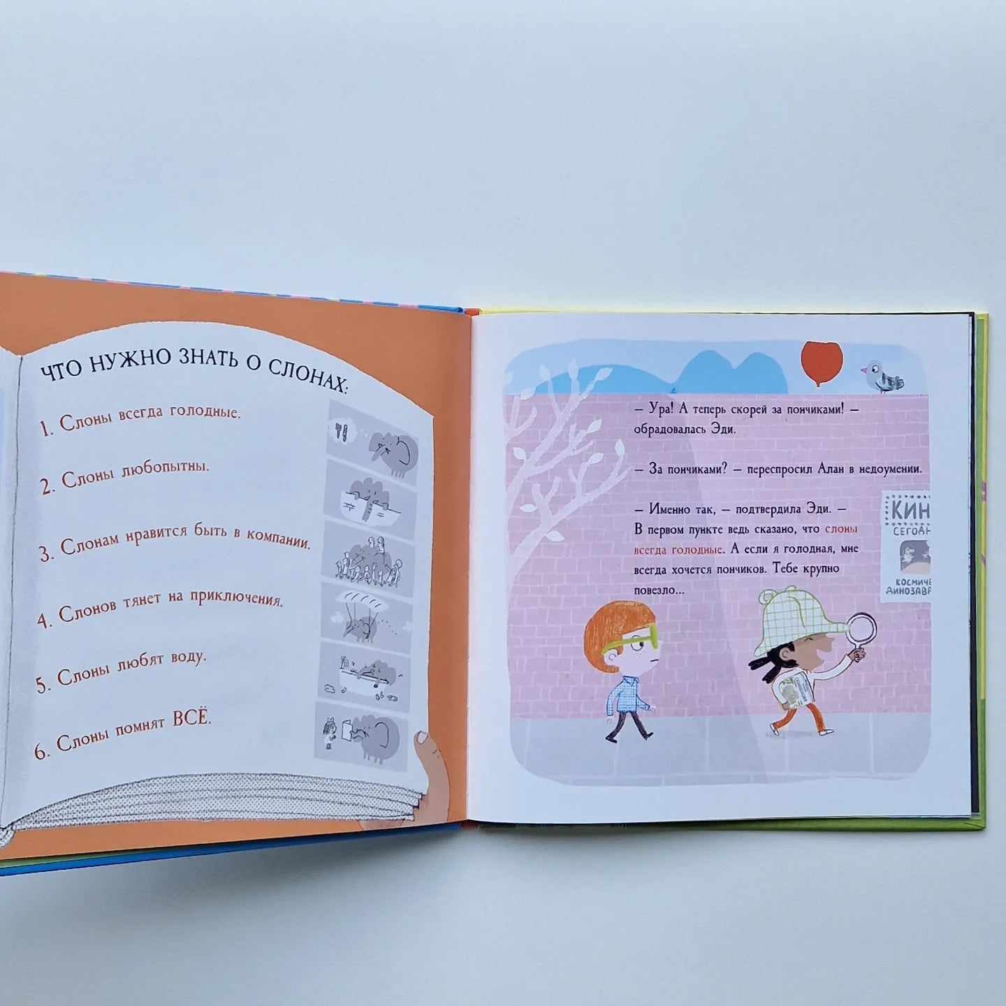 О нет! Алан потерял своего слона! К счастью, девочка-сыщик Эди точно знает, где навести нужные справки и как организовать поиск. Выяснив в библиотеке, что нужно знать о слонах, Эди ведёт Алана по маршруту расследования. Они наведываются в магазин пончиков, посещают музей, осматривают город с высоты птичьего полёта… Но слона нигде нет! Увенчаются ли успехом поиски Эди и Алана? А может, всё дело в желании найти... нового друга? Юные читатели приглашаются на занимательный квест. Однако "Пропал слон!" - это не только забавное приключение, связанное с поиском пропавшего животного, но ещё и рассказ про оригинальный способ подружиться