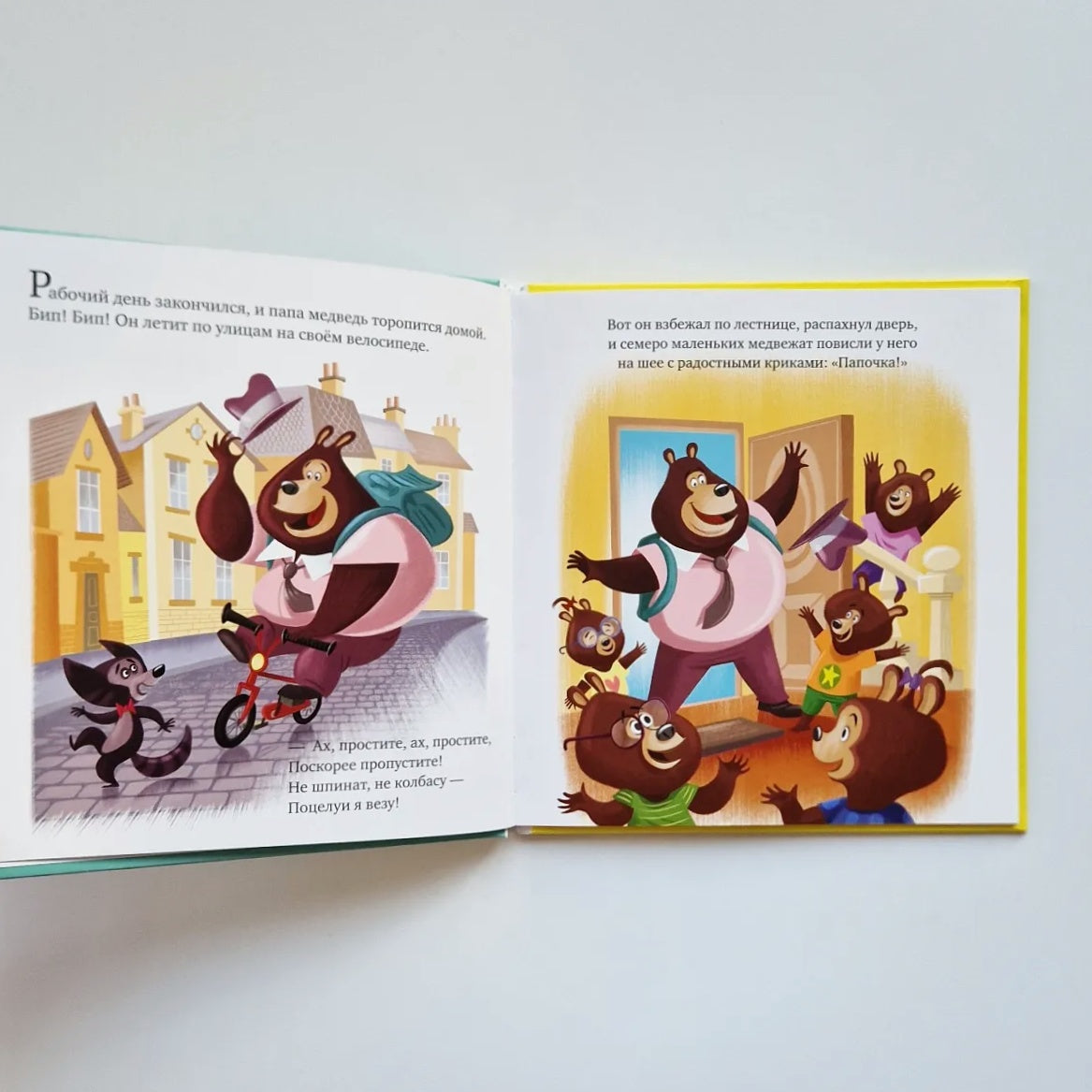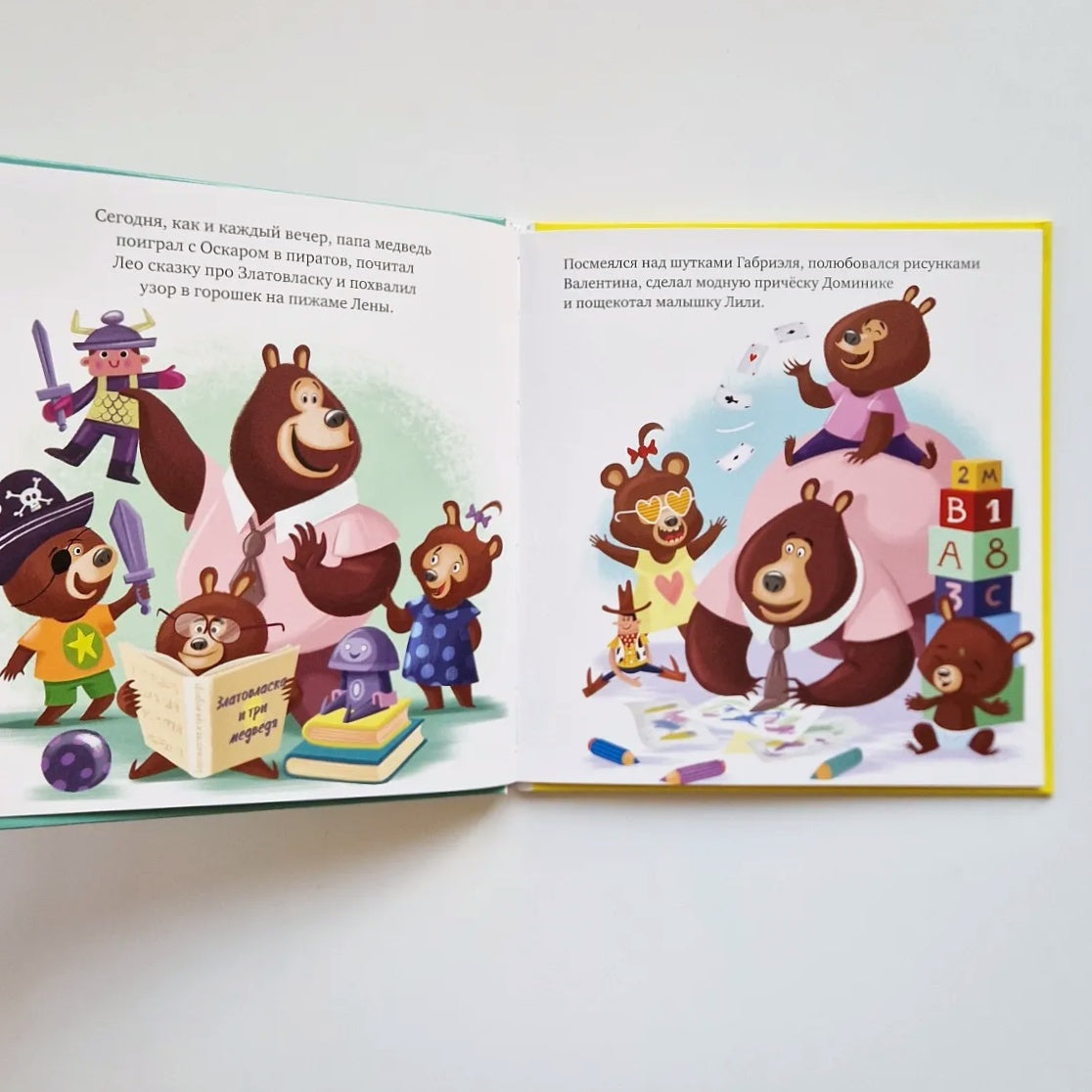 Папа медведь торопится домой, ведь там его ждут любимые медвежата! Папа обожает проводить время с малышами читать им книжки, играть в пиратов, помогать, хвалить и обнимать! Уложив всех спать, медведь надеялся удобно устроиться в кресле и почитать газету, но не тут-то было... Как самый лучший папа справится с маленькими озорниками?