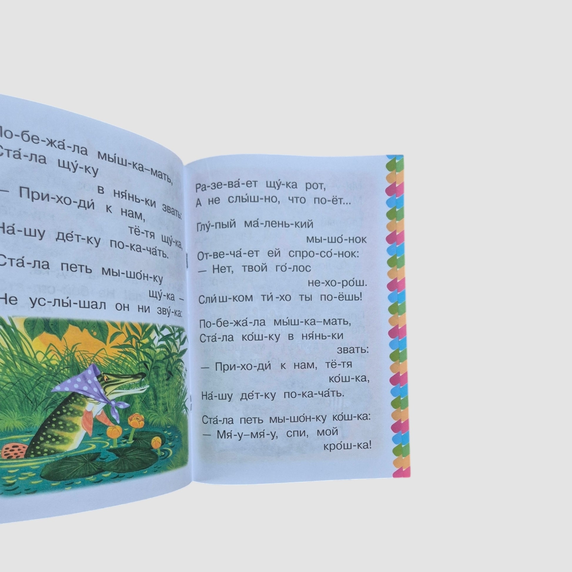 Эти книжки небольшого формата, с большими буквами, и все слова разбиты на слоги с ударениями.