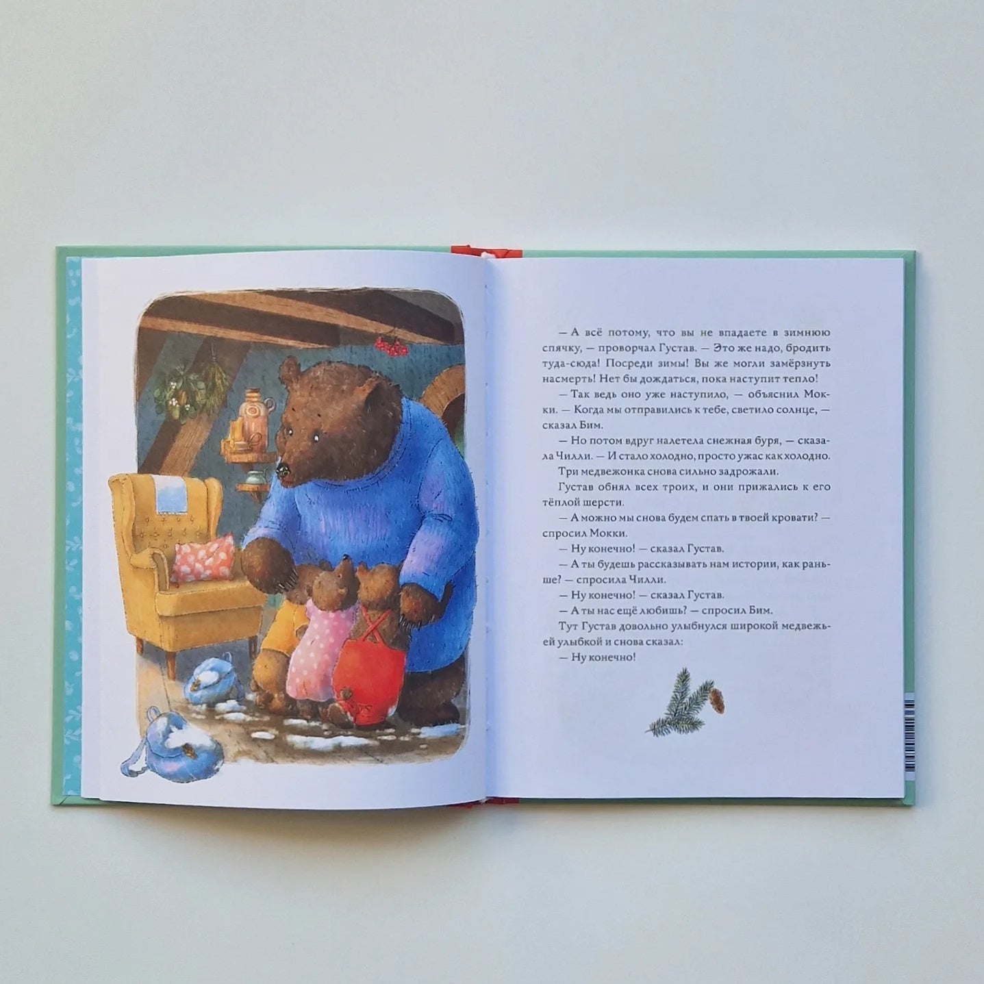 Днем медведь Густав варит для них кашу и печет блины, а еще придумывает много разных игр и учит сочинять стихи. А вечером рассказывает трем медвежатам истории - про то, как он был маленьким, про свою сестренку Ольгу, нахального кузена Барри, строгого дядю Адальбера и тетю Бертруду, которая любила собирать всякую всячину.