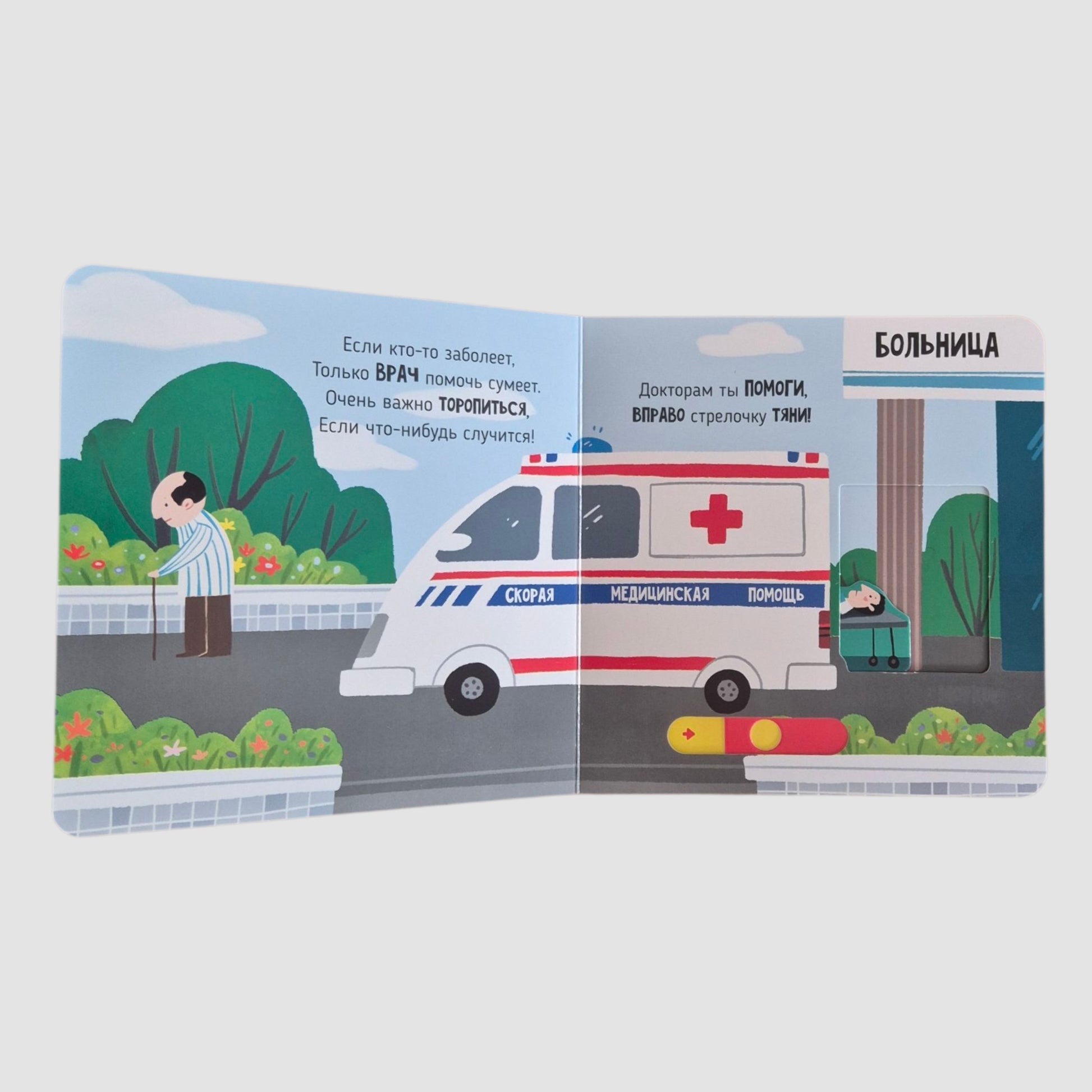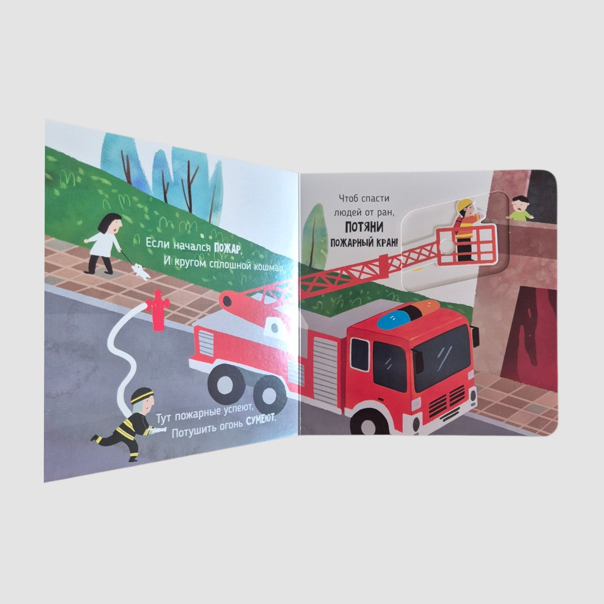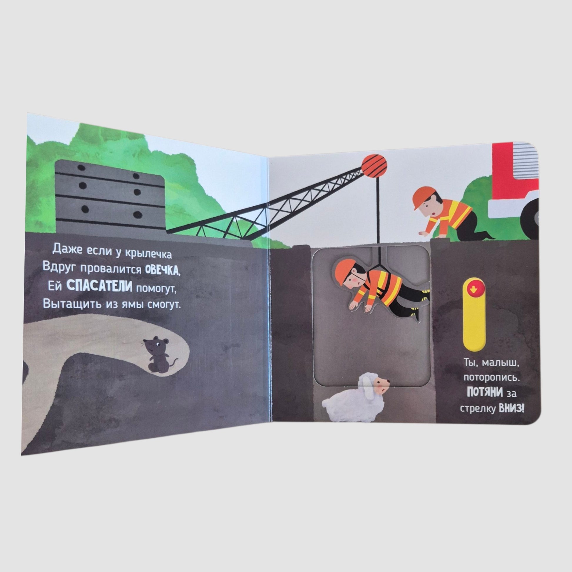 Здесь герои, посмотри! Кто спасает от беды? Врач, спасатель и пожарный – все им очень благодарны! Книжка-малышка включает 5 крупных тактильных интерактивных элементов (скорая помощь, пожарный кран, вертолёт) и простые задания, которые делают процесс чтения увлекательным.
