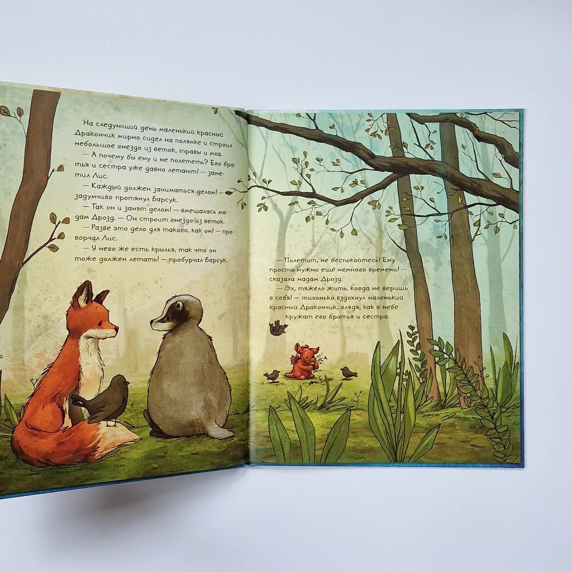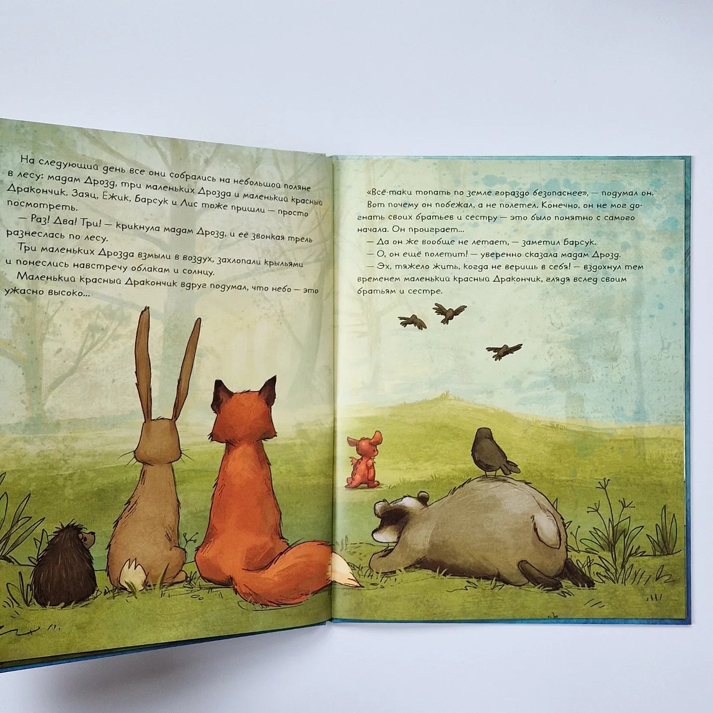 Маленькие Дрозды целыми днями летают наперегонки - они уже совсем выросли. А что же Дракончик? Он только смотрит на игры своих братьев и сестры и никак не может решиться - ему кажется, что топать по земле намного безопаснее, чем парить в облаках... Семья и друзья стараются помочь ему - ведь так здорово поверить в себя!