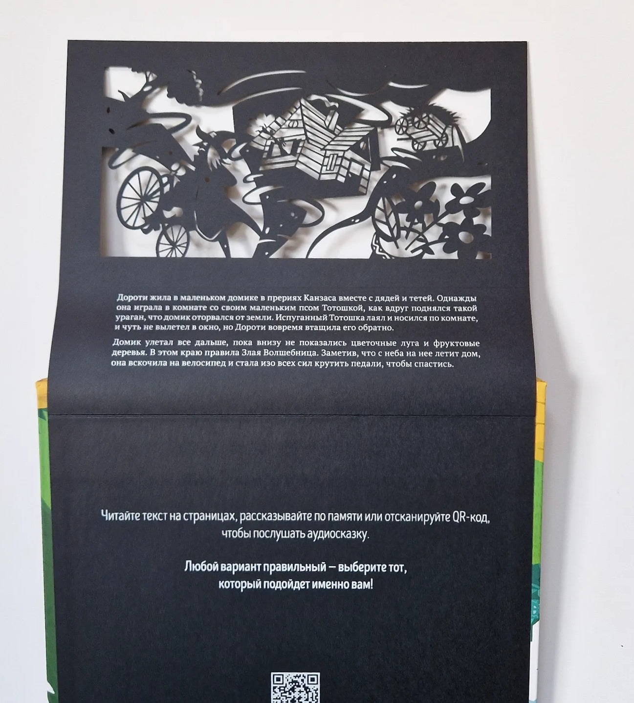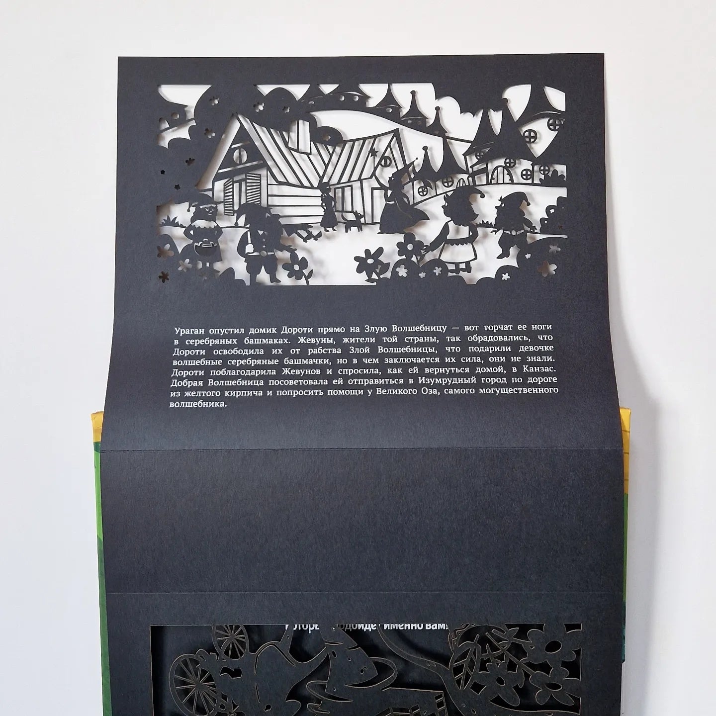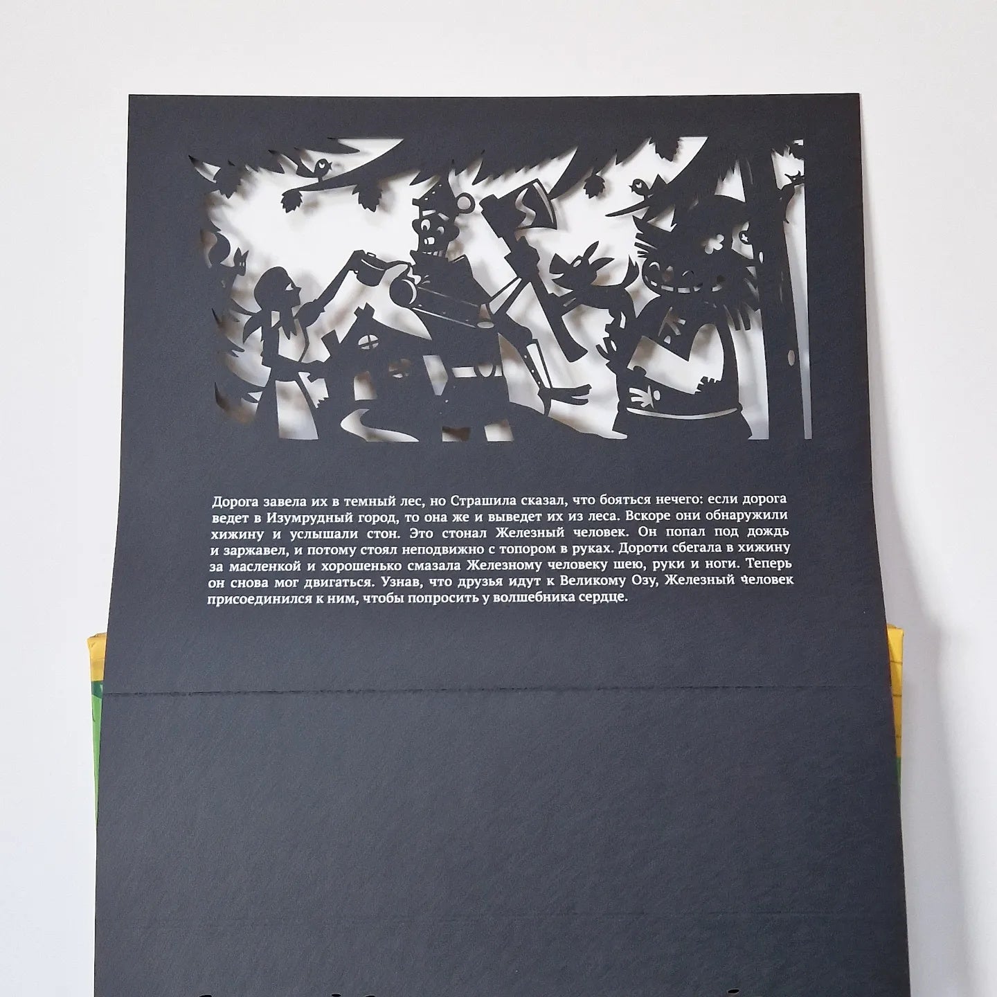 В книге 9 страниц с вырезанными лазером иллюстрациями с текстом под ними, которые подробно раскрывают сюжет сказки.