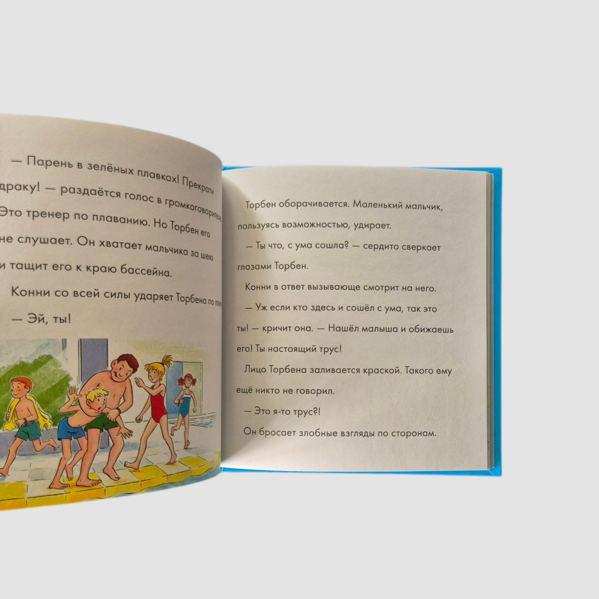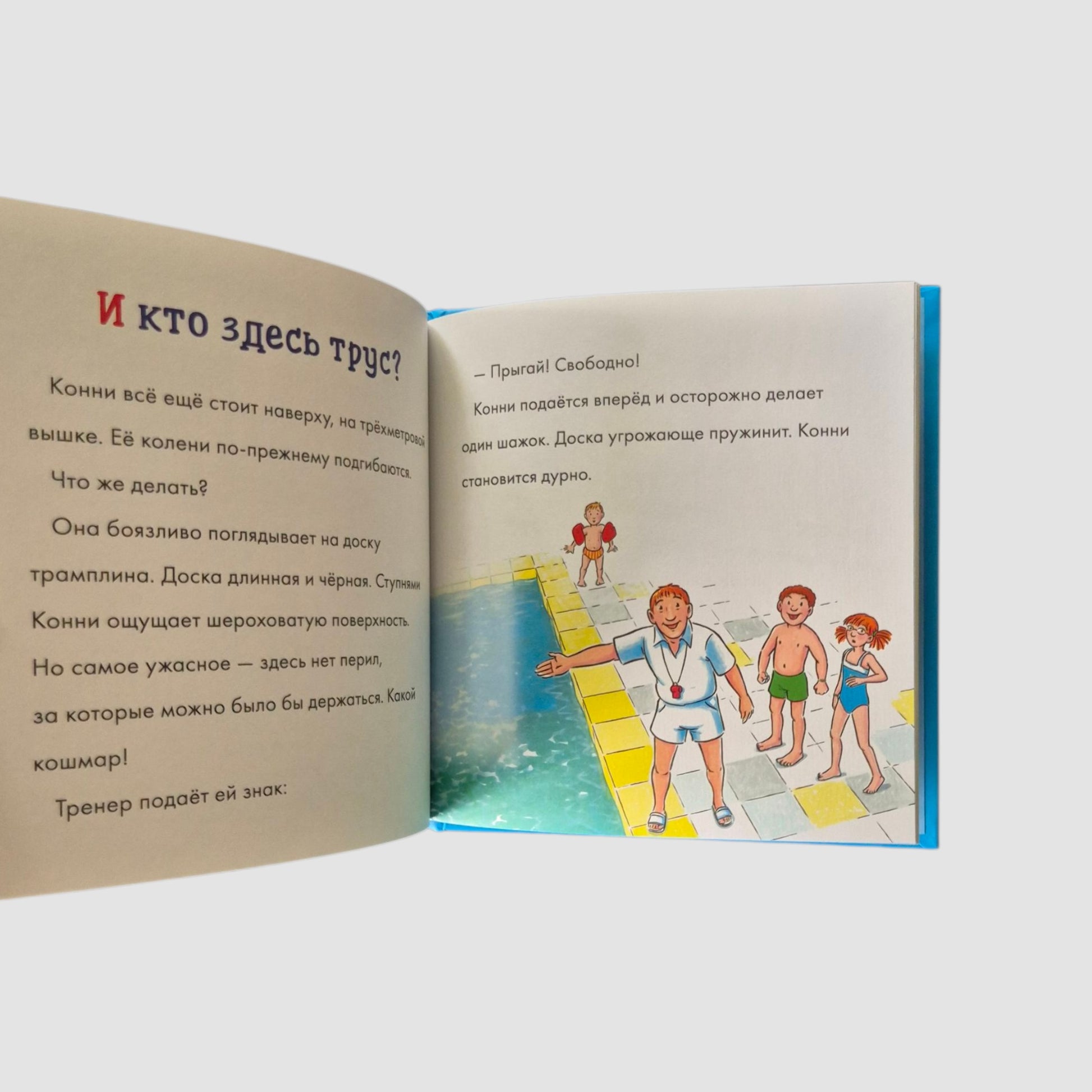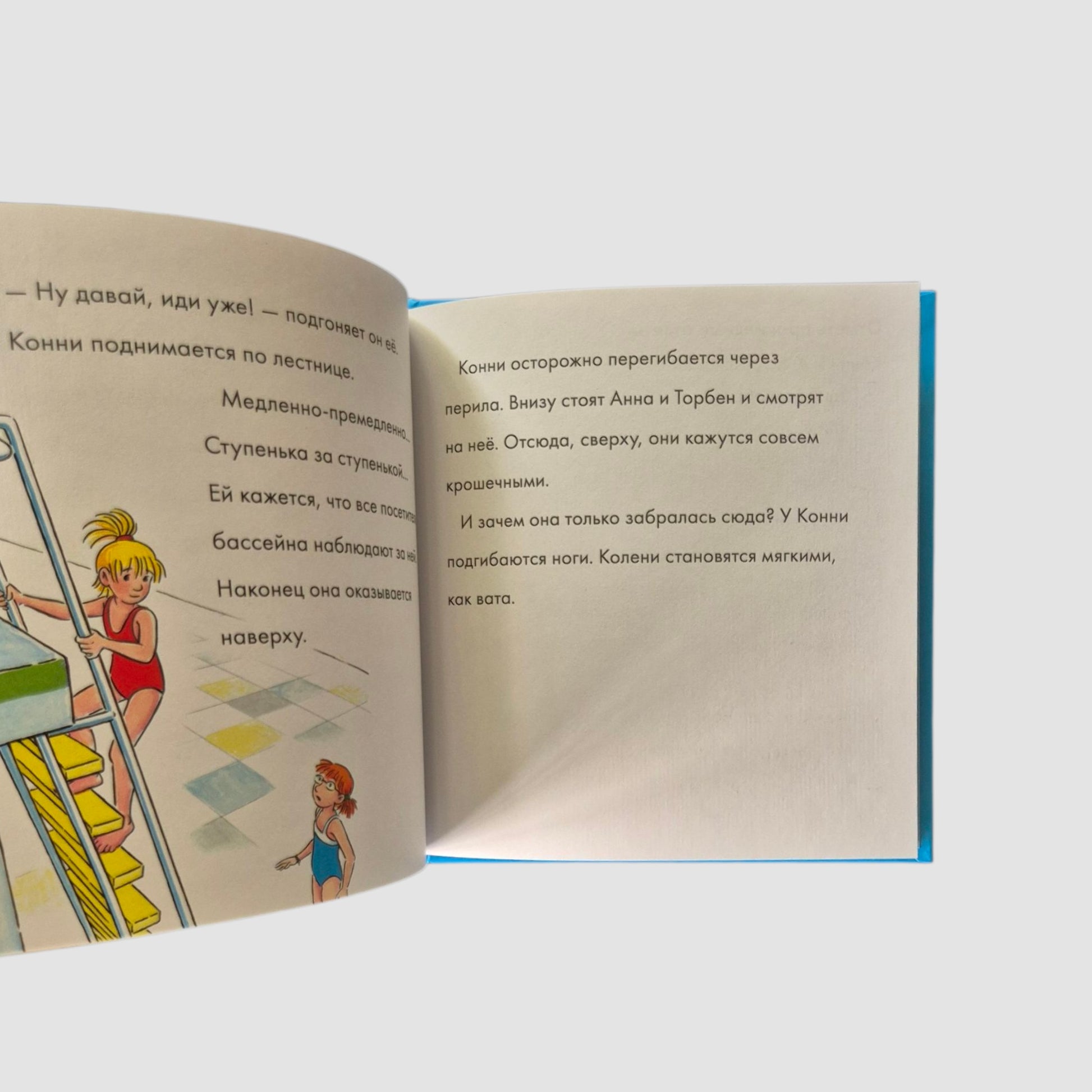 Конни вместе с Анной отправляются в бассейн. Там они встречают одноклассника, задиру Торбена. Он насмехается над Конни и называет её трусихой, ведь она никогда не прыгала с трёхметровой вышки. Сможет ли Конни найти в себе смелость и отвагу, чтобы доказать себе и другим, что она ничего не боится? Присоединяйтесь к любимой героине, выполняйте задания и узнайте правила безопасного поведения в бассейне!