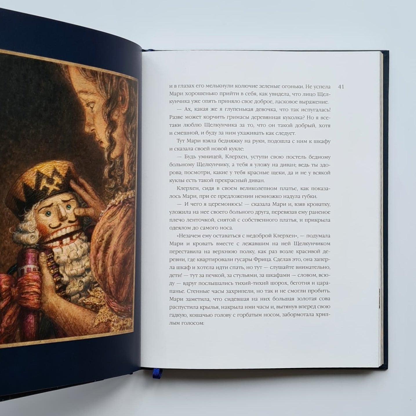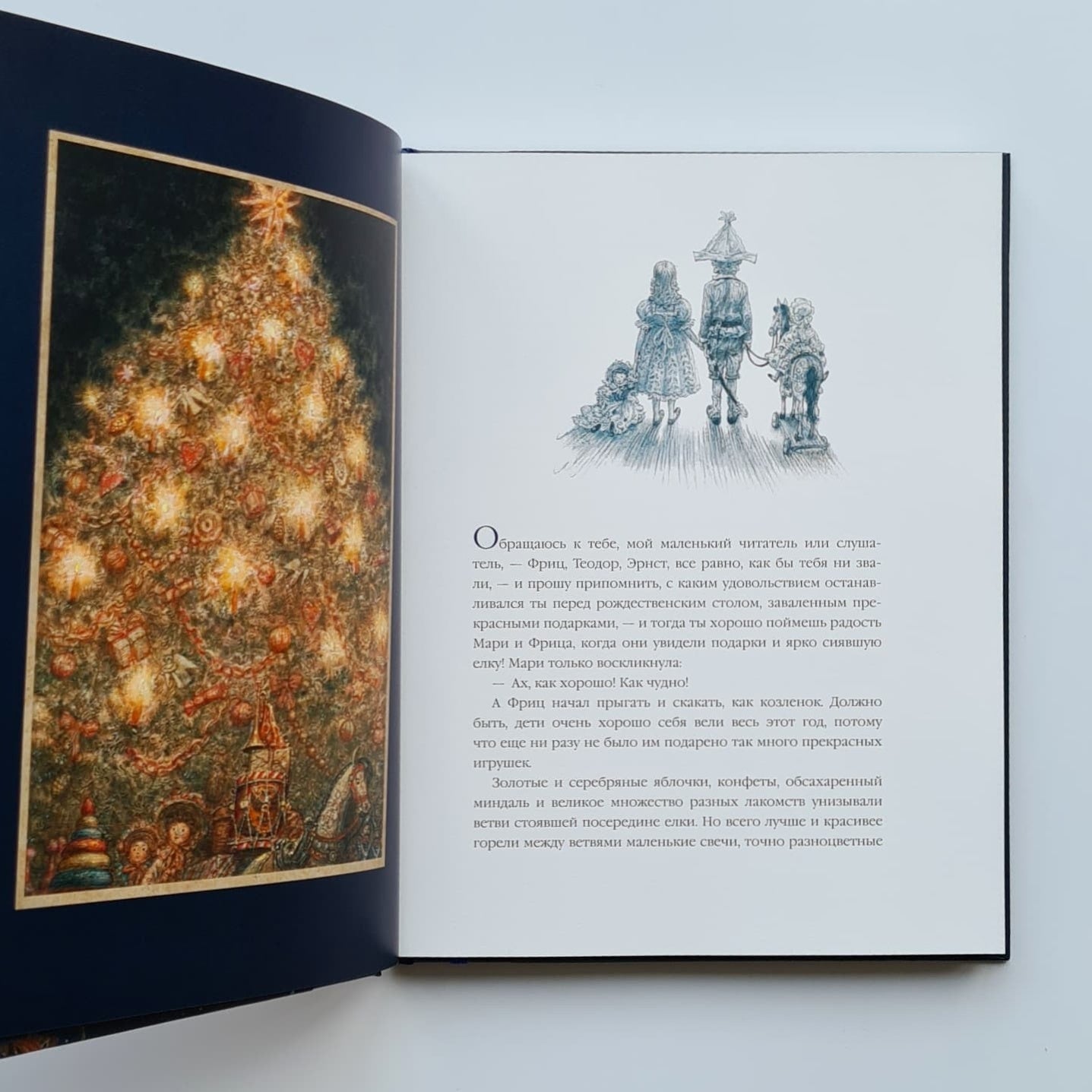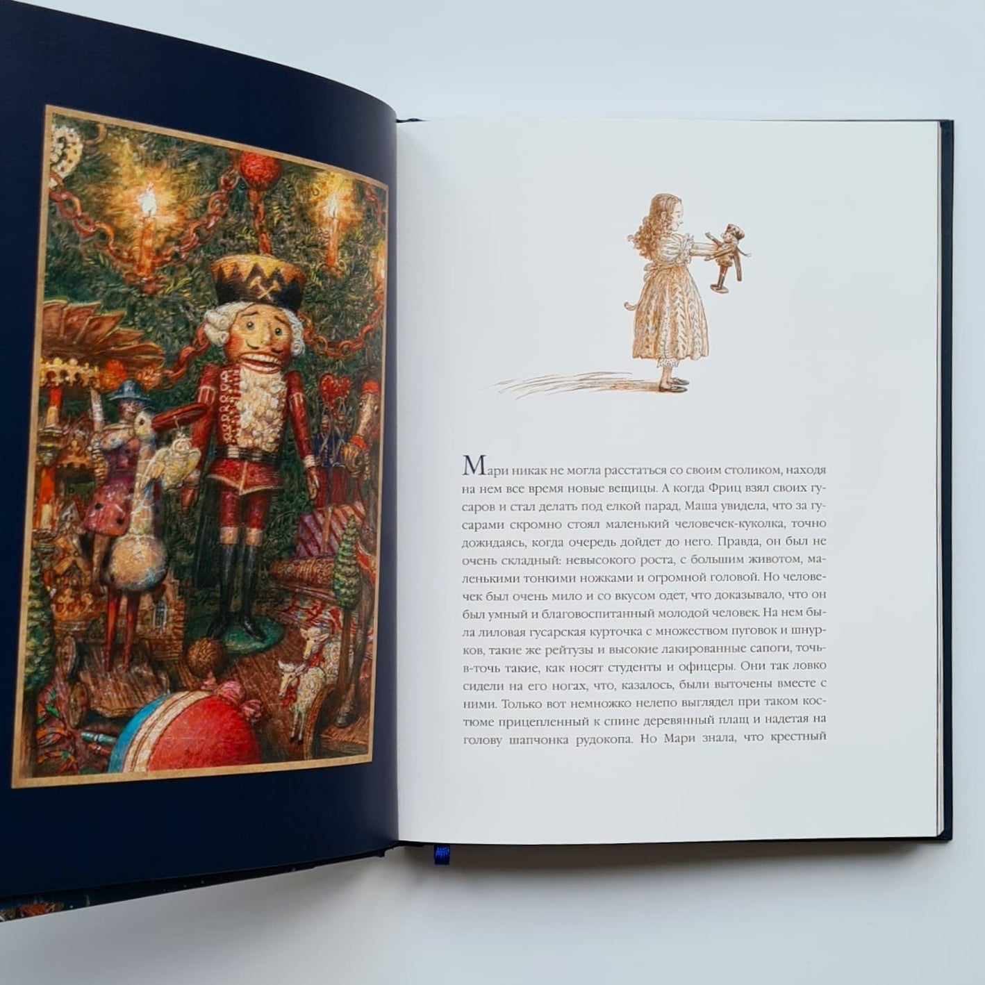 Два века назад увидела свет чудесная рождественская сказка о девочке Мари, ее кукле Щелкунчике и коварном мышином короле. Для детей «Щелкунчик» — это повесть о прекрасном принце и волшебной стране, для взрослых — история взросления. За два столетия краски гофмановской истории ничуть не потускнели, и книга, которую вы держите в руках, — ярчайшее тому подтверждение. Добрая и преданная Мари, чудаковатый крестный Дроссельмейер, доблестный Щелкунчик и гадкий мышиный король — все они обретают новую жизнь, подаренную им талантливым иллюстратором Антоном Ломаевым. Золотистое пламя рождественских свечей и бархатистые зимние сумерки, фантастические наряды, кружащиеся снежинки, симпатичные и мрачноватые лица, множество крошечных деталей, создающих мистическую и праздничную атмосферу, — эти иллюстрации завораживают, и от них невозможно отвести взгляд. Неповторимый и узнаваемый стиль Антона Ломаева словно создан для великого немецкого романтика — фантазия художника, сплетаясь с фантазией автора, рождает новое произведение, одинаково близкое и детям, и взрослым.