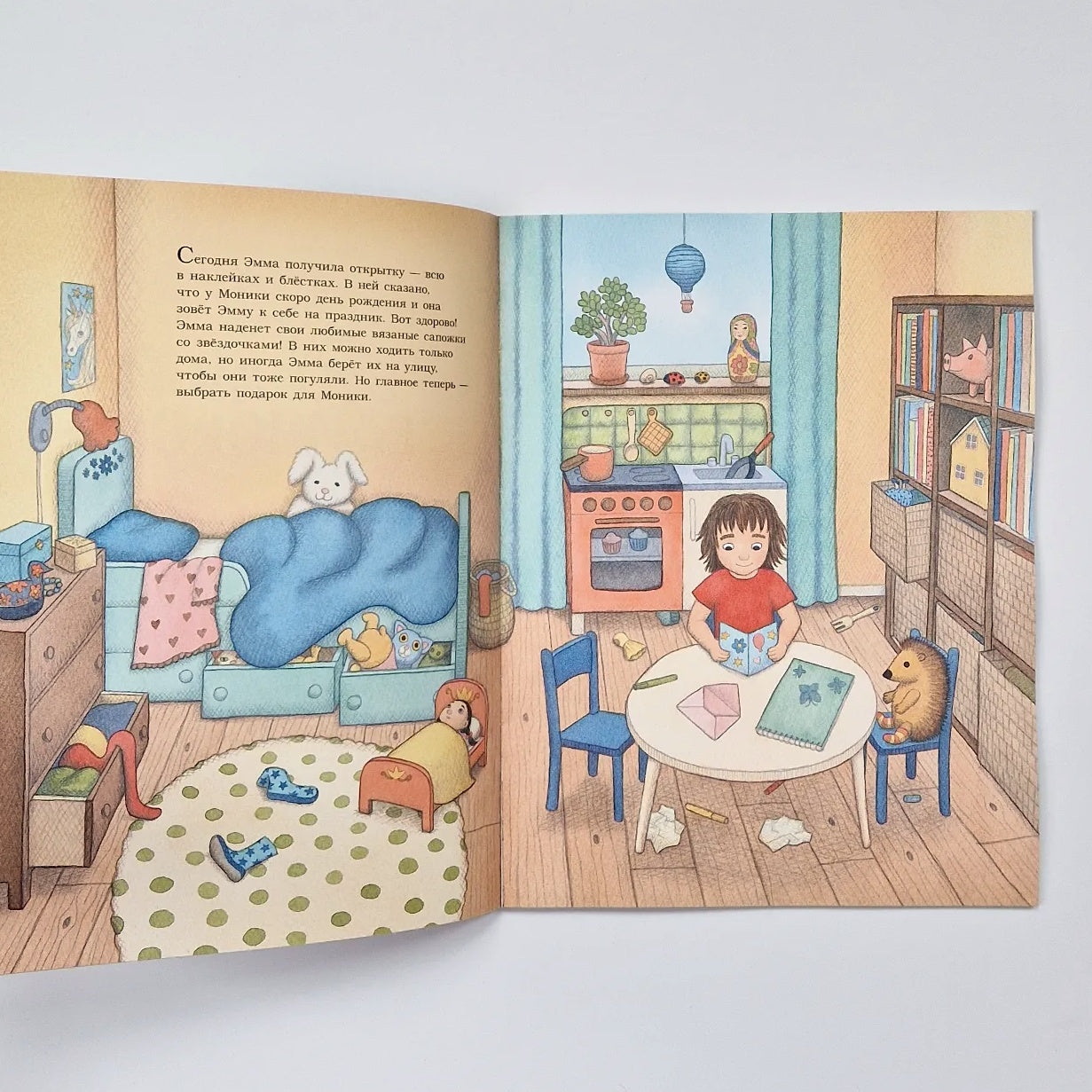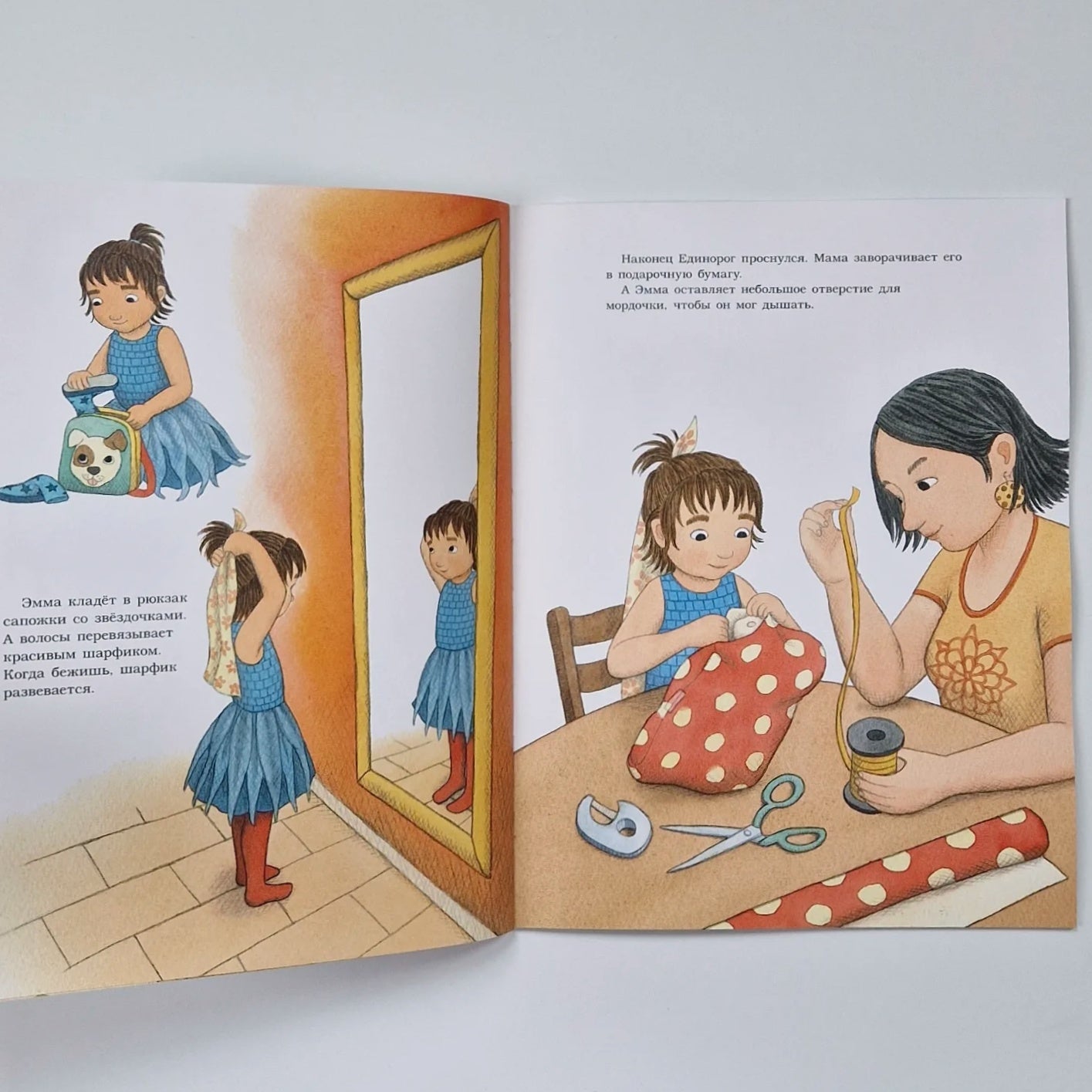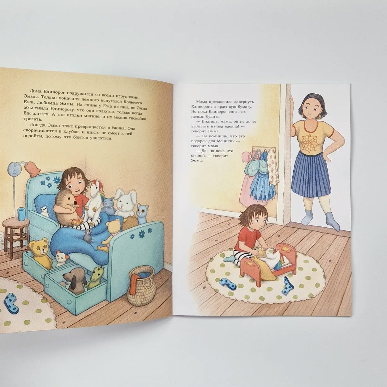 Эмма собирается на день рождения к Монике, своей лучшей подруге. В магазине игрушек она выбирает самое лучшее, что там есть, – Единорога. У него разноцветный хвост, и он улыбнулся, когда Эмма его пощекотала. Моника тоже смеется, когда ей щекотно. Вот она обрадуется этому подарку! Однако в гостях Эмма понимает, что просто не в силах расстаться с Единорогом, ведь он такой необыкновенный и уже успел подружиться с ее плюшевыми зверями. А у Моники и без него куча подарков. Она хватает Единорога и убегает с ним в детскую. Остальные бегут за ней, отнимают сверток и уходят веселиться дальше. А Эмма забирается в домик Моники и сжимается в комок, как ежик. На спине у нее иголки – никто не сможет ее погладить. Хотя гладить ее теперь никто и не захочет, потому что она воровка. Тут Моникин папа зовет Эмму играть в рыбалку. Ей и боязно, и хочется обратно к детям. И наконец она решается и идет. А потом все получают сладкие подарки и много смеются. А когда гости разошлись, подружки поднимаются в комнату Моники и угощают конфетами ее плюшевых зверей. И Эмма понимает, что Единорогу здесь нравится.