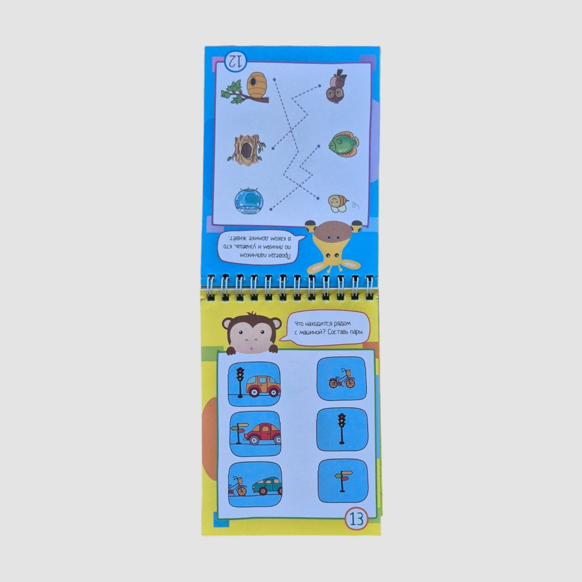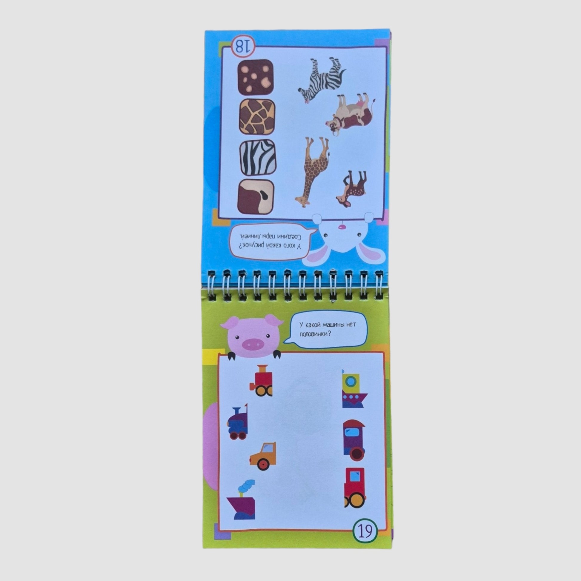 Открыв этот блокнот, ребёнок попадёт в волшебную страну, где нужно применить смекалку. Он будет искать спрятавшихся животных, соединять половинки, подбирать фрагменты рисунков, рассматривать рисунки облаков, придумывать названия картинок. А в дороге или на отдыхе такой блокнот будет просто незаменим.
