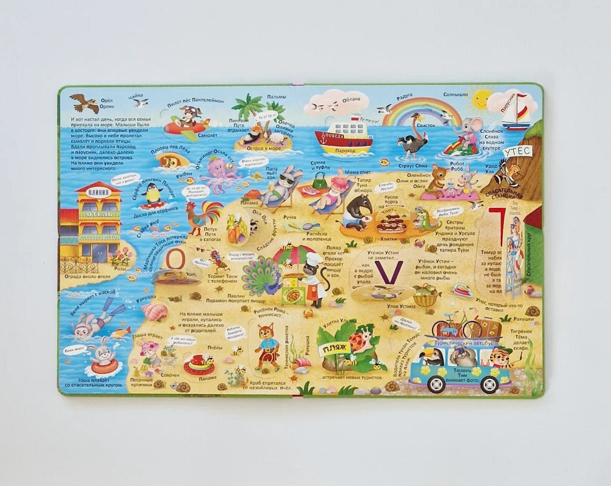 На 8 красочных тематических разворотах (дом, деревня, парк развлечений, город, пляж и другие), посвященных изучению букв и простых слогов, можно долго и с увлечением разглядывать забавные картинки и читать подписи к ним.