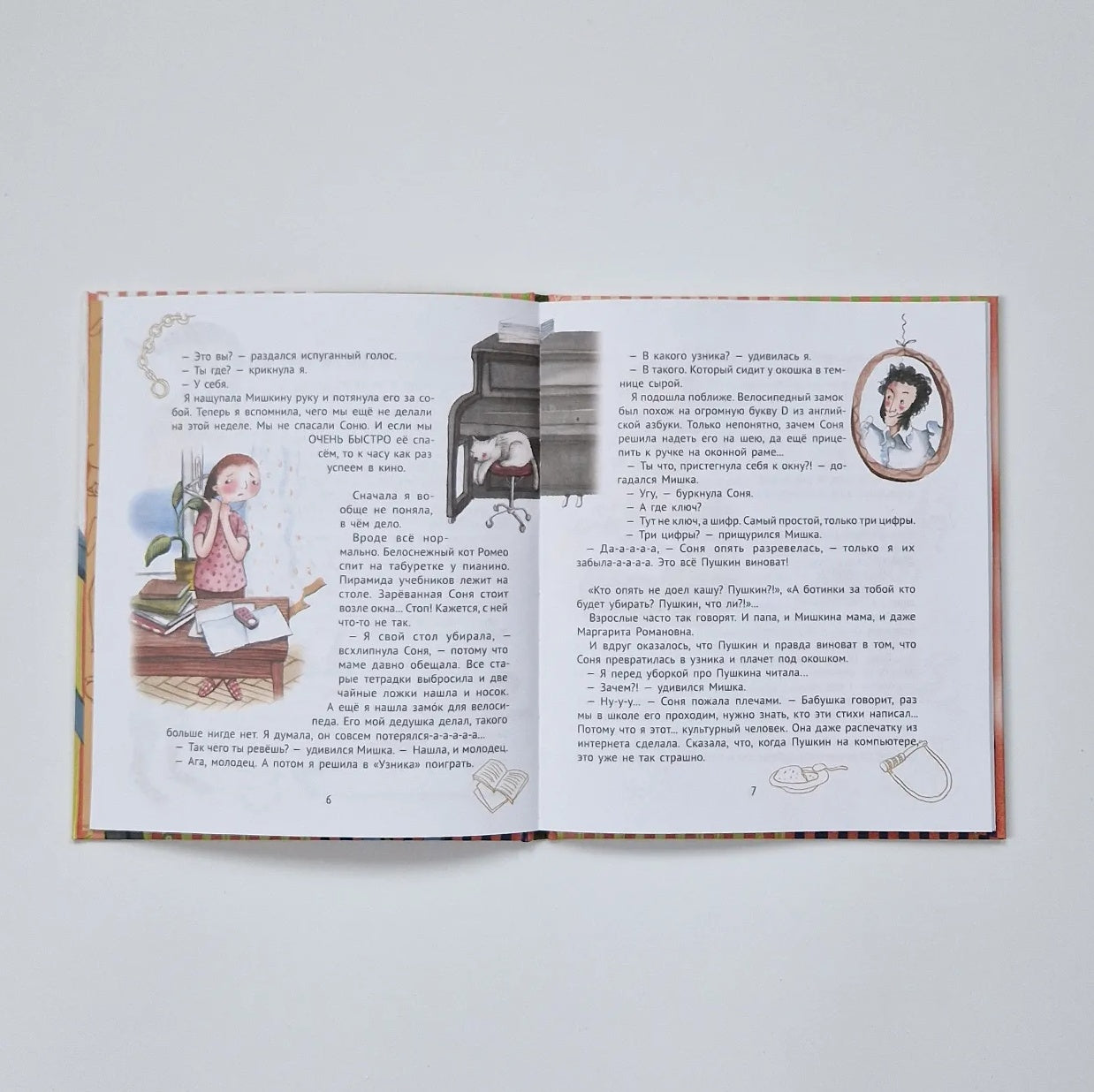 В десятой книге "Пушкин и компания" Женя и её друзья узнают много нового о… Пушкине! Да-да, о том самом, об Александре Сергеевиче. "Сколько можно про Пушкина, про него ведь всё давно известно!" - скажете вы. А вот и нет! И Соня, правнучка пушкиниста, знает о нём то, что неизвестно практически никому. Вот вы, например, знали, что во времена Пушкина были не лайки, как в "Фейсбуке", а лайковые перчатки? А что Пушкин, когда у него пропадало вдохновение, шёл на кухню и готовил майонез? А что он грязное окно носком протирал, чтобы разглядеть природу? Вот именно, не знали! А Соня знает про Пушкина ВСЁ. Как-то раз она даже решила в "Узника" поиграть. Взяла старый велосипедный замок, пристегнула себя к окну, набрала шифр… А потом его забыла! И как теперь быть? Ведь Соне срочно нужно сделать семь добрых дел для мамы и написать об этом целое сочинение. Как же открыть замок? Хорошо, что у Сони есть друзья! Жене и Мишке предстоит разгадать шифр, который, конечно, тоже про Пушкина - заветные три цифры из его жизни…