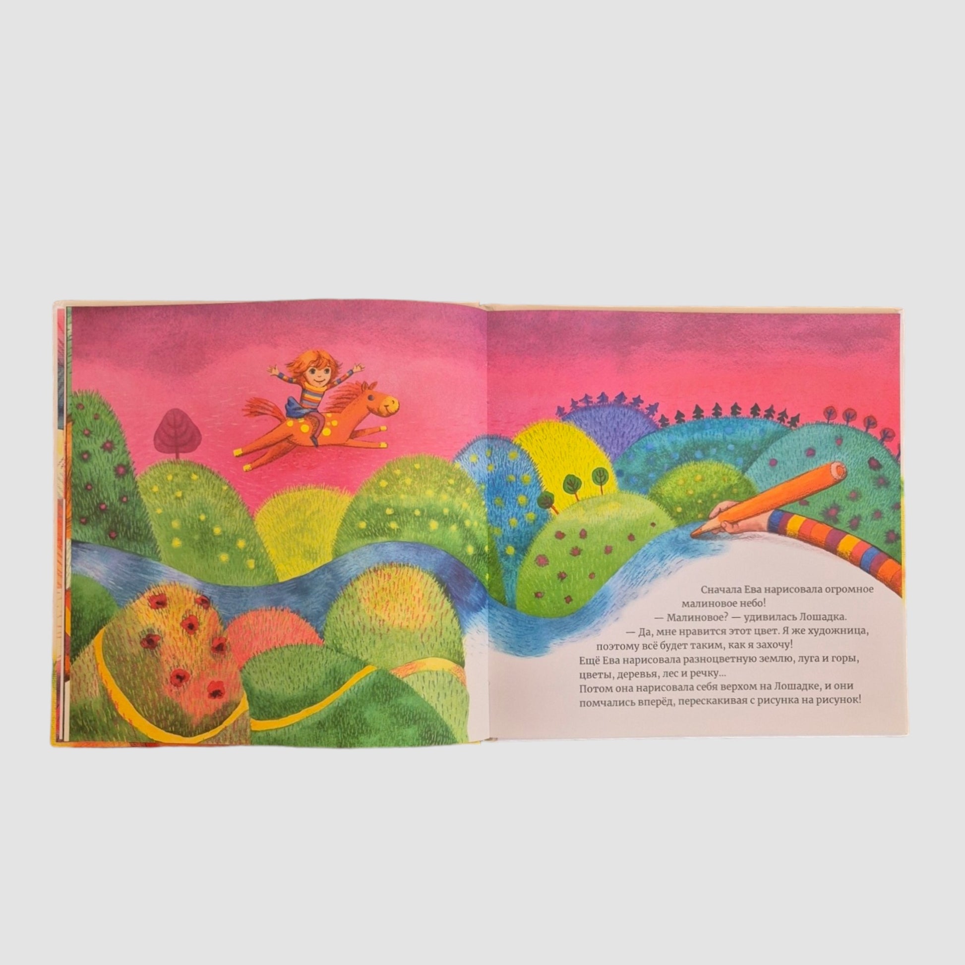 Ева рисует свой чудесный мир и не боится отправляться навстречу приключениям. Они с Лошадкой увидят много интересного, встретят новых друзей, кому-то помогут вернуться домой, а кому-то помириться. А потом отыщут дорогу через тёмный лес, ведь если у тебя есть жёлтый карандаш, то ты можешь нарисовать луну.