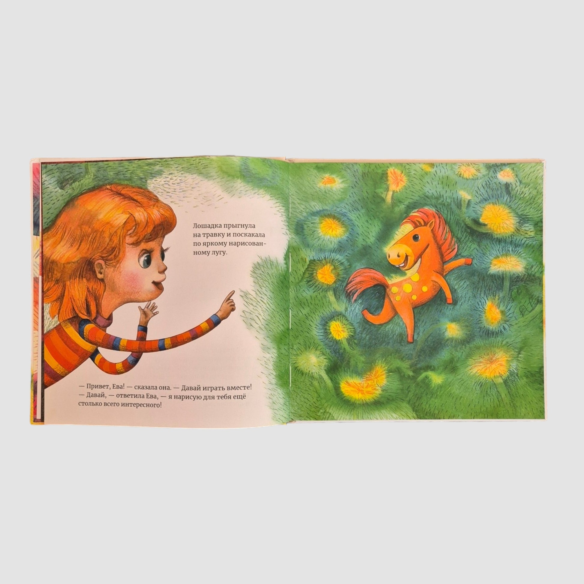 - Ого! - удивилась Ева и нарисовала для Лошадки зелёную травку с жёлтыми цветочками.