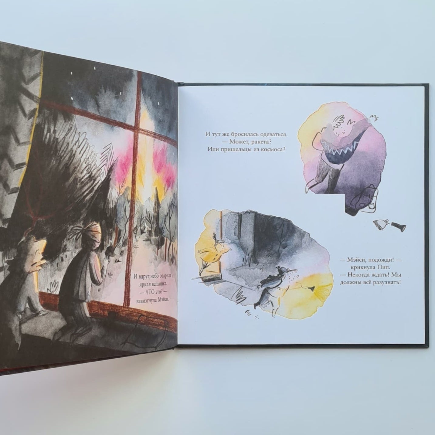 Когда небо над лесом внезапно озаряется яркой вспышкой, Мэйси не может поверить своей удаче — наконец-то она отправится в приключение! Пип ещё не успела допить горячий шоколад, а Мэйси уже натянула сапоги и достала фонарик.