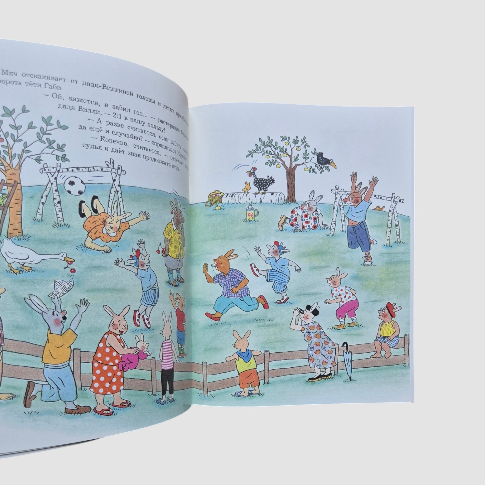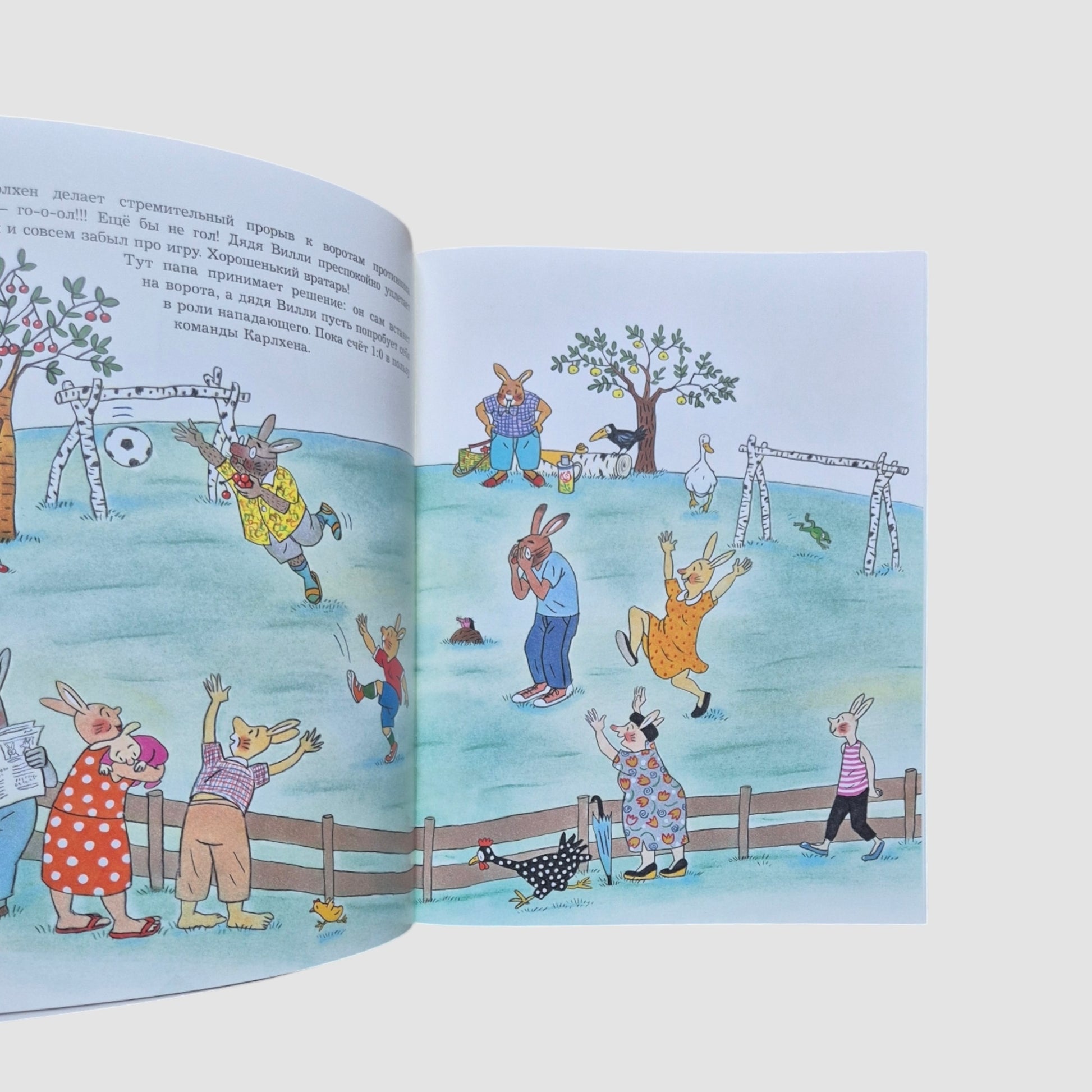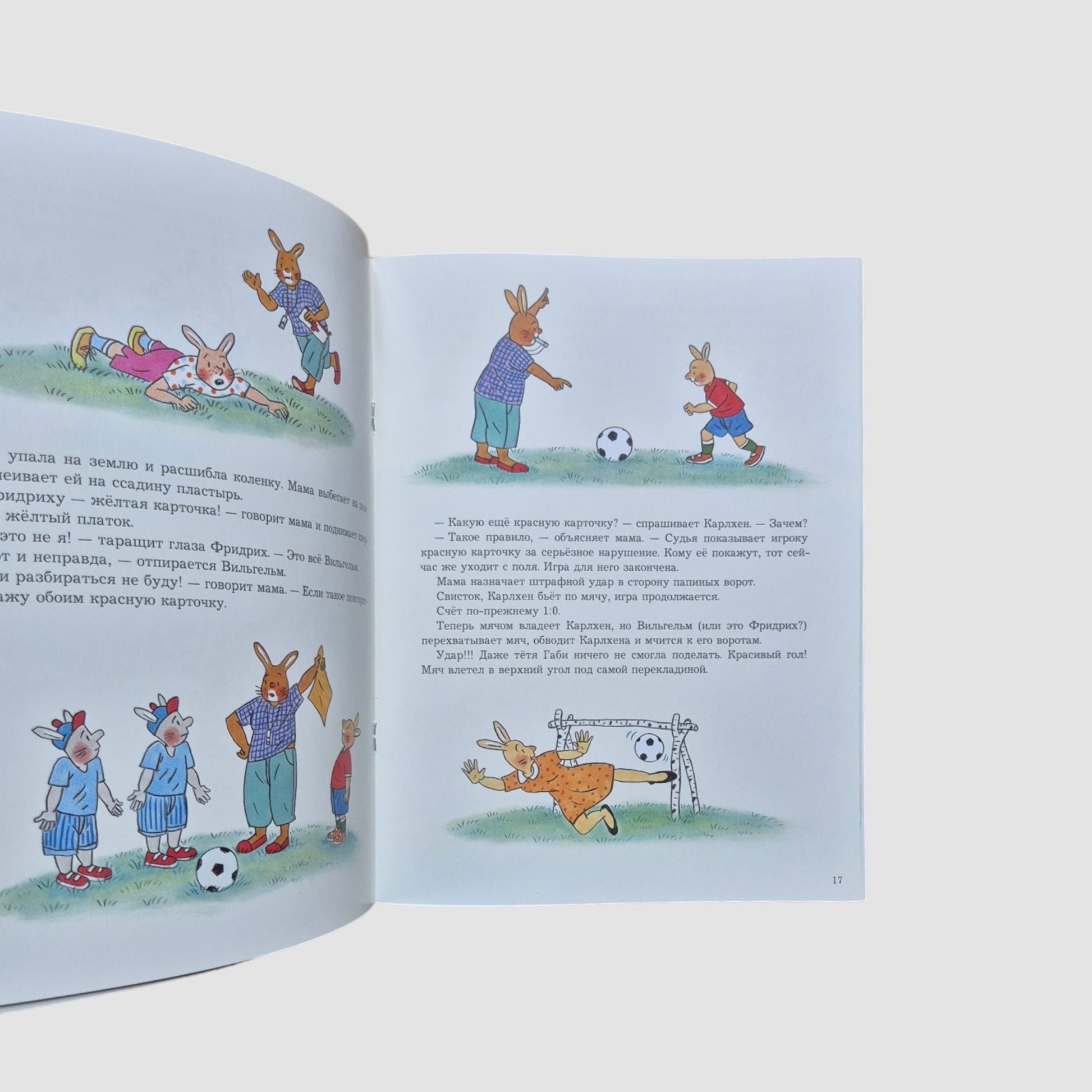 В воскресенье после обеда зайчонок Карлхен вместе с папой играют в футбол на лужайке за бабушкиным домом. Постепенно к ним присоединяются дядя Вилли и тётя Габи, кузина Кэти, близнецы Фридрих и Вильгельм и даже сама бабушка. Игроки показывают высший класс, а мама-судья строго следит за тем, чтобы они соблюдали правила. Напряжённый матч заканчивается победой обеих команд, после чего все отправляются пить какао с тортом!