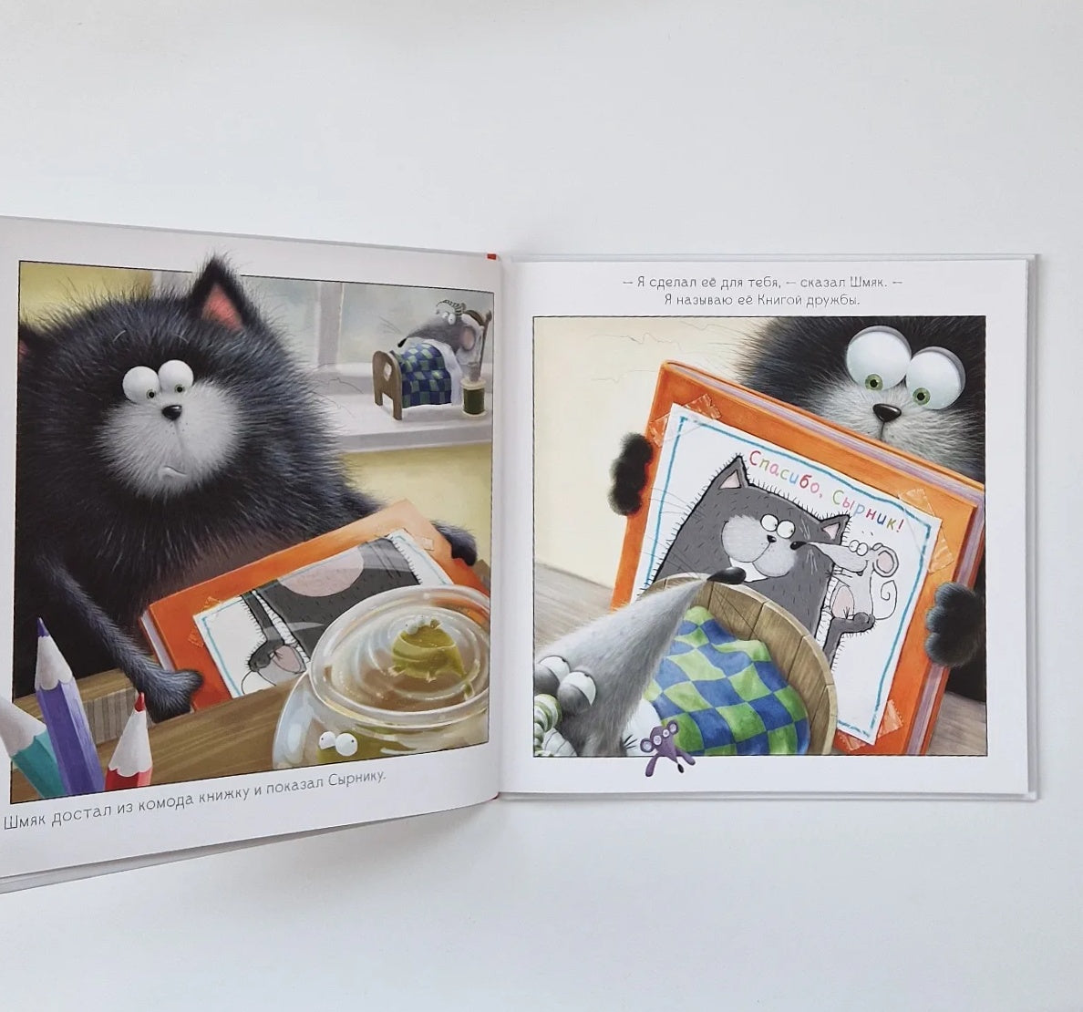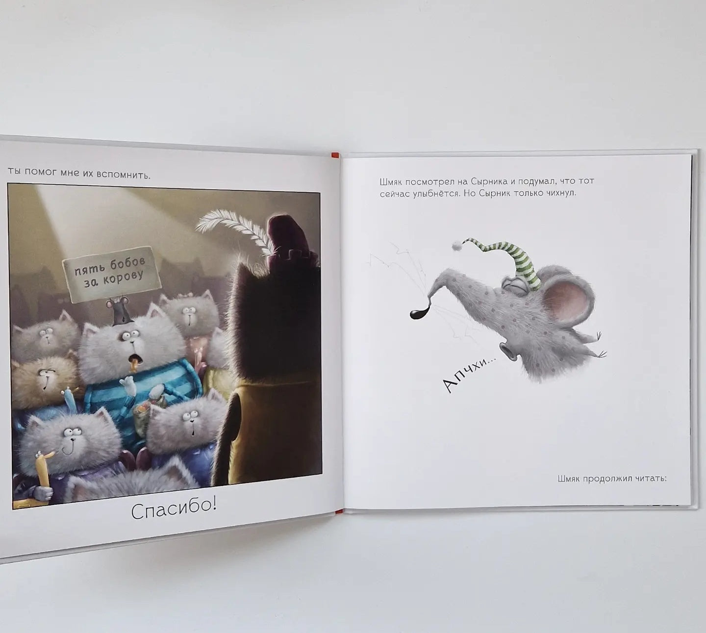 Что делать, когда твой друг болен и приуныл? Чтобы развеселить своего питомца мышонка Сырника, котёнок Шмяк нарисовал целую книгу дружбы. В ней Шмяк говорит Сырнику спасибо. За что? За то, что Сырник - самый лучший на свете друг!